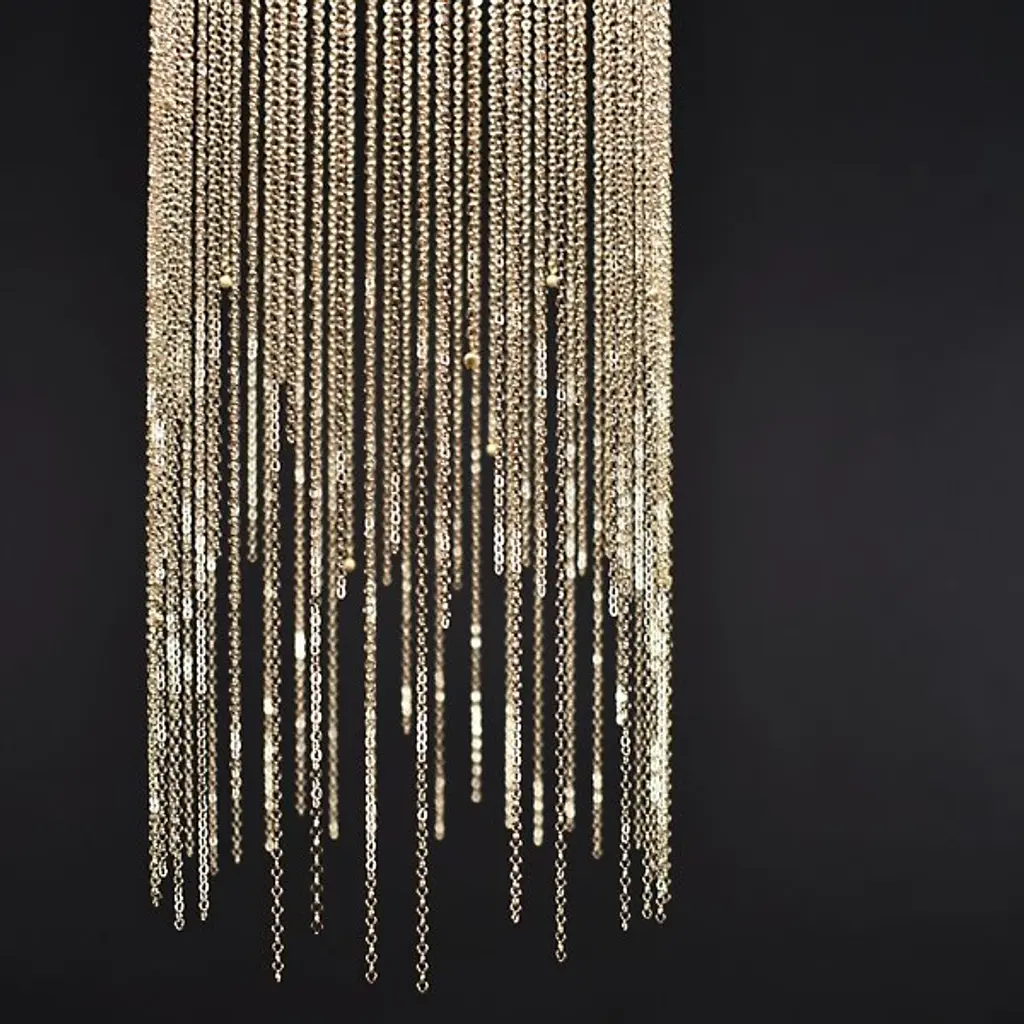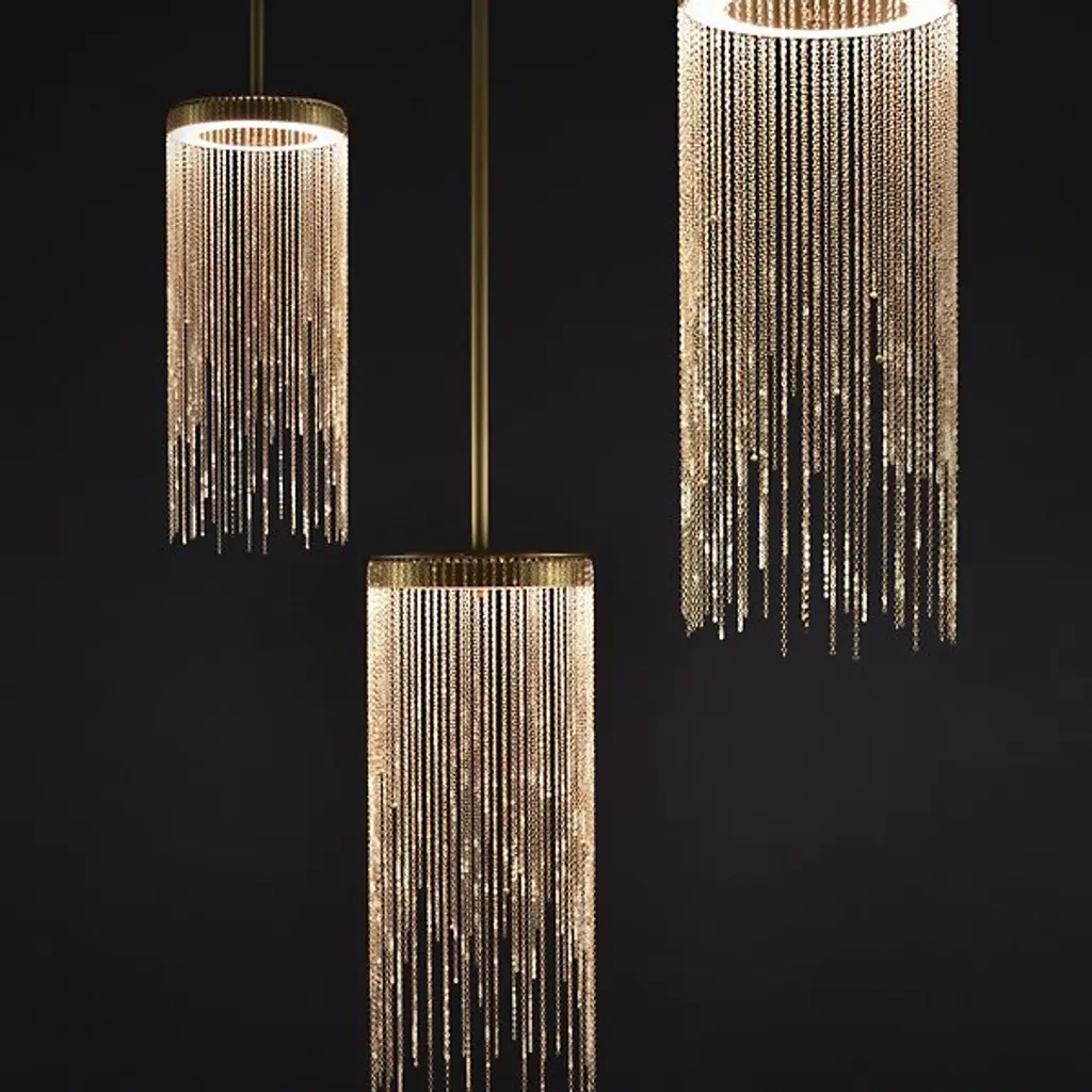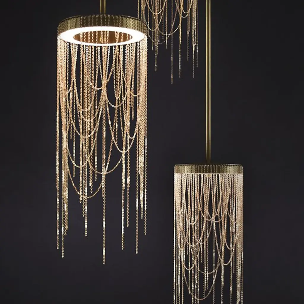 The Otero XS LED Mini Pendant from Larose Guyon provides a graceful and elegant appeal to inside ceilings, taking pride of place as a gorgeous, angelic presence of famed Parisian beauty Caroline Otéro, called La Belle Otéro, known for her exotic and striking style and love of Jewelry. Evoking the famous creations of jewelers Cartier and Boucheron, its expressive beauty transforms its surroundings, suspending simply from a stepped circle canopy via a slim central stem, placing LED lamping inside two copper rings as a light housing, accompanied by a daring drapery of fine chains that drop at different lengths, forming a curtain around it that glows and glitters with warm downlight.