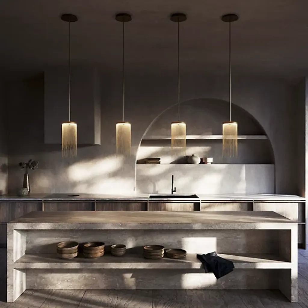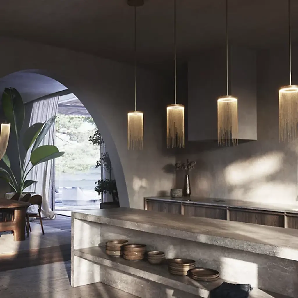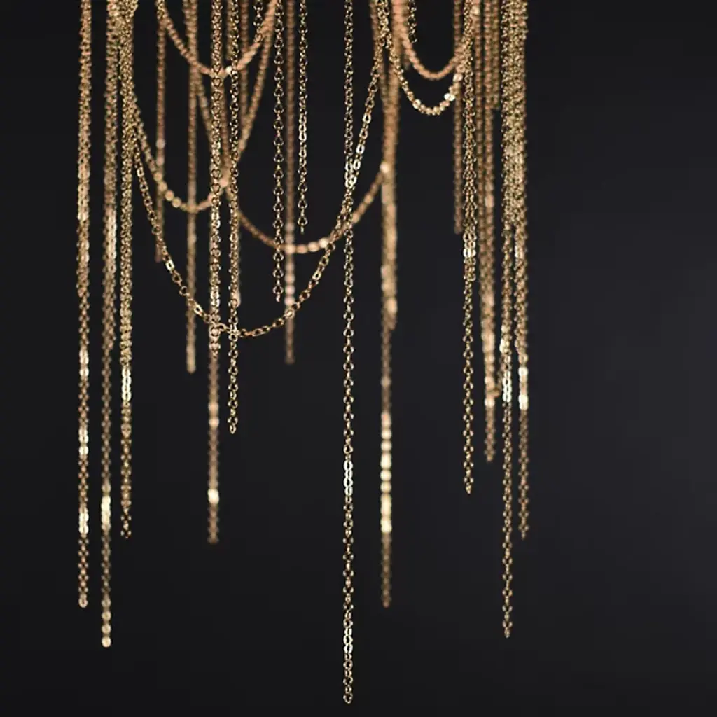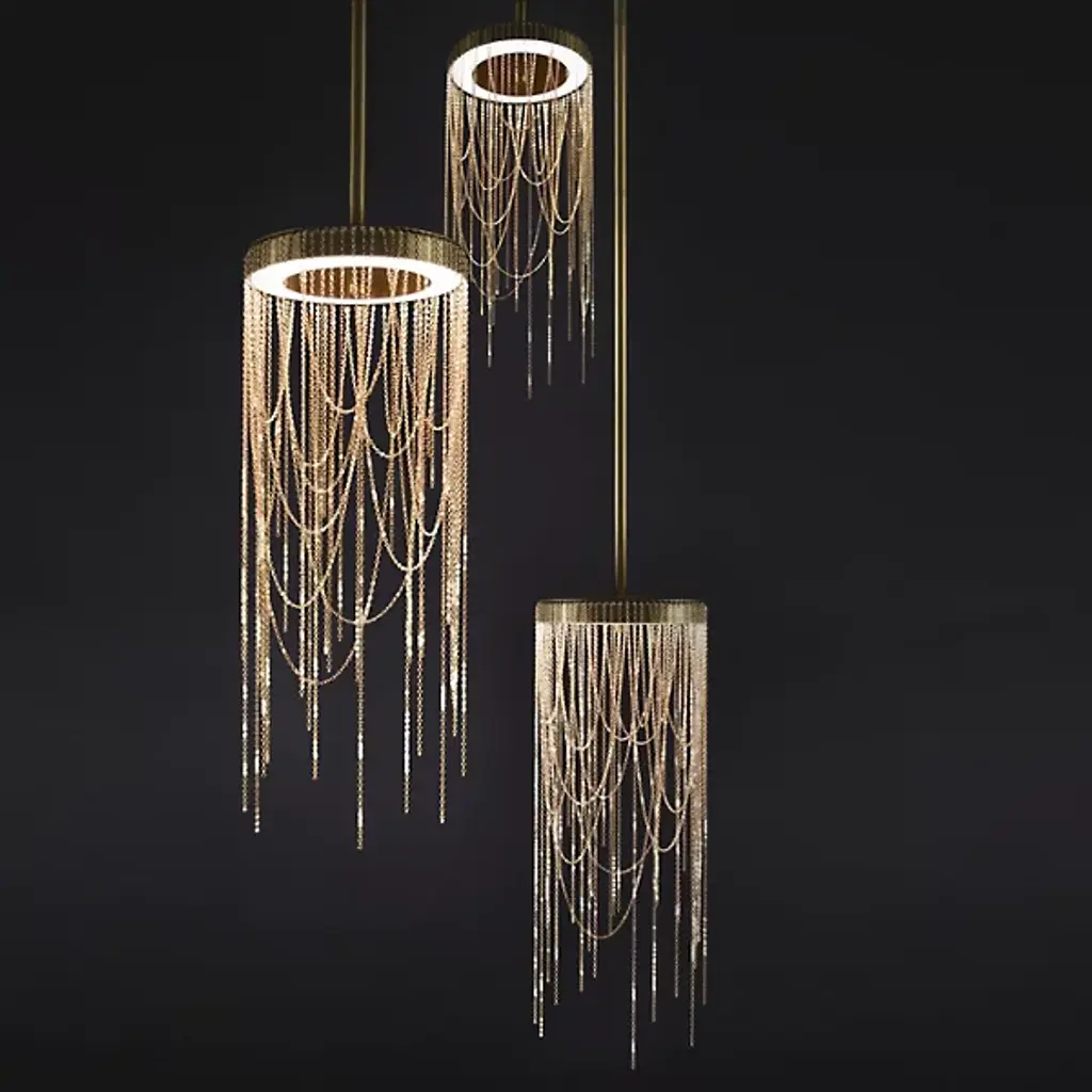 The Otero XS LED Mini Pendant from Larose Guyon provides a graceful and elegant appeal to inside ceilings, taking pride of place as a gorgeous, angelic presence of famed Parisian beauty Caroline Otéro, called La Belle Otéro, known for her exotic and striking style and love of Jewelry. Evoking the famous creations of jewelers Cartier and Boucheron, its expressive beauty transforms its surroundings, suspending simply from a stepped circle canopy via a slim central stem, placing LED lamping inside two copper rings as a light housing, accompanied by a daring drapery of fine chains that drop at different lengths, forming a curtain around it that glows and glitters with warm downlight.