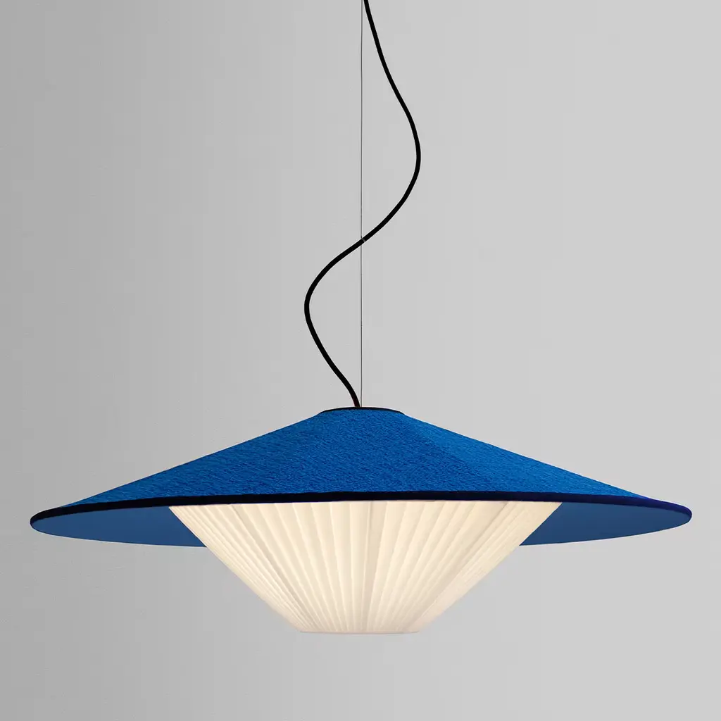 Otto lamp series design echoes the distant sci-fi imaginary of the late 60s and early 70s. It’s inspired by the illustrations of the UFOs era with the very distant universes they used to recall. The lamps are completely hand-sewn. It features an upper lampshade in Dedar fabric and a lower lampshade in pleated pongé bends. It requires 1 x E27 bulb or E26 bulb (not included) and has a black silk-like fabric flex cable, 3 meters long. It is compatible with dimmable systems.