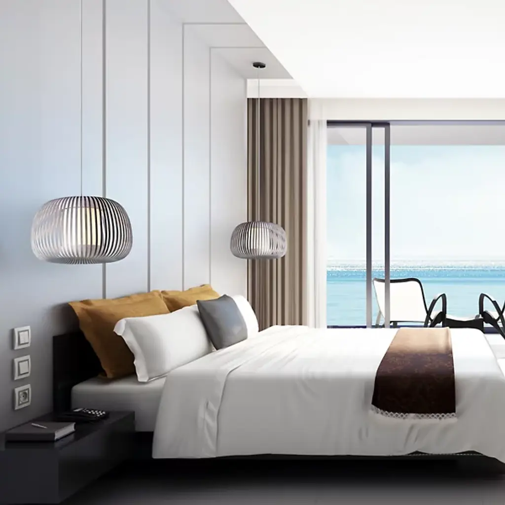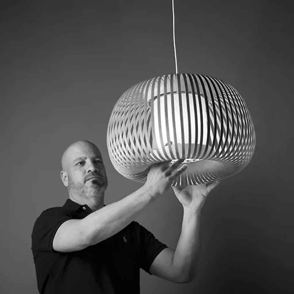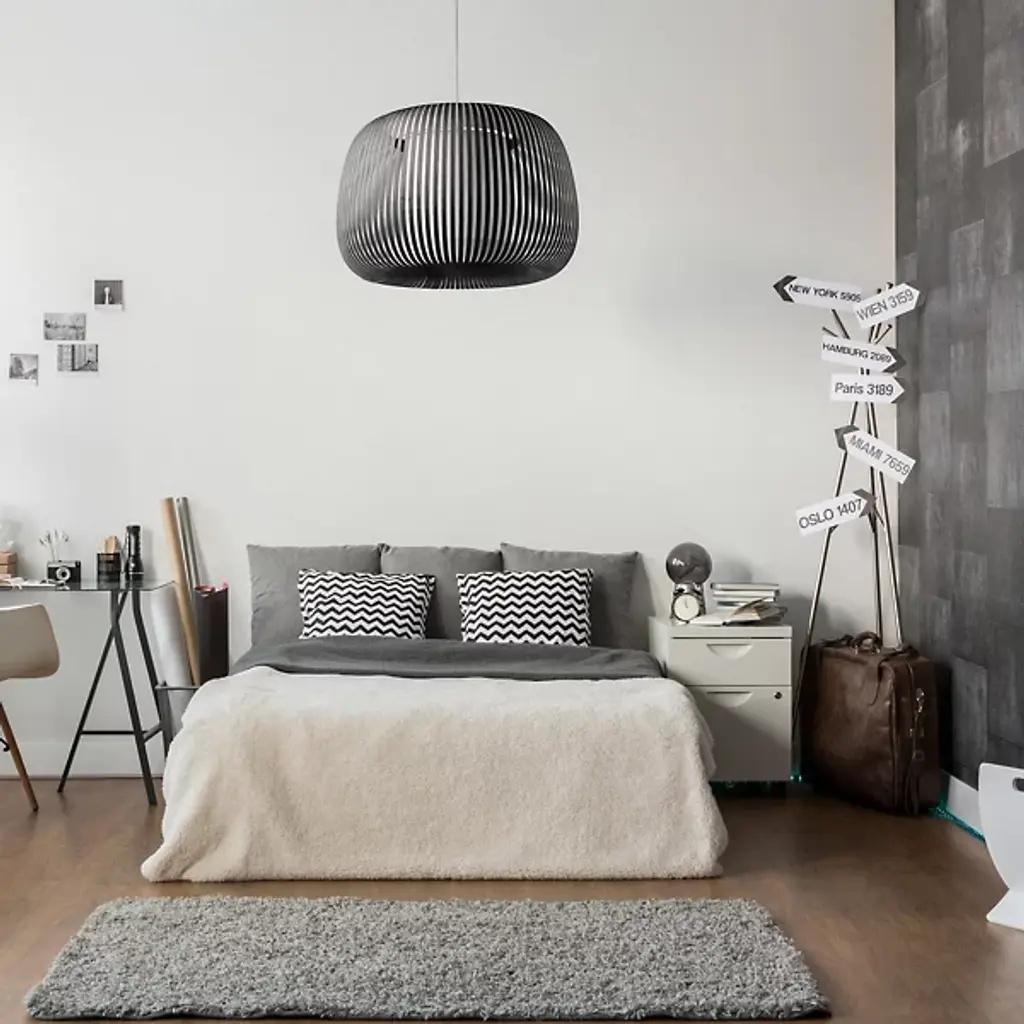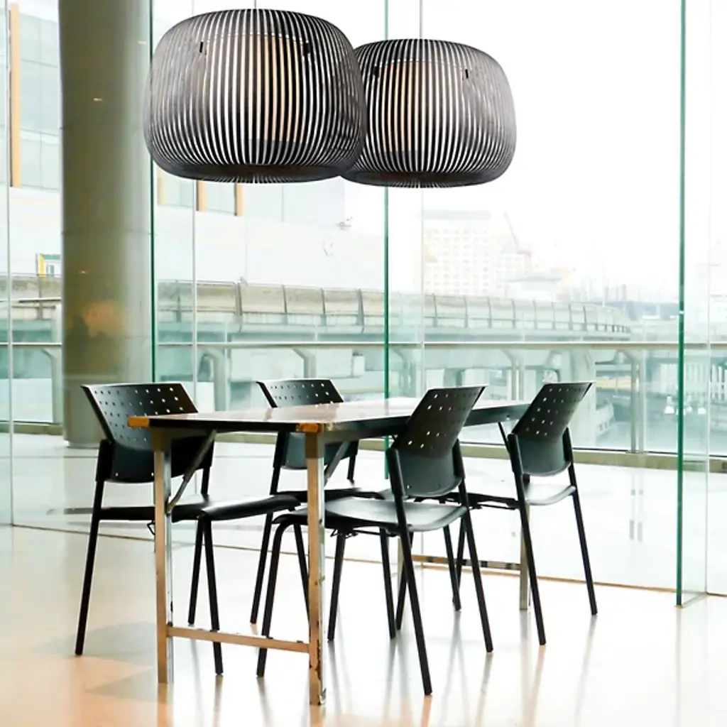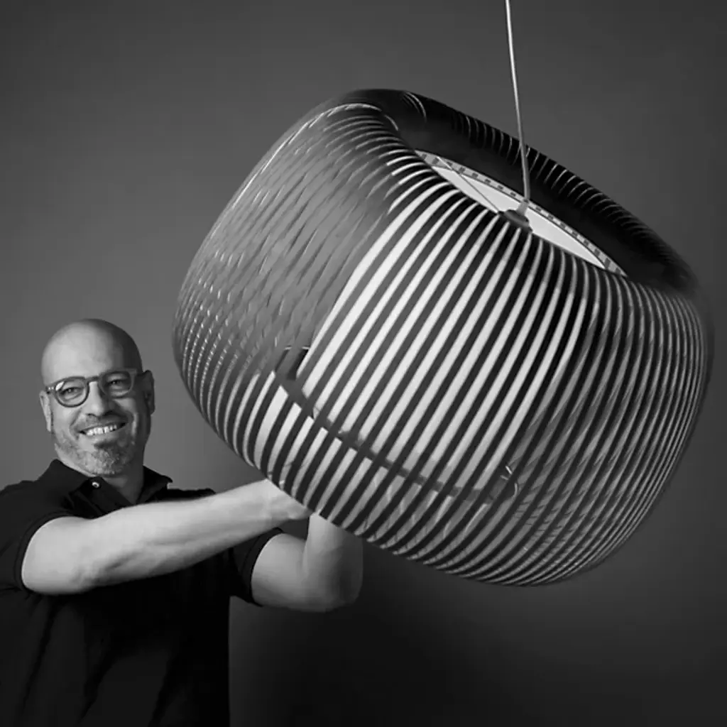 The Ova Pendant from Uplight Group Essentials sends out an easy-going light, one mellowed out by the snazzy stripes of its handcrafted form. Designer Uplight Group's goal is to create accessible, accurate, and reliable pieces. This pendant proves accessible through its familiar round silhouette, one referencing Mid-century lighting classics. Accuracy is key in cutting the strips of French velvet material that make up the hand-arranged shade. These strips circle evenly for an airy, graphic visual that subtly reveals the internal cylindrical diffuser. The light exits vertically through the diffuser and radiates past the fabric strips as a cozy, atmospheric light.