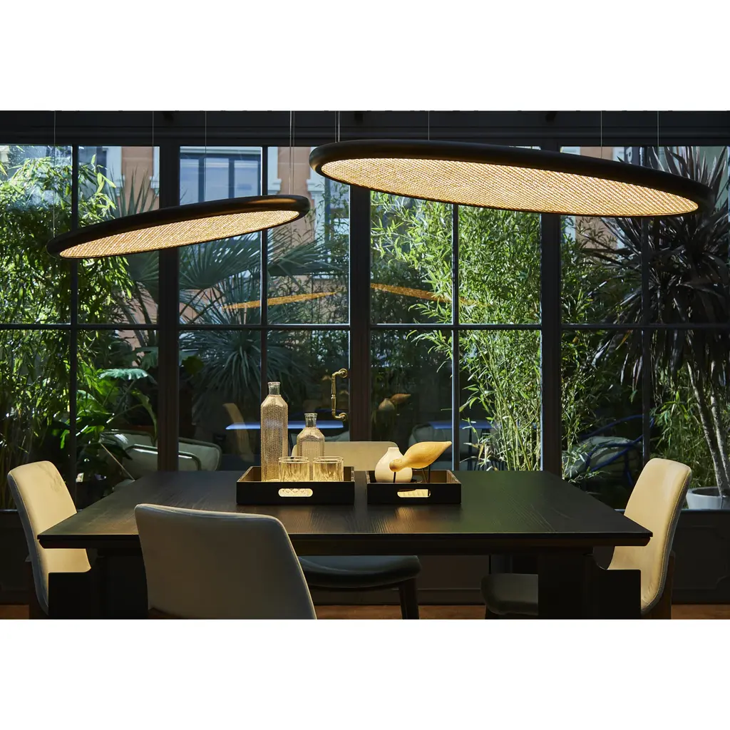 Introducing the Oval Pendant Lamp by Contardi Bogota - a fluid light element that exudes elegance and modernity. The Viennese straw and black lacquered design adds a vintage touch, reminiscent of Brazilian and South American modernist interiors of the 60s and 70s. Elevate any space with this exclusive and contemporary piece.
