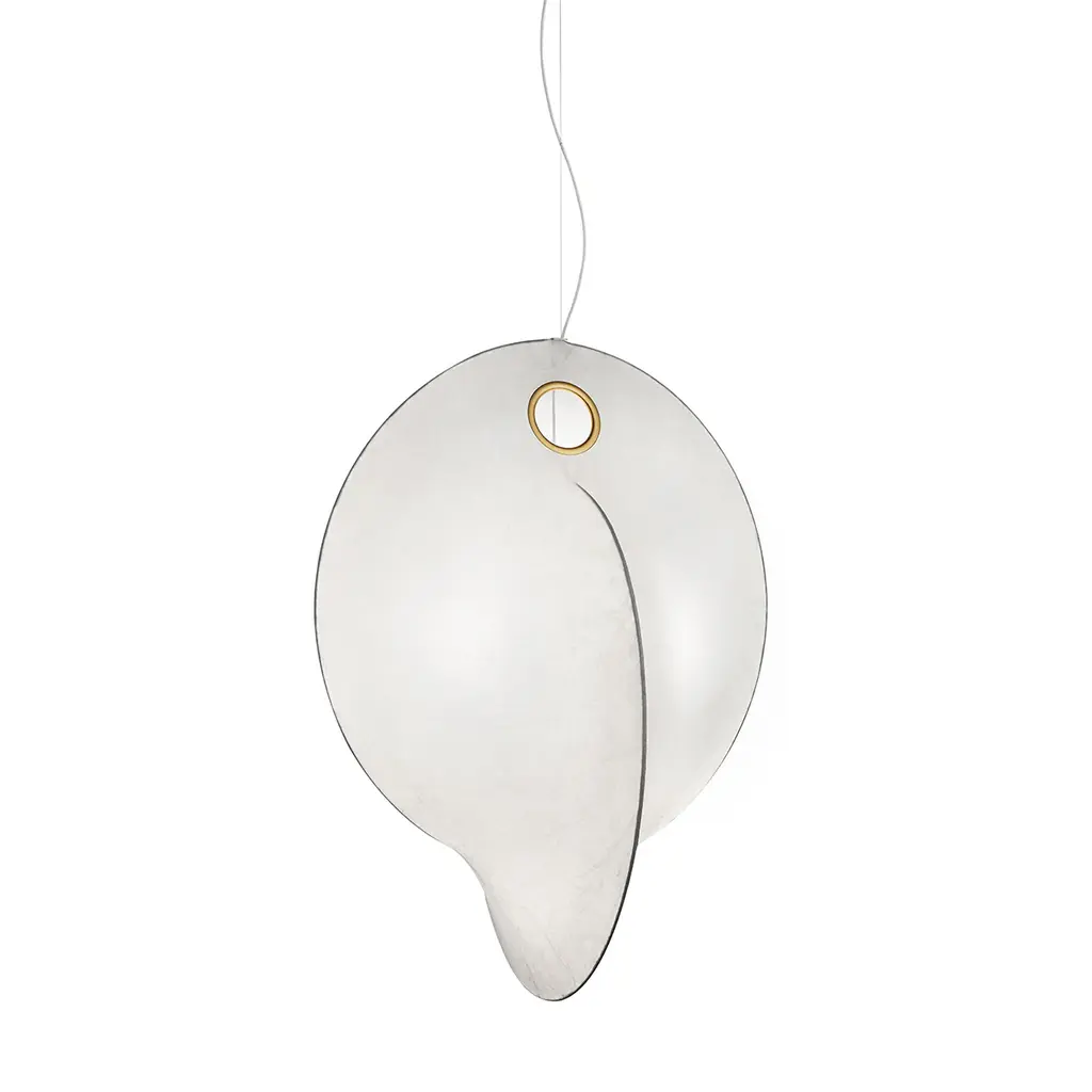 Overlap, a contemporary pendant lamp by FLOS, is Michael Anastassiades’ tribute to the distinct cocoon wrapping technique that the Italian designer lighting company has won several hearts and awards with. This contemporary pendant light is made from steel and cocoon, while its internal structure comprises of white powder painted steel. As the name suggests, Overlap is a modern pendant lamp by Michal Anastassiades that features two interlocking rings which intersect at right angles. This interior suspension lamp is among the latest additions to the designer’s repertoire of modern pendant lighting. Providing soft, diffused light, Overlap manages to amaze and amuse in equal measure. You can see the rings try to push through the membrane, and yet, the space where the two interlock remains concealed – leaving it to your imagination! Features