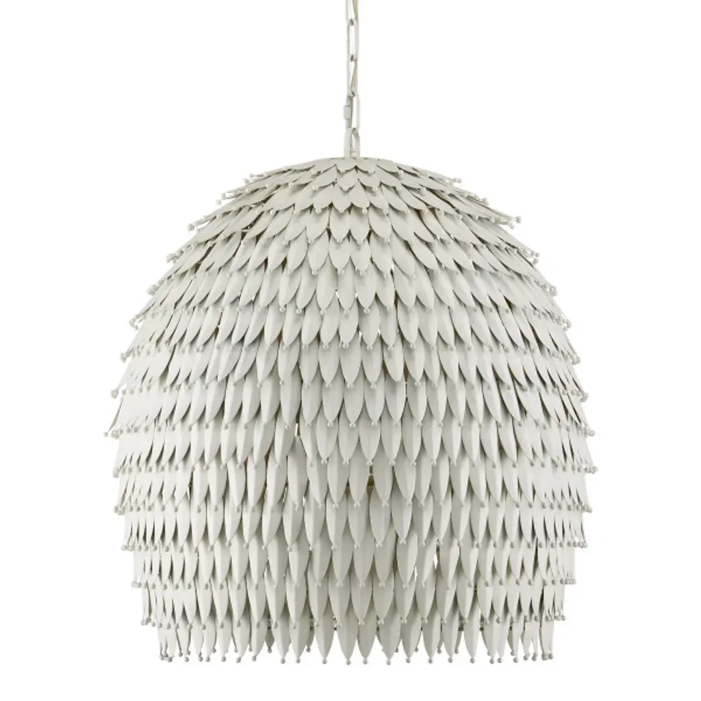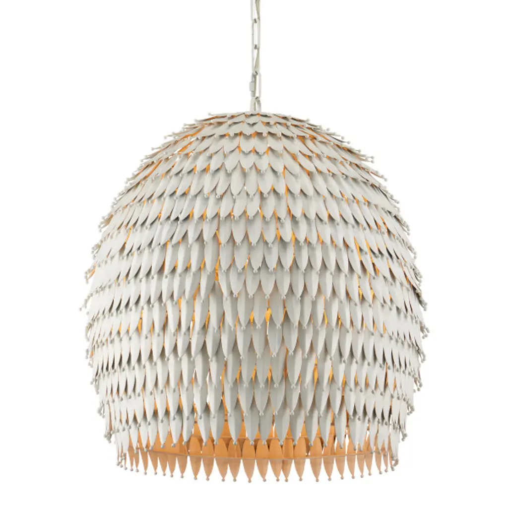 The Overlay Pendant is an artisanal creation that is painstakingly made by hand, as each of the leaves are individually cut and welded to the frame and the dots on the edges of the spiky cut-outs are welded on. The shape of the pendant has a sartorial feel thanks to the textural richness of the fluted edges flowing downward like a couture wedding dress might. Adjustable with use of included chain/rod kit/cable.