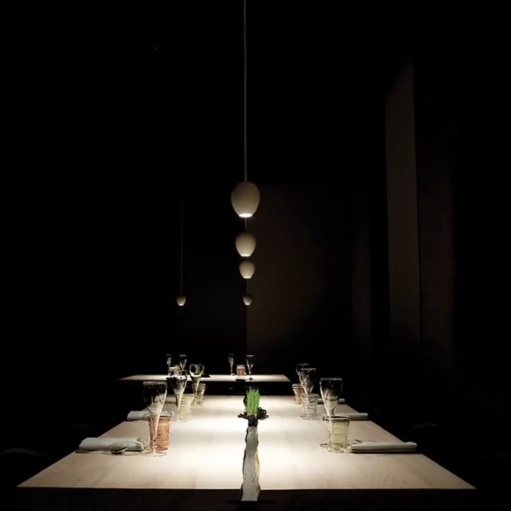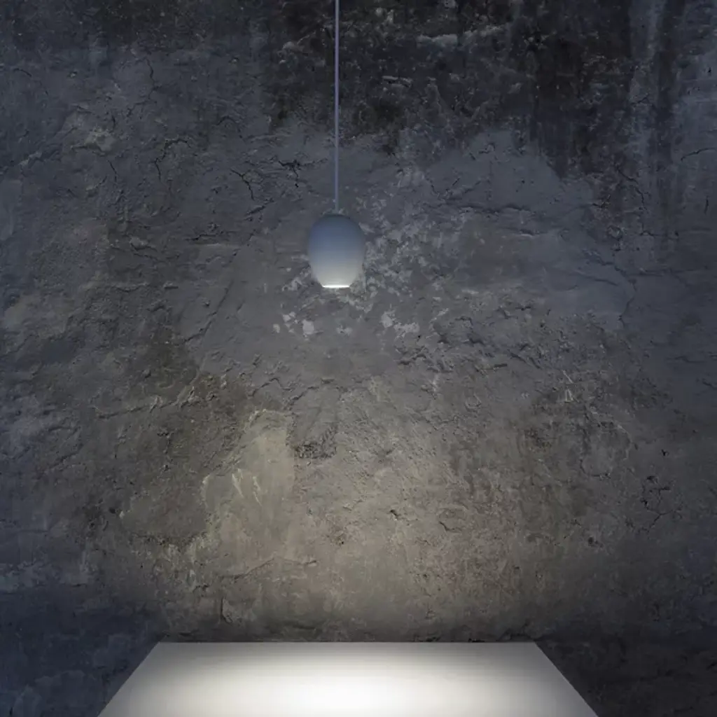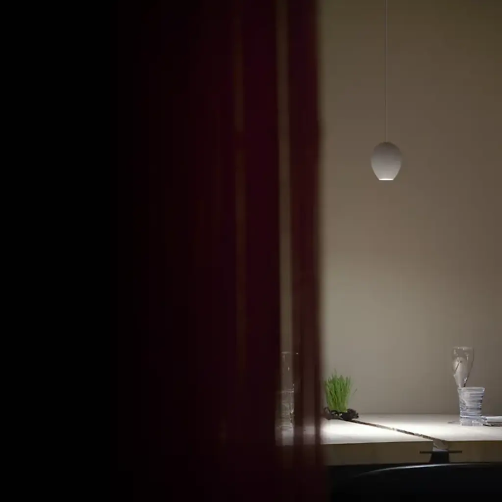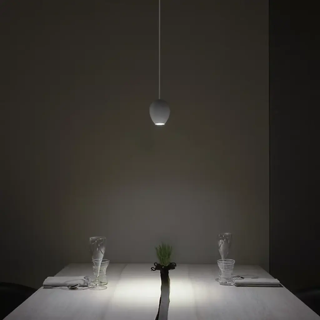 The Ovo Mini Pendant from Davide Groppi offers a straightforward design that provides brilliant yet contained illumination. Designed by Massimiliano Alajmo and Raffaele Alajmo, a metal egg-shaped shade holds the light within, allowing it only to burst out of a small opening in the bottom. This focused and intimate light makes it perfect for hanging above dining tables, whether at home as a single source or lined in a row in restaurants.