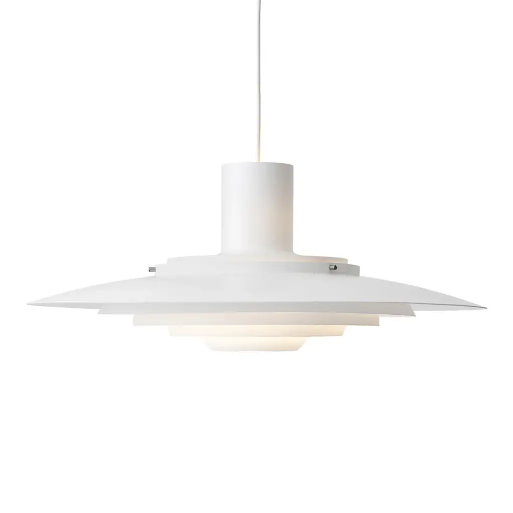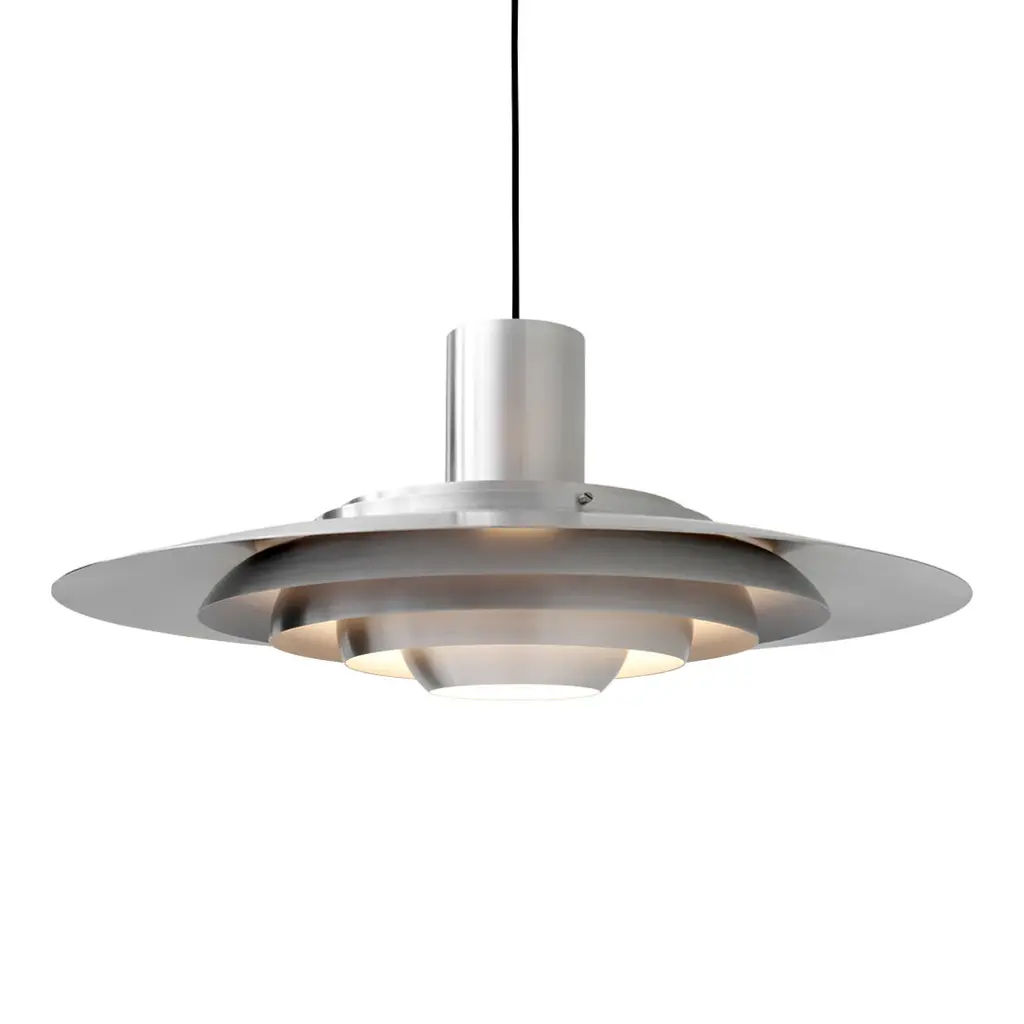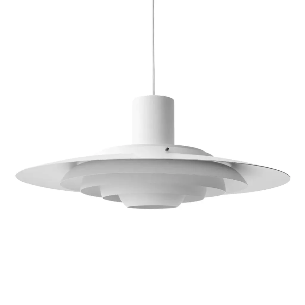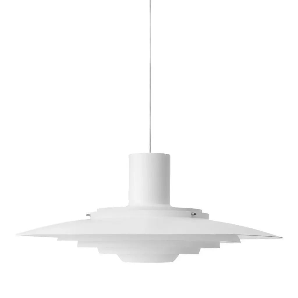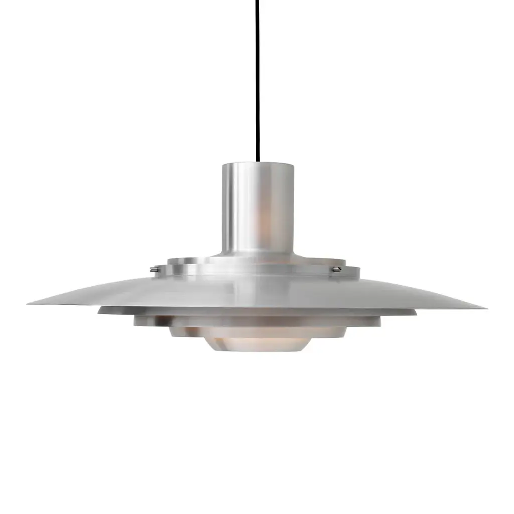 Kastholm & Fabricius were Danish architects whose work influenced the signature aesthetics of Danish Modernism. Kastholm added his experience as a blacksmith combined with Fabricus, training as a cabinetmaker to create distinctively sculptural pieces appealing to an international audience. &Tradition's re-launch of their P376 pendant lamp honors their original design from 1963, featuring five, concentric shades discretely placed underneath which gently curve towards the middle to emit a soft, diffused light. Available in either pure aluminum or white and in two sizes, the KF1 18.7" Dia (47.5 cm) and the KF2 27.6" Dia (70 cm). Enjoy a look that's classic yet forever contemporary. Sleek and sophisticated with echoes of architecture. Pleas Note: The lightbulb is not included