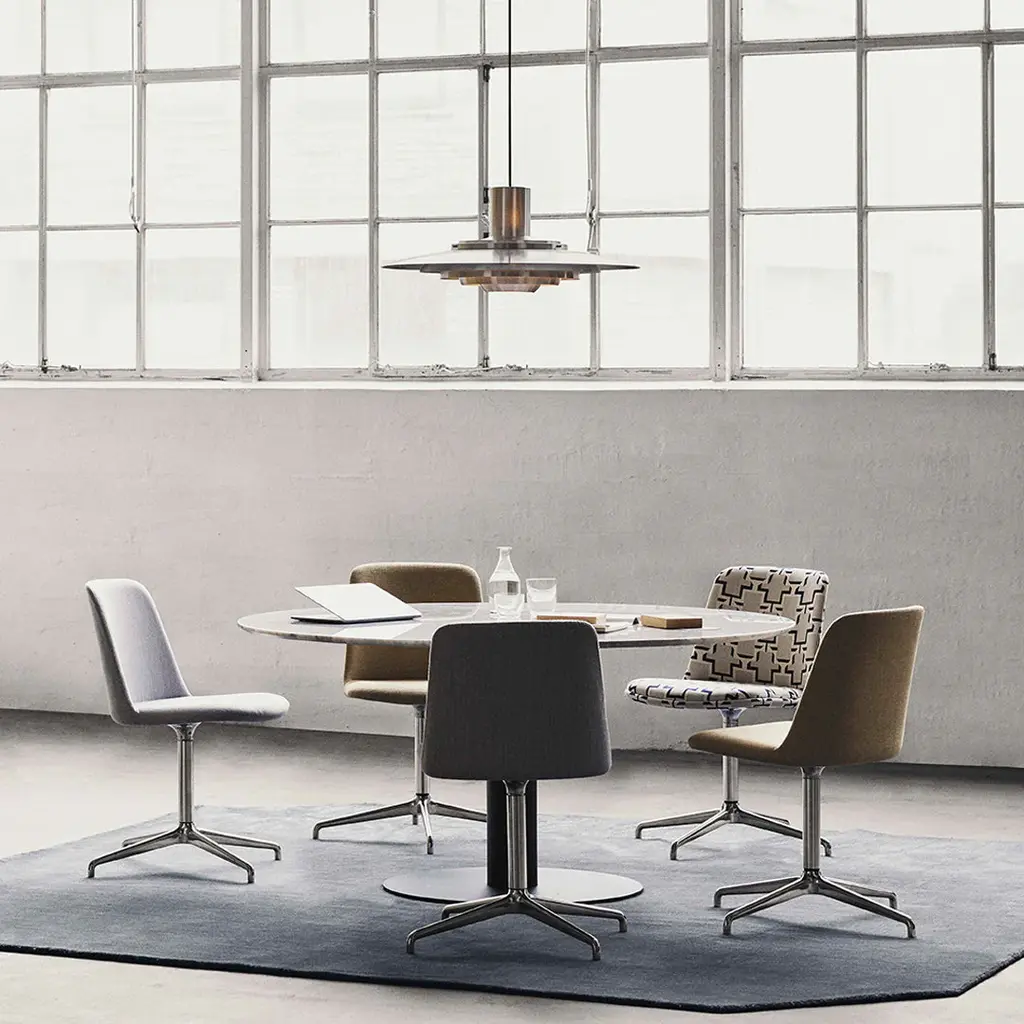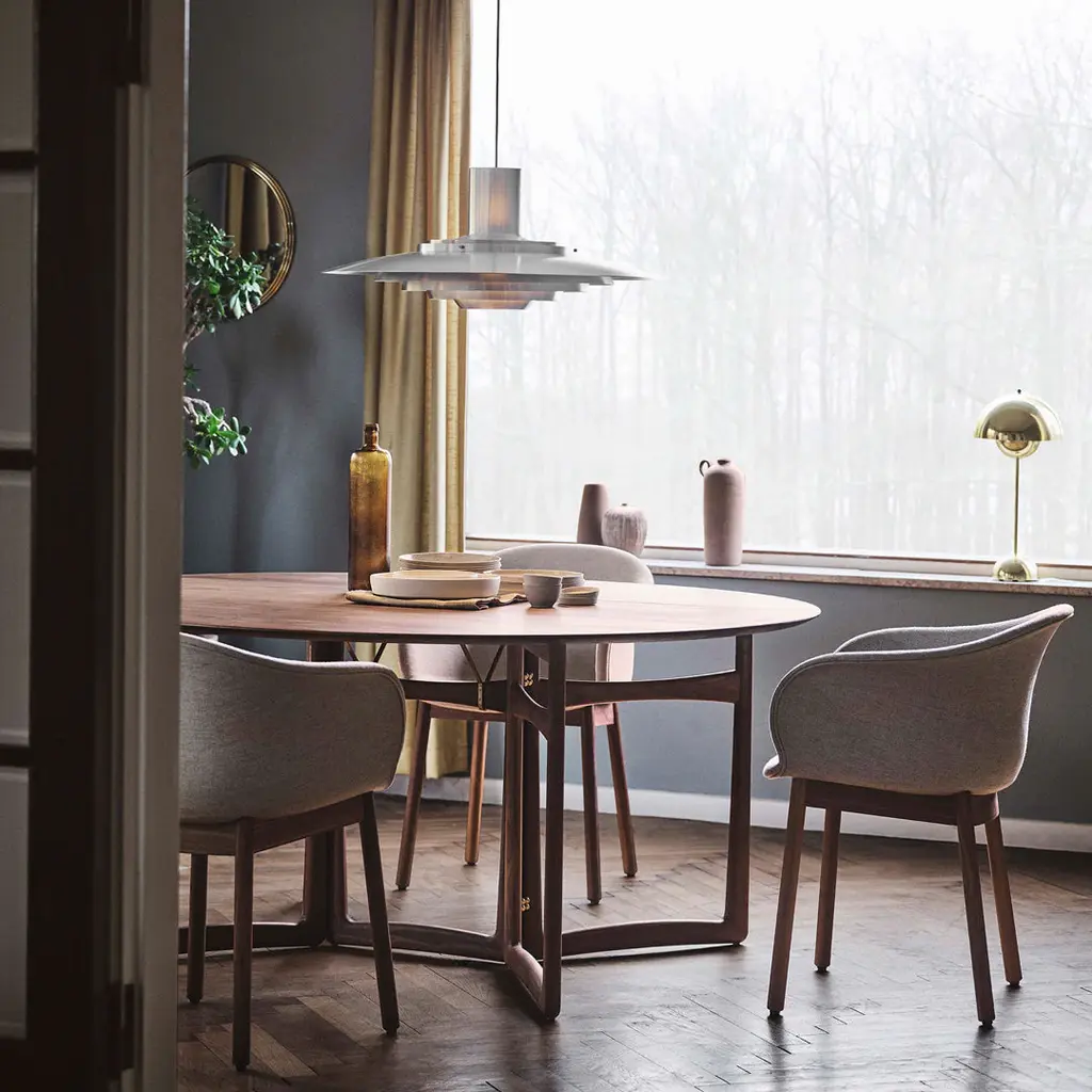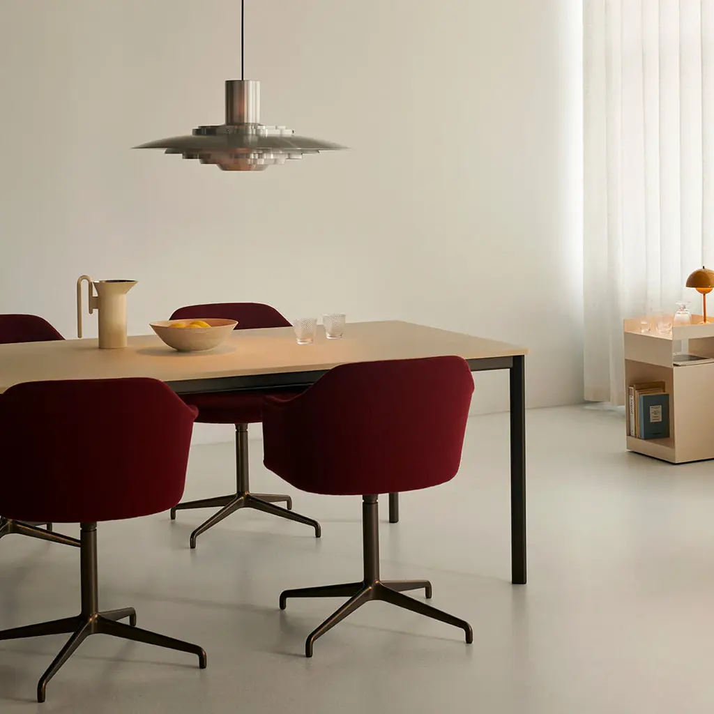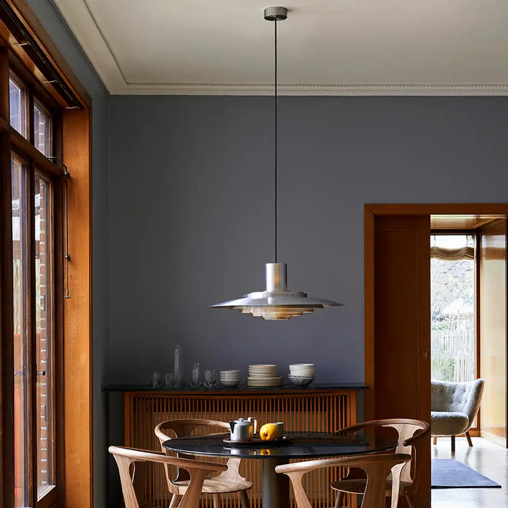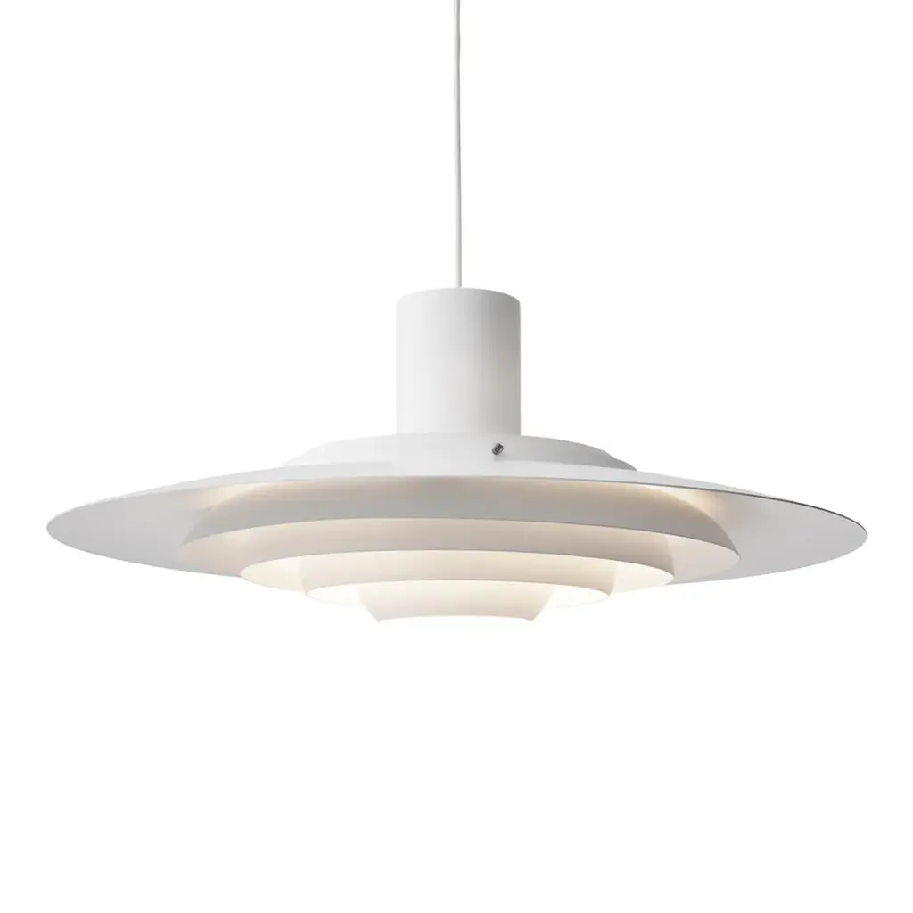 Kastholm & Fabricius were Danish architects whose work influenced the signature aesthetics of Danish Modernism. Kastholm added his experience as a blacksmith combined with Fabricus, training as a cabinetmaker to create distinctively sculptural pieces appealing to an international audience. &Tradition's re-launch of their P376 pendant lamp honors their original design from 1963, featuring five, concentric shades discretely placed underneath which gently curve towards the middle to emit a soft, diffused light. Available in either pure aluminum or white and in two sizes, the KF1 18.7" Dia (47.5 cm) and the KF2 27.6" Dia (70 cm). Enjoy a look that's classic yet forever contemporary. Sleek and sophisticated with echoes of architecture. Pleas Note: The lightbulb is not included