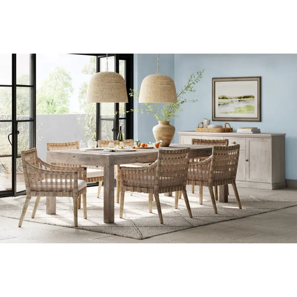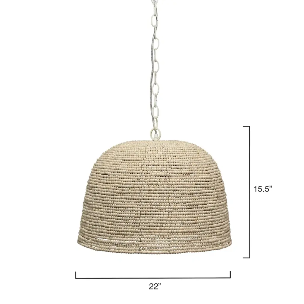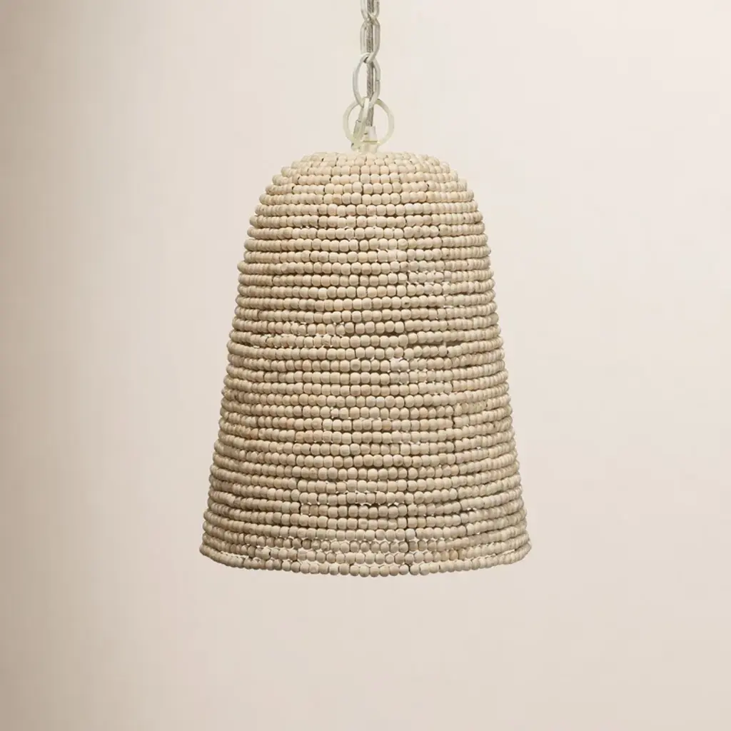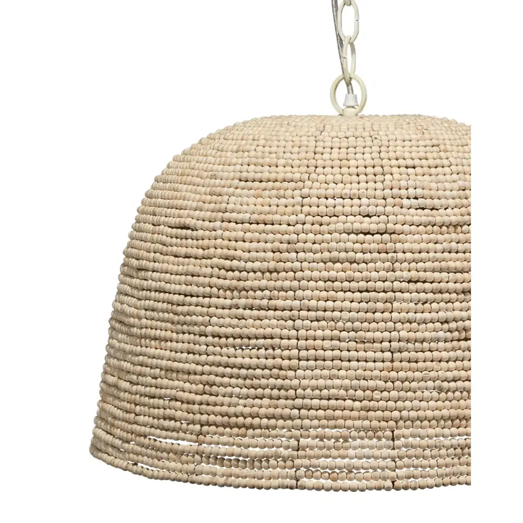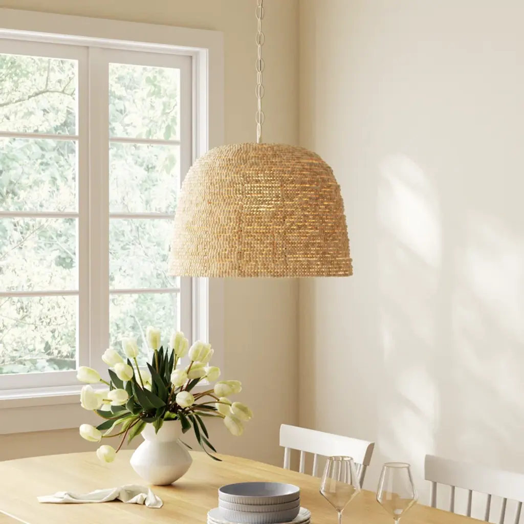 Brighten things up with our 1-light pendant. Strands of wooden beads are woven together to form the dome-shaped shade, creating a look that's perfect for boho and beachy styles. An off-white iron chain compliments the natural tone and texture. This fixture is compatible with sloped ceilings and height-adjustable for versatility – whether it's brightening your kitchen island or cozy reading nook. Plus, it's dimmable, allowing you to set just the right mood for any occasion.