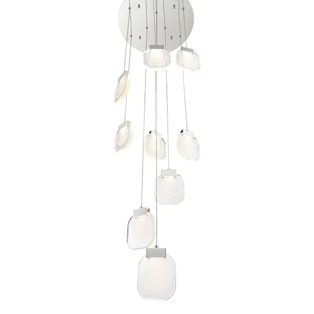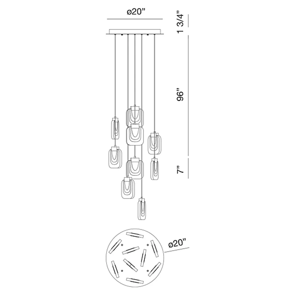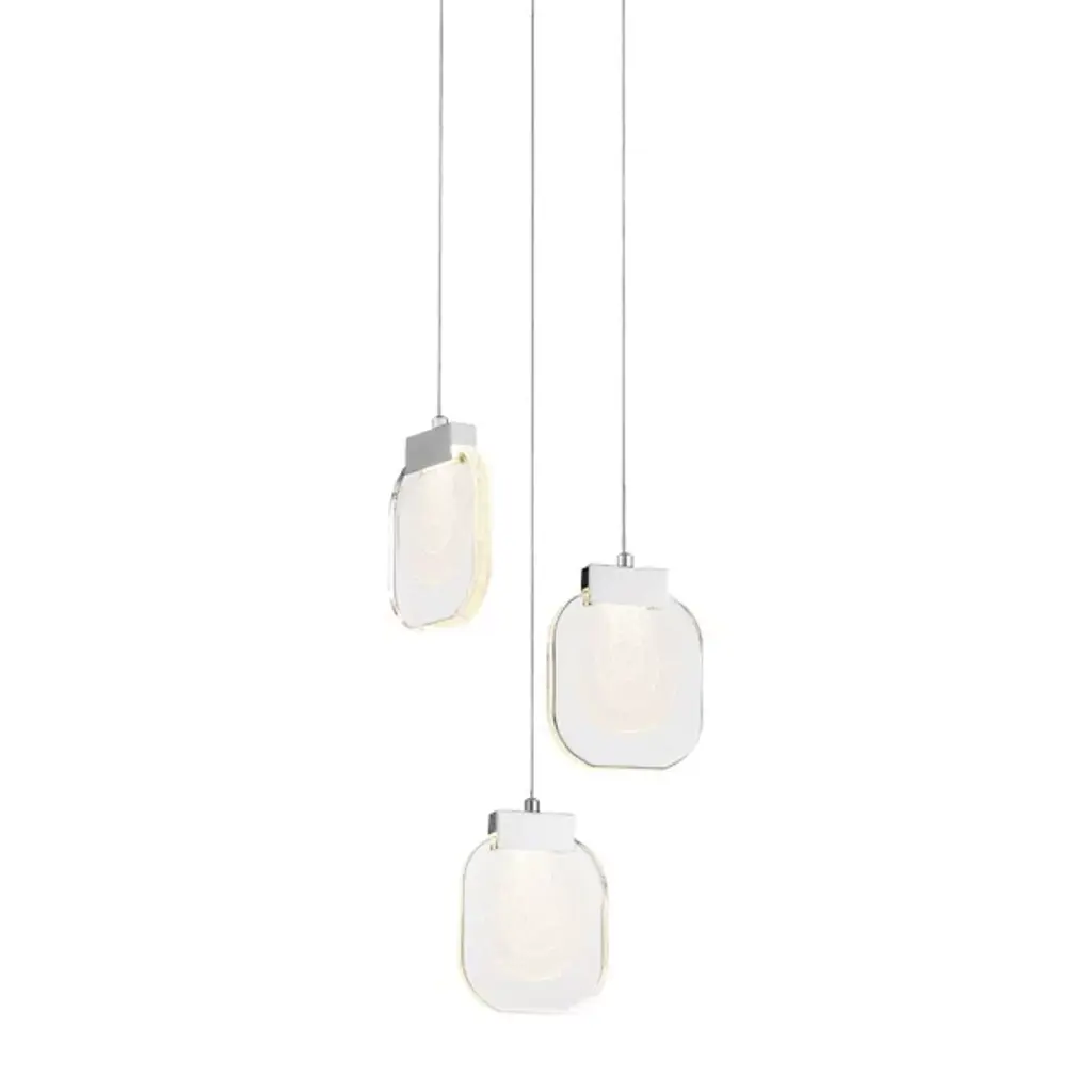 A stylized design with a sweet personality. The Paget Small LED Multi-Light Pendant from Eurofase hangs in the air like miniature works of art, each handcrafted and lit beautifully. It mounts neatly to your ceiling with a clean circular canopy. Ultra-fine cords make the hanging glass elements feel as if floating in the air. Inviting a closer inspection, the traditionally handmade glass shapes display an artful composition of rippling sugar glass. Light shining from the sleek metal bracket highlights the caramelized-like texture of the sugar glass, translating to a soft ambient glow.