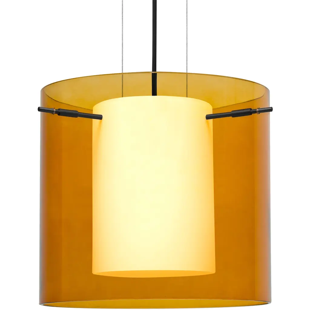 Pahu is a distinctive double-glass pendant, with an inner opal cylinder centered within a transparent outer glass. Our Trans-Armagnac colored blown glass complements the soft white Opal cased glass, which can suit any classic or modern decor. Opal has a very tranquil glow that is pleasing in appearance, as the Trans-Armagnac glass sparkles with the accents from that glow. The smooth satin finish on the opals outer layer is a result of an extensive etching process. This blown glass combination is handcrafted by a skilled artisan, utilizing century-old techniques passed down from generation to generation. The 12V cord pendant fixture is equipped with a 10' braided coaxial cord with teflon jacket and a low profile flat monopoint canopy. These stylish and functional luminaries are offered in a beautiful Black finish.