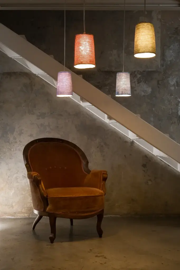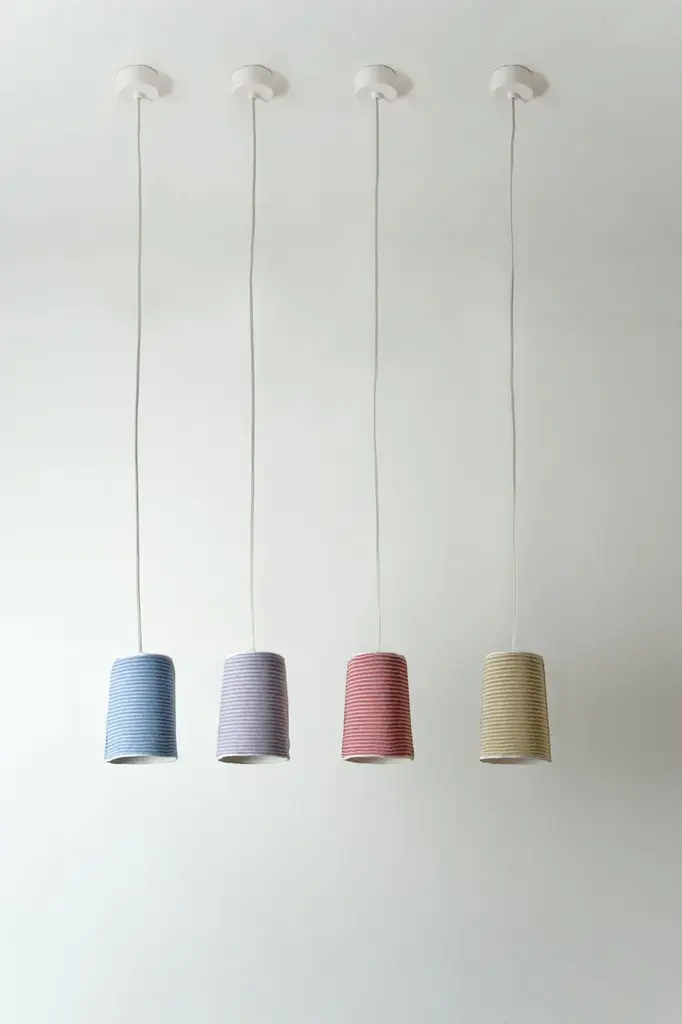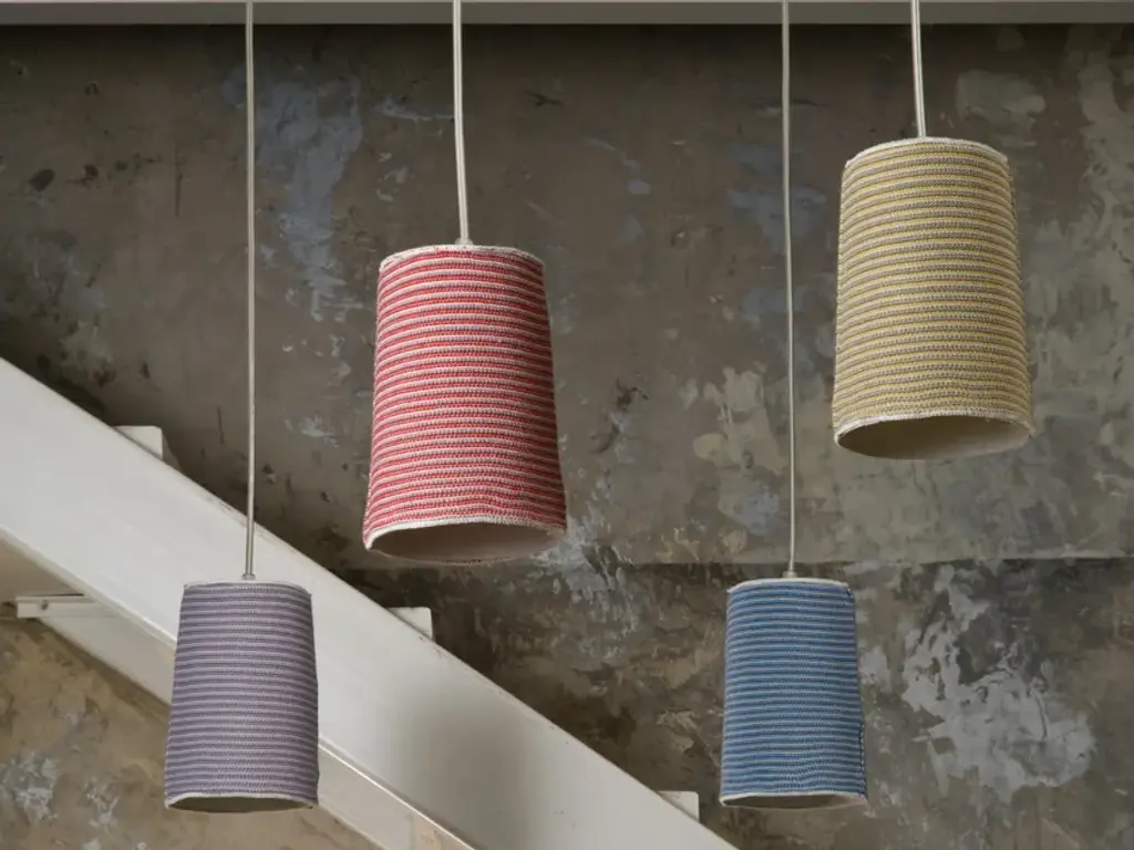 Some models of the Trame series present a structure in Nebulite® covered by a striped yarn, created especially for In-es.artdesign by specialized sartorial laboratories. The regular and geometric pattern of the fiber reminds of pop art, but the leading role is played by the color – blue, purple, red, yellow - of the actual lines. When the lamp is on, the chromatic effect, mixed with the light, creates a multitude of colors.There is another proposal dedicated to the wall lamp and table lamp models of this collection. It consists of a nylon covering, white or black, with a silicon name tag of the logo, that “dresses” the flexible tube. This “flexible arm” can be moved, to project the light where you prefer.The new collection Trame, designed by the artist/ designer Oçilunam for In-es.artdesign, is a family of lamps created with handcrafted techniques, typical of designer clothing.