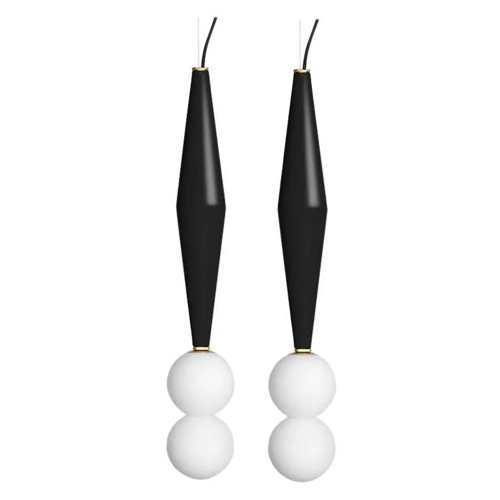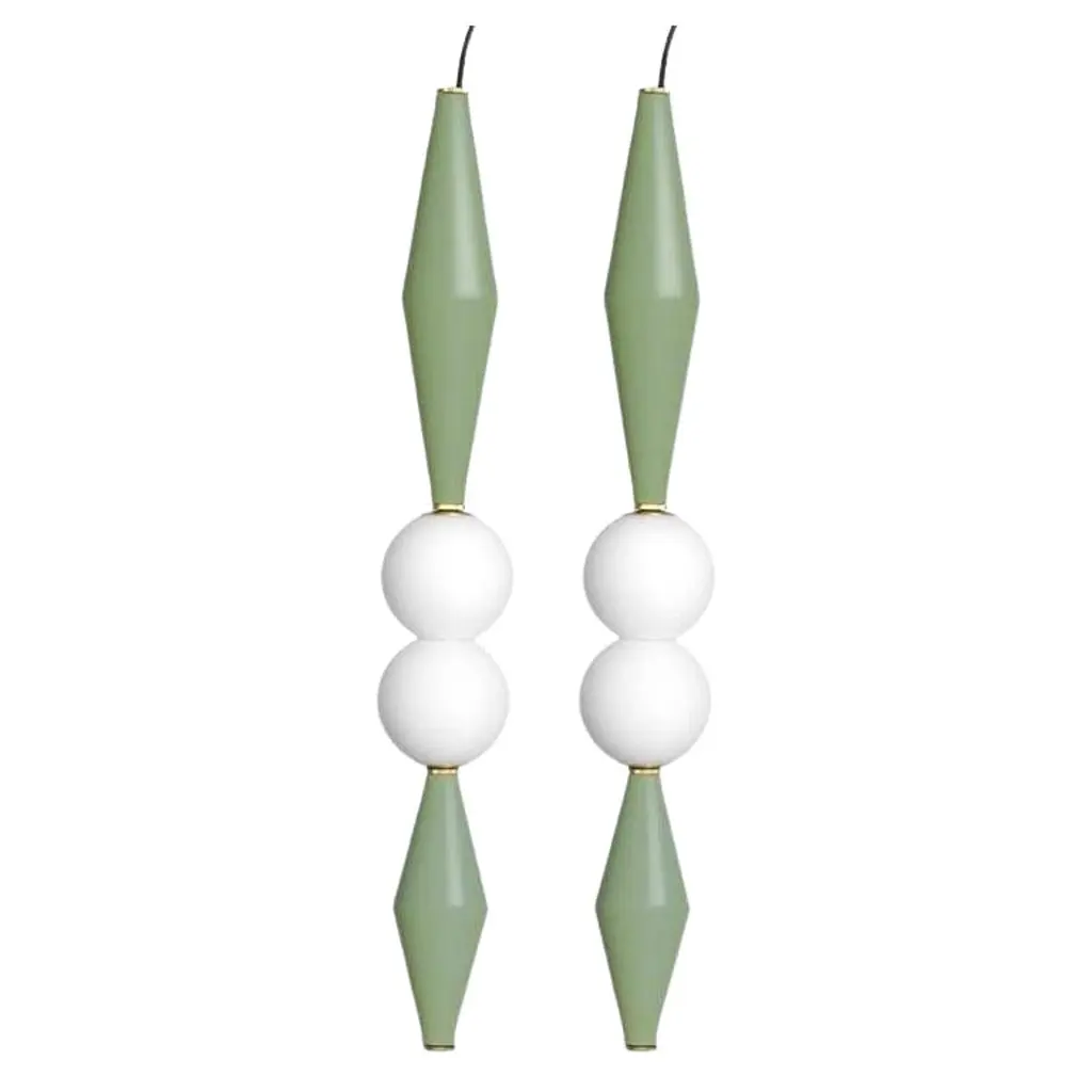 Pair of Gamma E lamps by Mason EditionsDimensions: 12 × 12 × 37 cmMaterials: aluminium and blown opal white glassColours: pink, burgundy, light grey, sage green, petrol green, black; petrol green/black, sage green/black, pink/black, burgundy/black.All our lamps can be wired according to each country.Gamma is the third letter of the Greek alphabet and also the third brightest star in the constellation.It’s in fact an alphabet of three aluminium elements, that creates a range of six modular suspensions. The frosted glass spheres contain the luminous soul which, combined in different ways with the metal elements, give life to new solutions that look like constellations. A pendant lamp powered by led lighting, a sophisticated design object that will suit any modern interior space. Pair multiple Gamma pendants in various positions for a magical effect.Mason Editions is an Italian company specialized in the production of design furniture, lighting solutions and accent pieces. Born from the lifelong passion for lighting and entrepreneurial spirit of Fabio and his partner Silvia, Mason Editions places itself halfway between fine art and exquisite craftsmanship. A collection of lighting, design objects and furnishing accessories, signed by artists Serena Confalonieri, Martina Bartoli and Matteo Fiorini, head of the creative direction. Mason Editions comes from the experience of an Italian lighting company placed in the Veneto region. This new brand of furniture elements was born from the meeting between the entrepreneur Fabio Mason and three international designers who designed the first collection for a sophisticated public. Therefore the collection wants to be eclectic and timeless. The Material contrast and fresh design, with essential shapes, mark the mason editions collection. In conclusion, the elegant Italian sign highlights proposals suitable for all environments. Mason editions is a set of experiences, artisans, and productive know-how that creates a capable system.