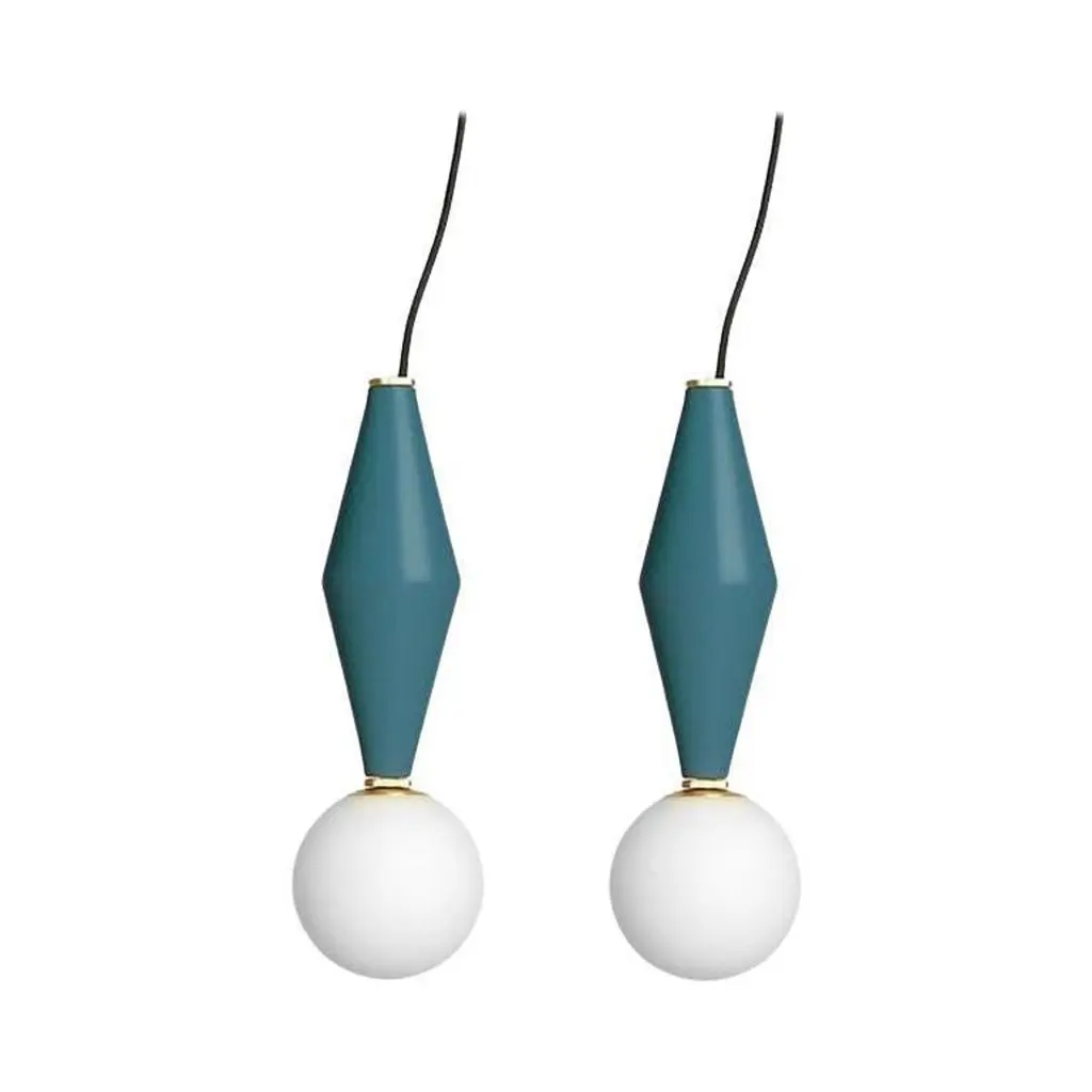Pair of Gamma F lamps by Mason EditionsDimensions: 12 × 12 × 37 cm.Materials: aluminium and blown opal white glass.Colours: pink, burgundy, light grey, sage green, petrol green, black; petrol green/sage green, black/grey, pink/grey, pink/burgundy.All our lamps can be wired according to each country.Gamma is the third letter of the Greek alphabet and also the third brightest star in the constellation.It’s in fact an alphabet of three aluminium elements, that creates a range of six modular suspensions. The frosted glass sphere contains the luminous soul which, combined in different ways with the metal elements, gives life to new solutions that look like constellations. Suspended ceiling lamp with a modern and vibrant silhouette. Display in multiples to create striking lighting compositions. Available in pink, burgundy, sage green, petrol green, light grey, black and several colour combinations.Mason Editions is an Italian company specialized in the production of design furniture, lighting solutions and accent pieces. Born from the lifelong passion for lighting and entrepreneurial spirit of Fabio and his partner Silvia, Mason Editions places itself halfway between fine art and exquisite craftsmanship. A collection of lighting, design objects and furnishing accessories, signed by artists Serena Confalonieri, Martina Bartoli and Matteo Fiorini, head of the creative direction Mason Editions comes from the experience of an Italian lighting company placed in the Veneto region. This new brand of furniture elements was born from the meeting between the entrepreneur Fabio Mason and three international designers who designed the first collection for a sophisticated public. Therefore the collection wants to be eclectic and timeless. The material contrast and fresh design, with essential shapes, mark the mason editions collection. In conclusion, the elegant Italian sign highlights proposals suitable for all environments. Mason editions is a set of experiences, artisans, and productive know-how that creates a capable system.