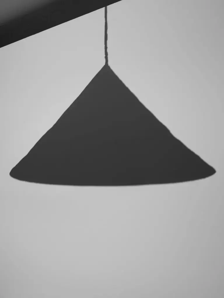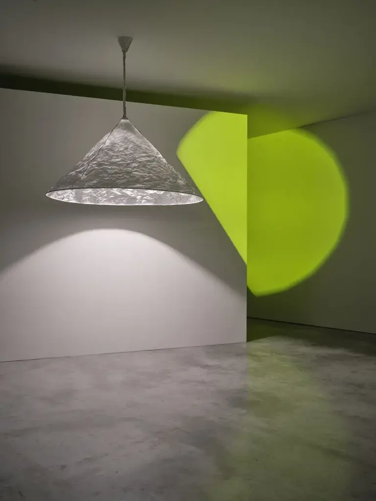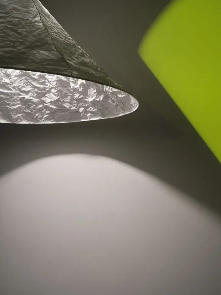 Pajama is a pendant lamp made of Tyvek, a material that gives it a crumpled paper effect. Suspended from a metal structure that defines its conical shape, Pajama captures light and projects an elaborate interplay of shadows, creating a myriad of unique forms and silhouettes. This intricate play of light and shadow is made possible by the lamp’s distinctive geometry.