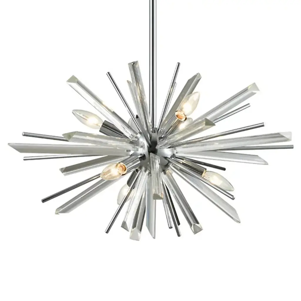 A sharp aesthetic. Featuring a collection of cosmetic blades bursting from its core, the Palisades Ave. Pendant by Avenue Lighting reflects ambient light for a gorgeous look even by day. But, it truly comes alive after the sun goes down when a flick of the switch awakens this chandelier's many lights to take its luminous beauty to a whole new level. Its out-of-this-world look was inspired by the original design of the Sputnik satellite. For a refined but durable construction, this product has been made out of iron and crystal.