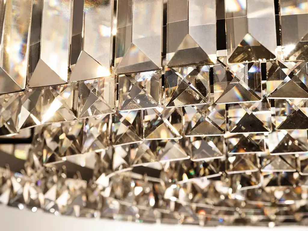 Palladio is a suspension lamp with crystal lozenges.Traditional lighting: 15×E27×20 W MAX (NOT INCL.)**BULB MAX Ø 45 mm / 1.80”Palladio offers the perfect blend of modernity and luxury. This masterpiece of design will light up any room with impeccable style thanks to the rigorous forms, softened by the crystal lozenges.Painted metal frame. Golden smoky crystal lozenges. Traditional lighting.