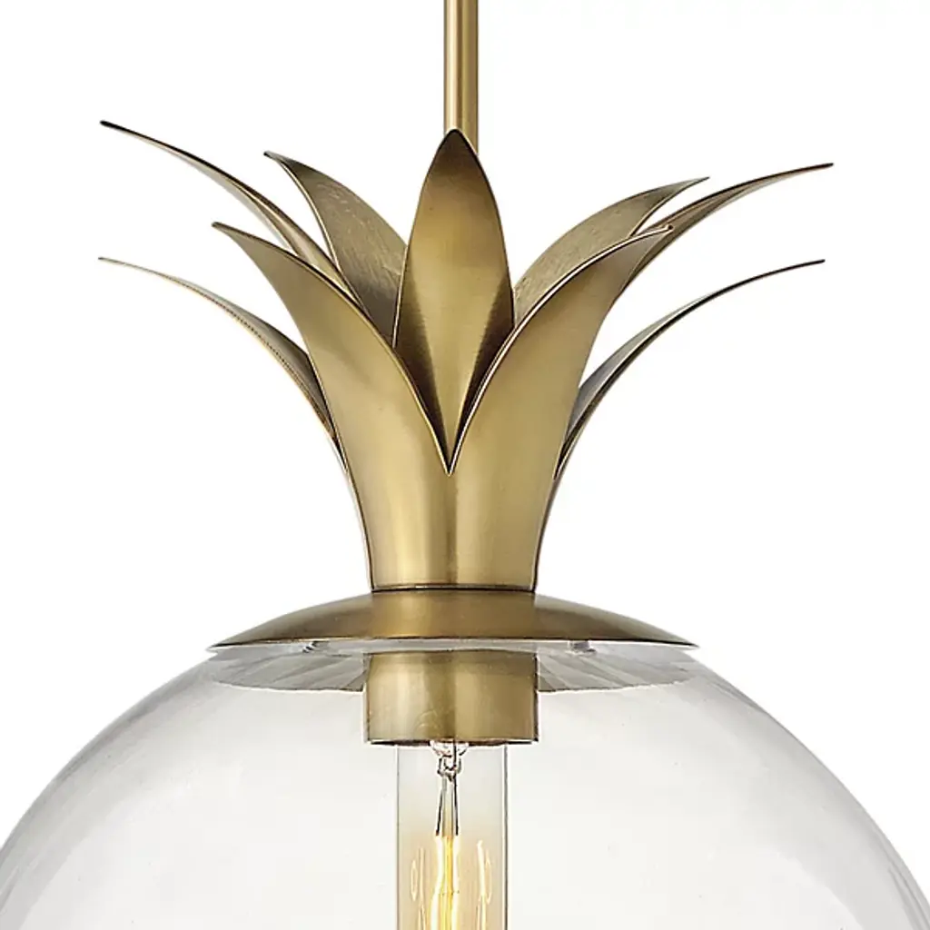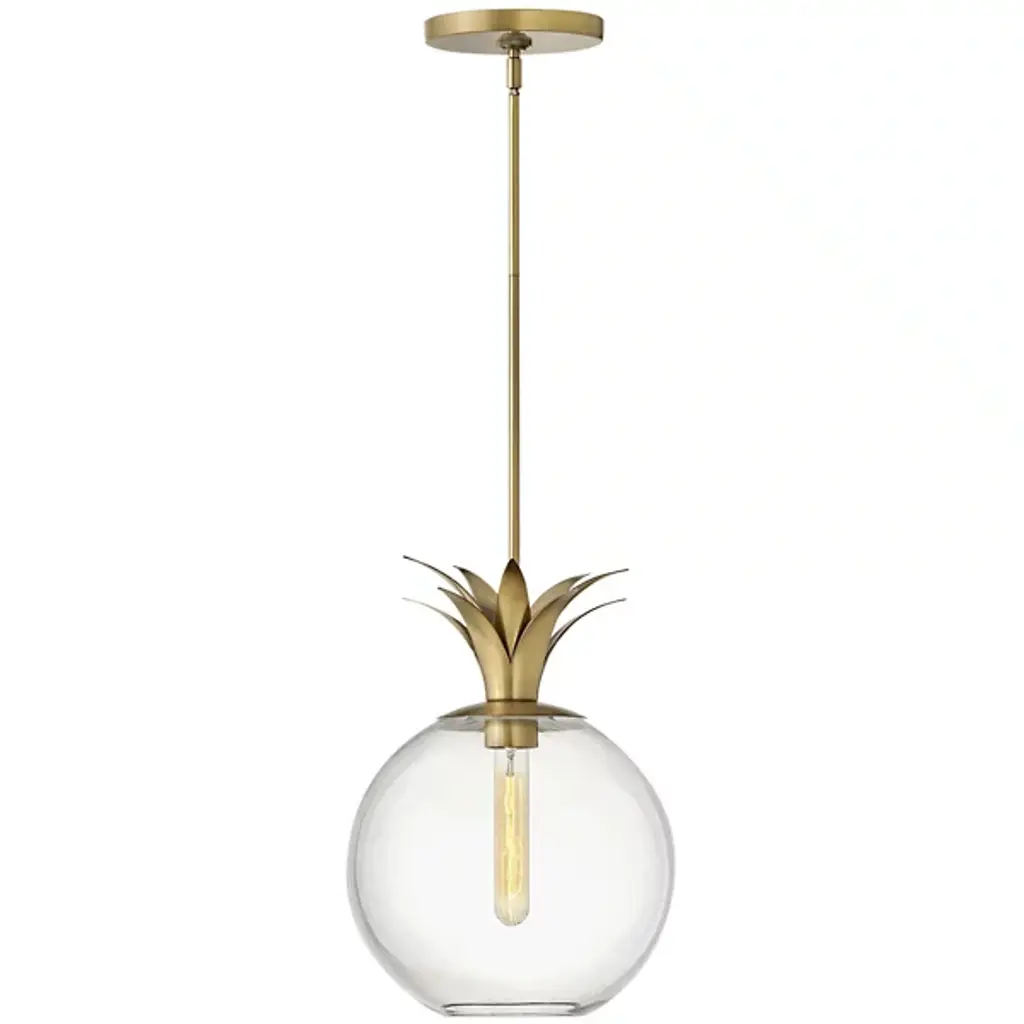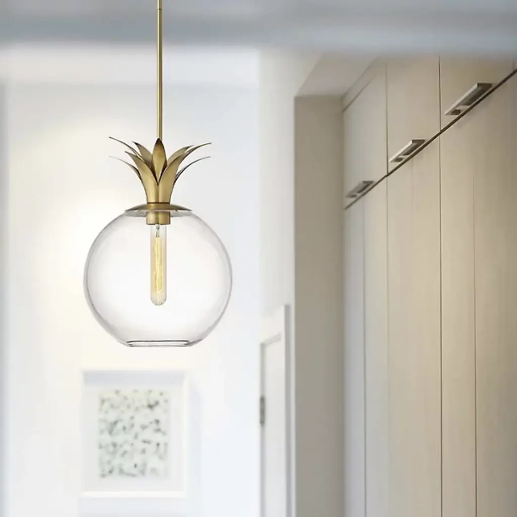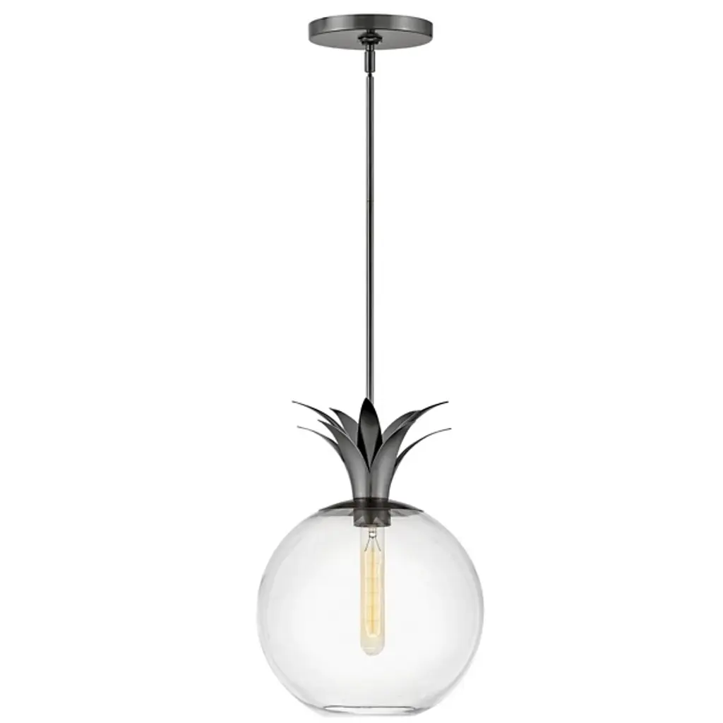 A pineapple-inspired silhouette bursting with charm and sophistication. Lighten up the mood with the artful design of the Palma Pendant from Hinkley. The piece makes an unforgettable first impression both day and night. The pendant’s slim suspension and compact canopy make it easy to arrange in a series or on its own in a tight space. It grabs one’s attention with a bursting composition of steel leaves. The leaves point the eyes to the beautiful glass globe and its rich light source. Giving the glass a warm glaze, the bulb introduces a soft down glow and ambient light to your room.