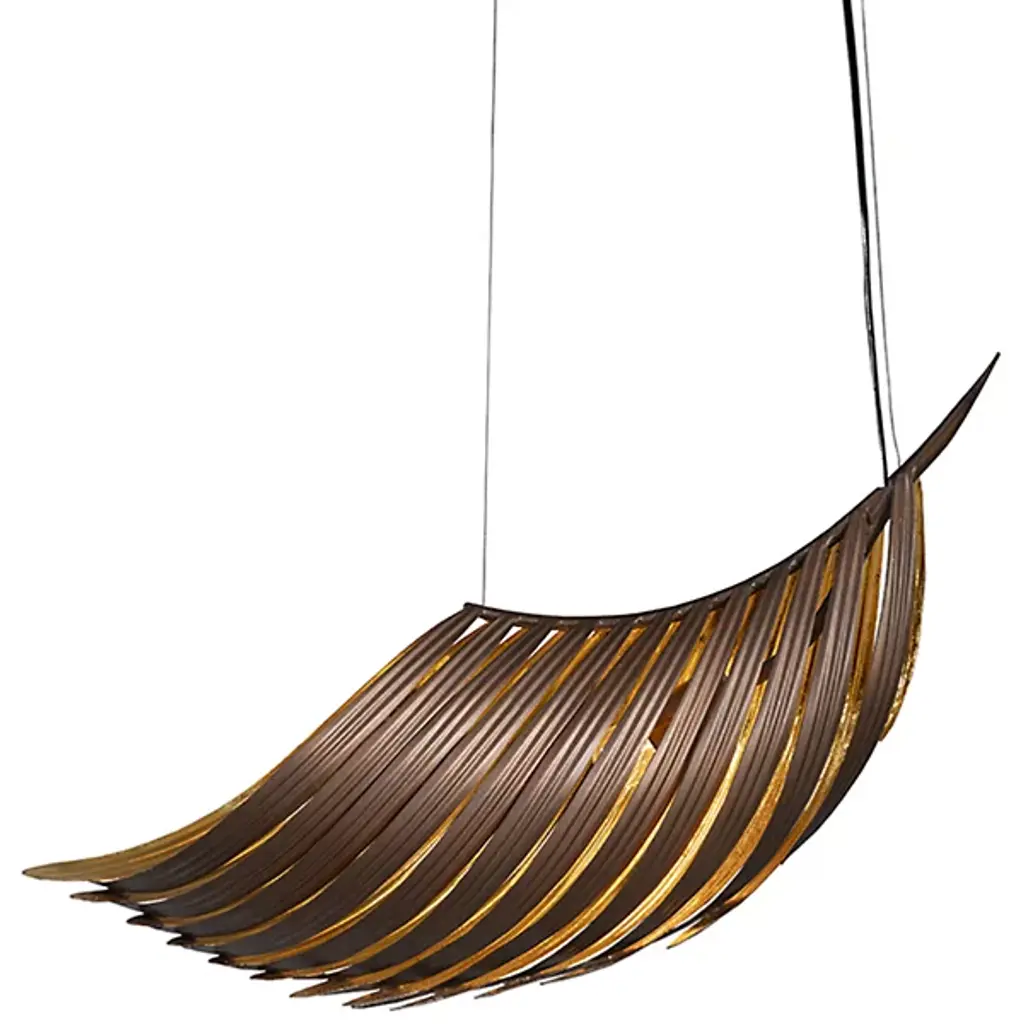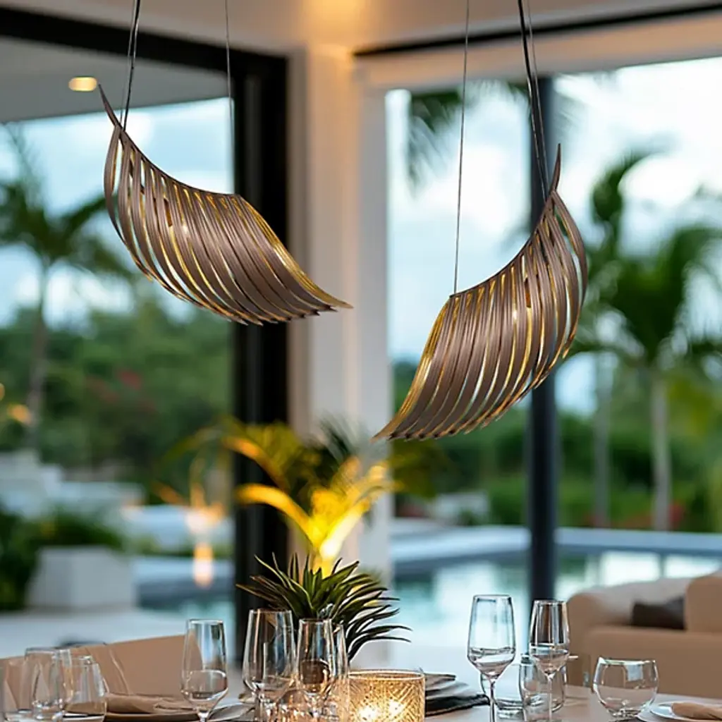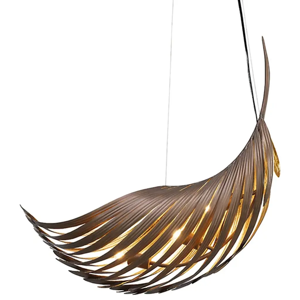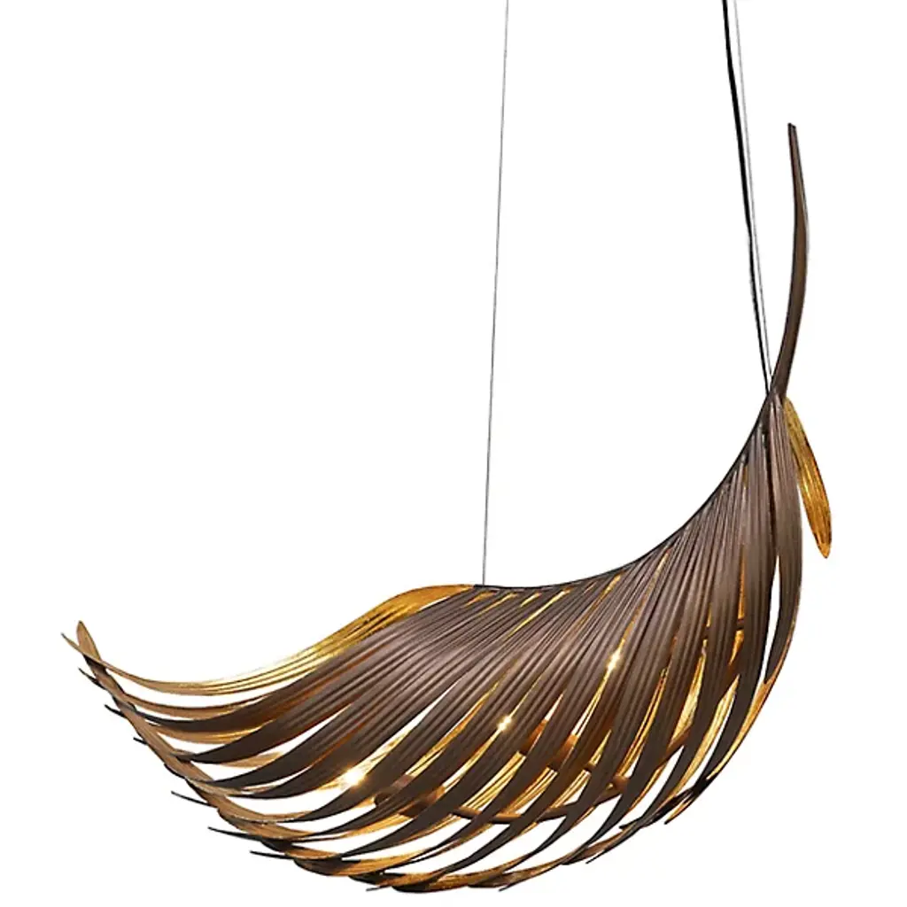 Palmera Curved Leaf Pendant from Justice Design Group features a modern, irregular light fixture shape that makes a stunning statement in any room. Crafted from high-quality metal, its unique design brings a touch of elegance to living rooms, dining rooms, or hallways. The Palmera Curved Leaf Pendant, suitable for residential use only, offers a versatile lighting option with its customisable arrangement potential. Its distinct look and damp location rating make it perfect for enhancing contemporary spaces.