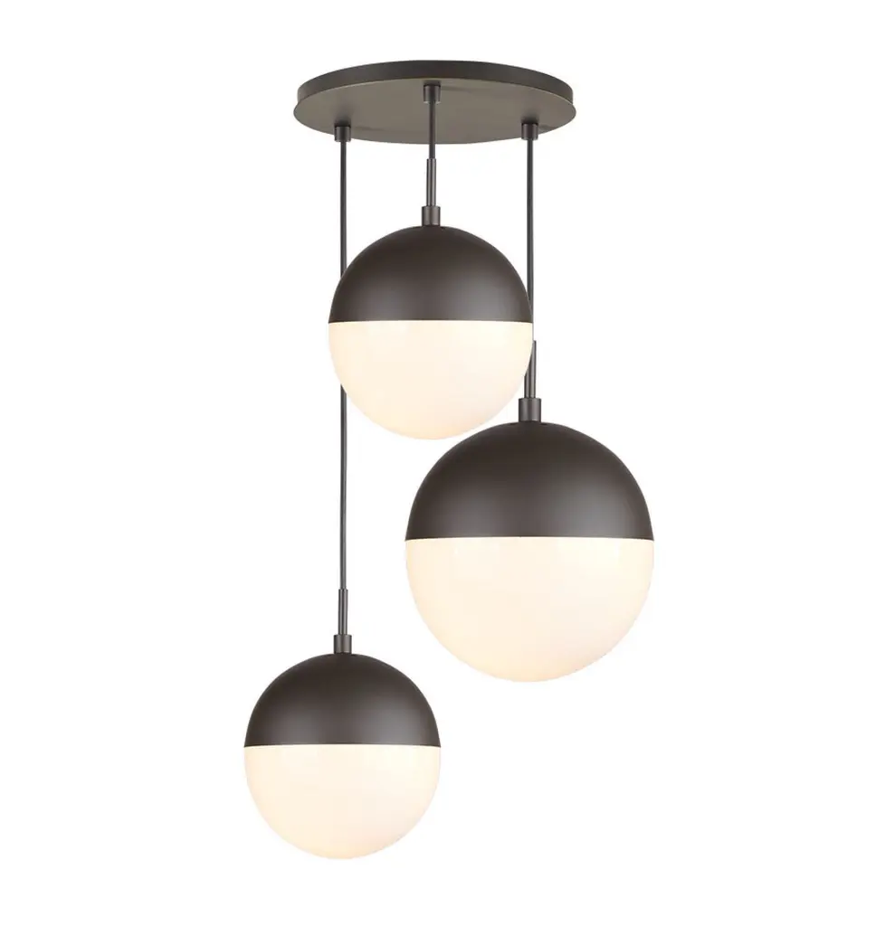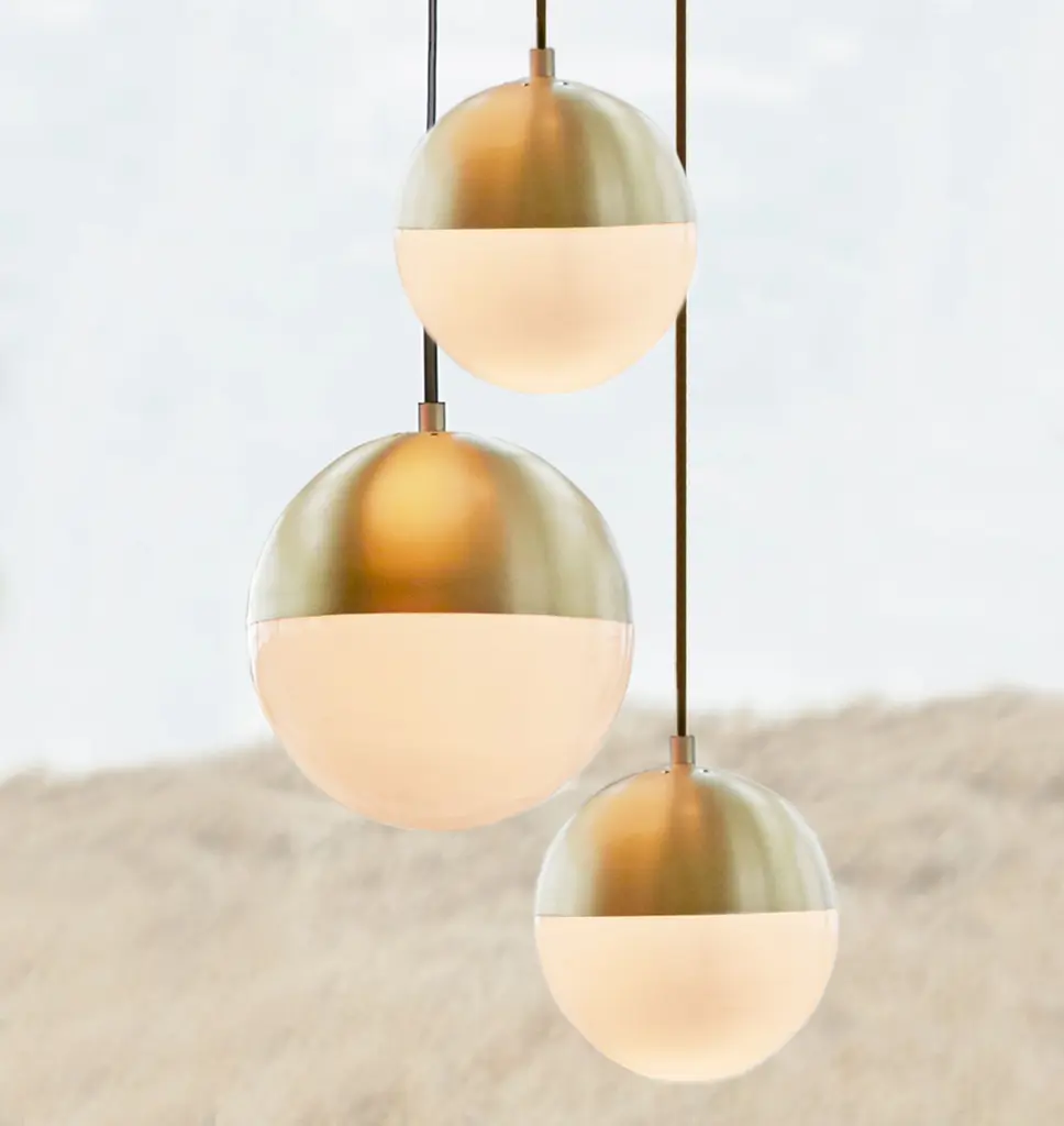 Featuring an exclusive multi-drop design, this globe light combines classic modern lines with unparalleled texture and shine. Whether it's in a dining space or a kitchen, this light makes a timeless statement. Each one is built to your specifications at our Portland, Oregon factory. Details You'll Appreciate High-quality brass construction with glass shades Fixture contains two 8" globes and one 10" globe Assembled to order at our Portland, Oregon factory Product Specifications Hardwired; professional installation recommended Suitable for indoor use (UL Rated Dry) Use A15 or smaller bulb Assembled in the USA of domestic and imported parts