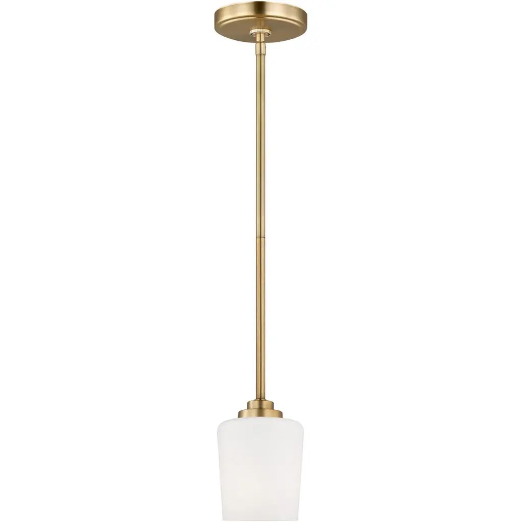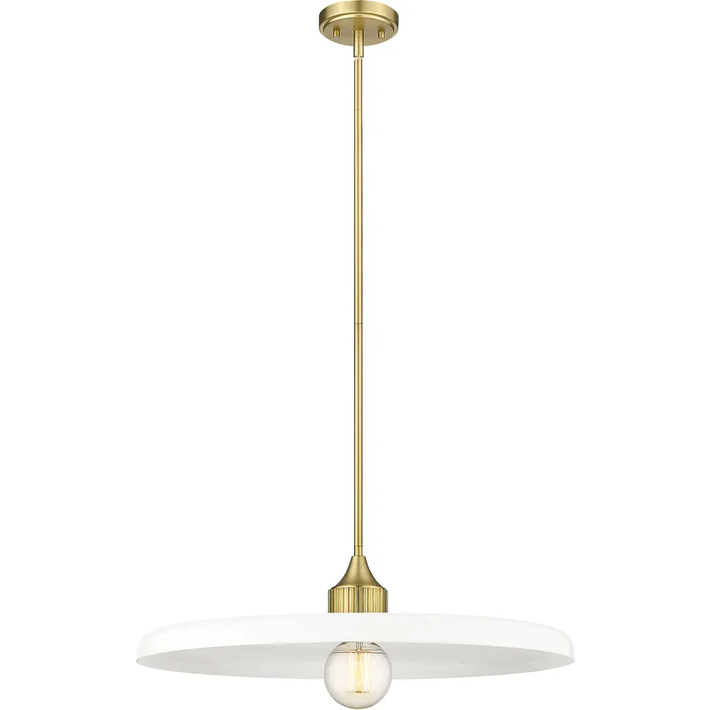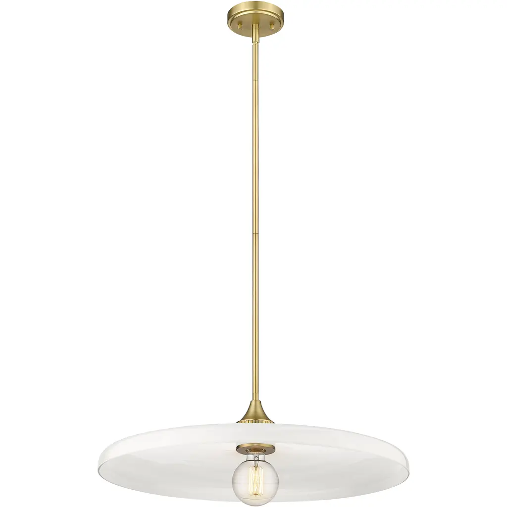 Smooth, glossy opal glass creates a wide disc to diffuse the illumination from this modern one-light pendant. Dramatic in any room, the fixture pairs a warm olde brass finish with a simple, clean silhouette that promises bright illumination in a stylish but understated profile.