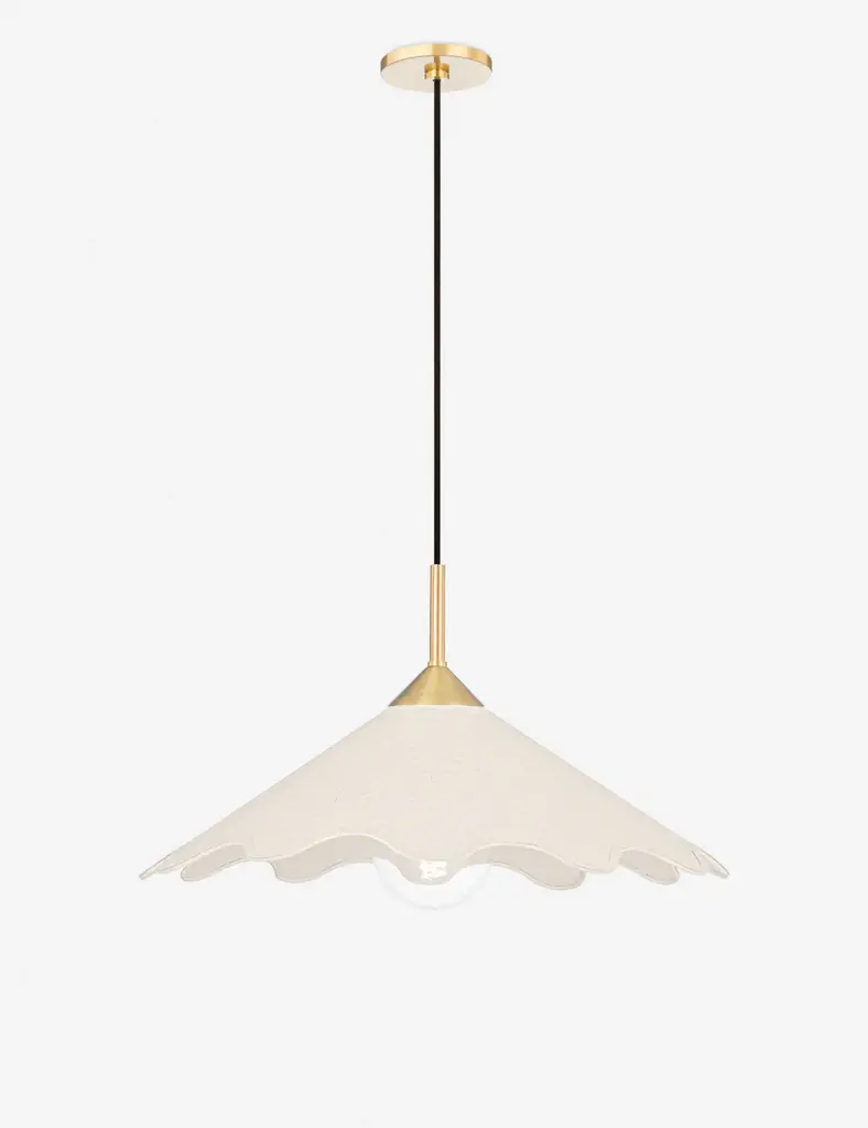 This pendant light offers the perfect feature for effortless elegance with a playful touch. The linen shade's wavy silhouette adds a chic edge to the antique brass-finished pendant holder for a balanced yet style-forward appeal overhead.