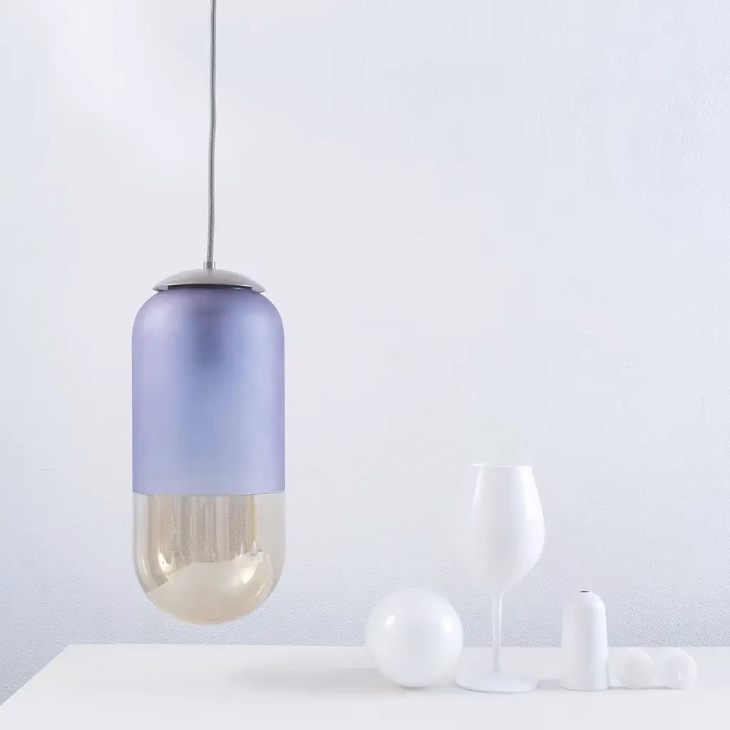 This striking pendant lamp is part of the Papalina collection. Its shade is made entirely of borosilicate glass that was mouth blown and crafted by hand. The top portion was sanded and them colored in a delicate shade of indigo blue with the use of specific pigments for glass. The harmonious effect mixes pure geometric volumes and an elegant sensibility. The bulb is a halogen E27 with a 40W max intensity. The grey cable is 9 cm in diameter and 200 cm long (only for the European market - please ask the concierge for details about other markets).