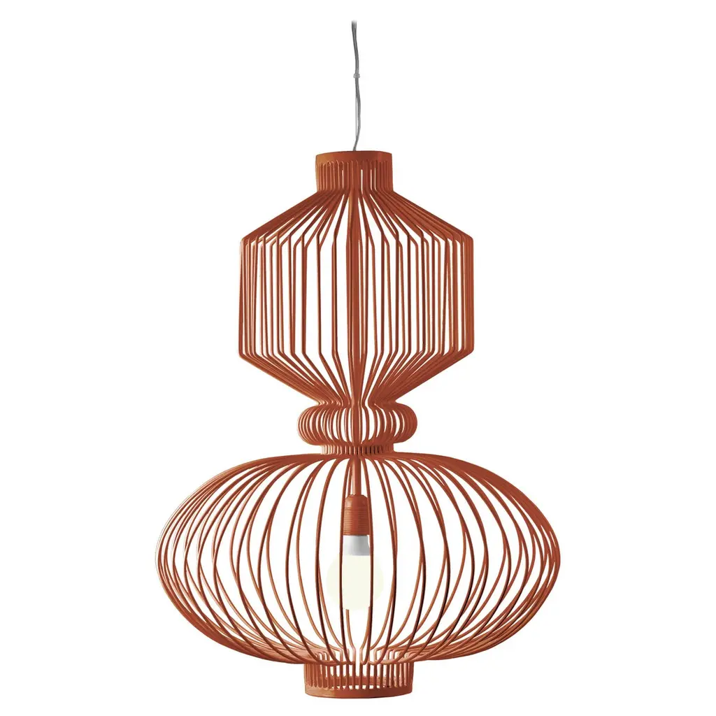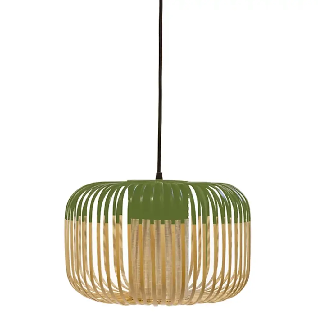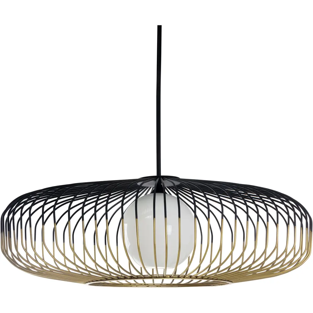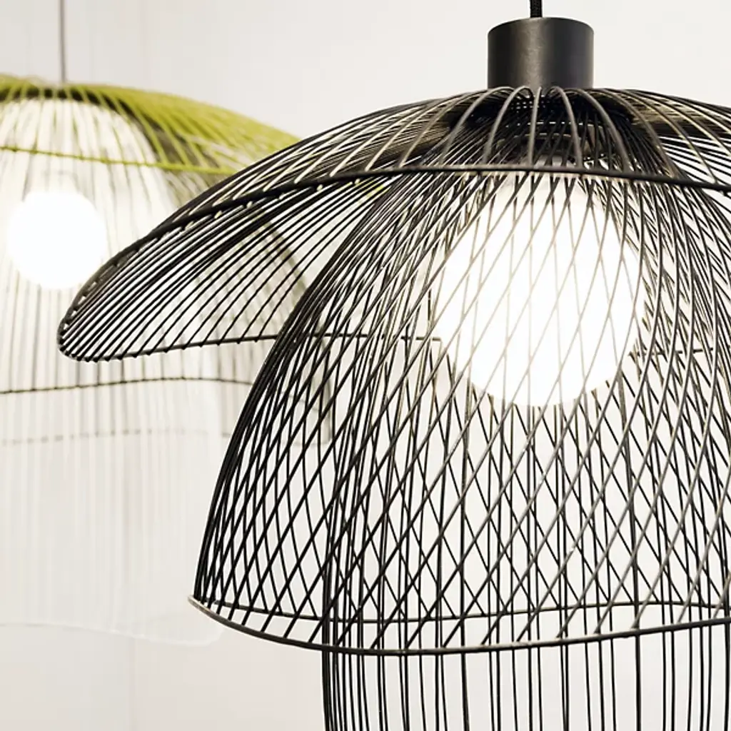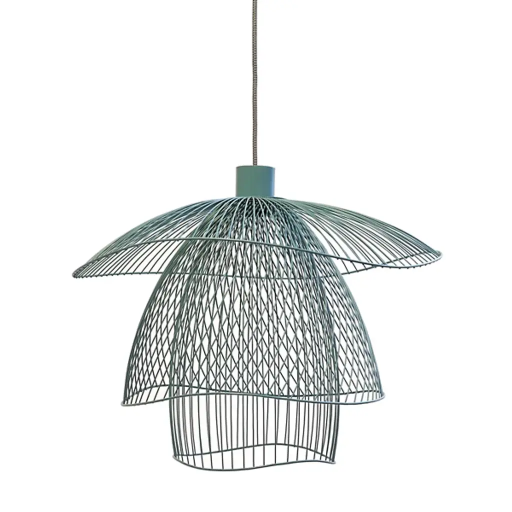 A simple, modern piece, the Papillon Pendant from Forestier brings beauty and emotion to the space. Designed by Elise Fouin in 2015, painted iron metal lines form three shades, each with a distinct shape as they layer within each other and hang from the ceiling from the end of a thin downrod. A single bulb at the center shines a bright, full glow through each shade, elevating the allure of the space with a welcoming and relaxing ambiance.