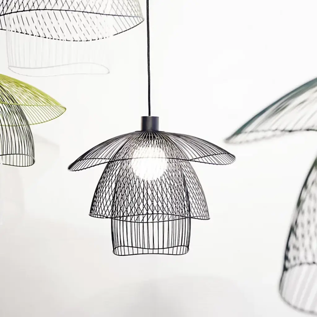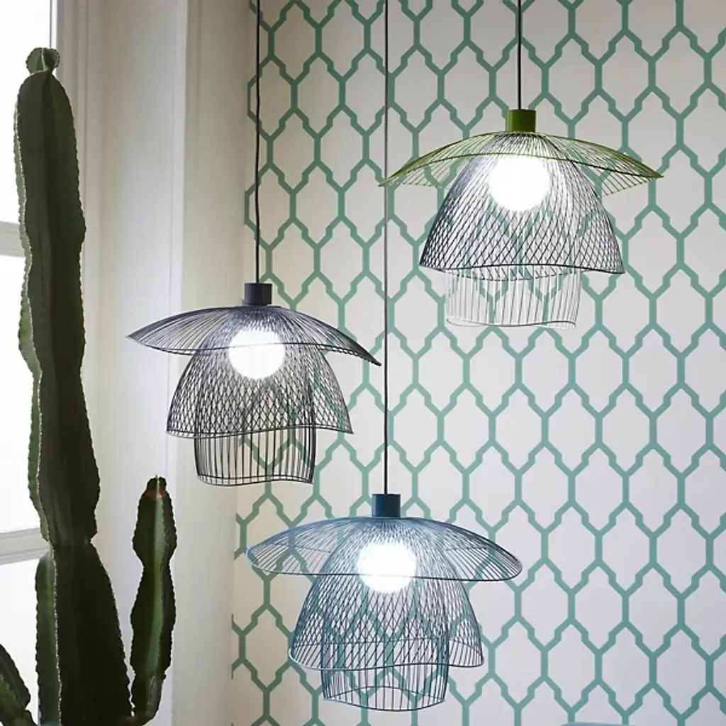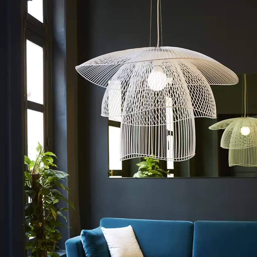 A simple, modern piece, the Papillon Pendant from Forestier brings beauty and emotion to the space. Designed by Elise Fouin in 2015, painted iron metal lines form three shades, each with a distinct shape as they layer within each other and hang from the ceiling from the end of a thin downrod. A single bulb at the center shines a bright, full glow through each shade, elevating the allure of the space with a welcoming and relaxing ambiance.