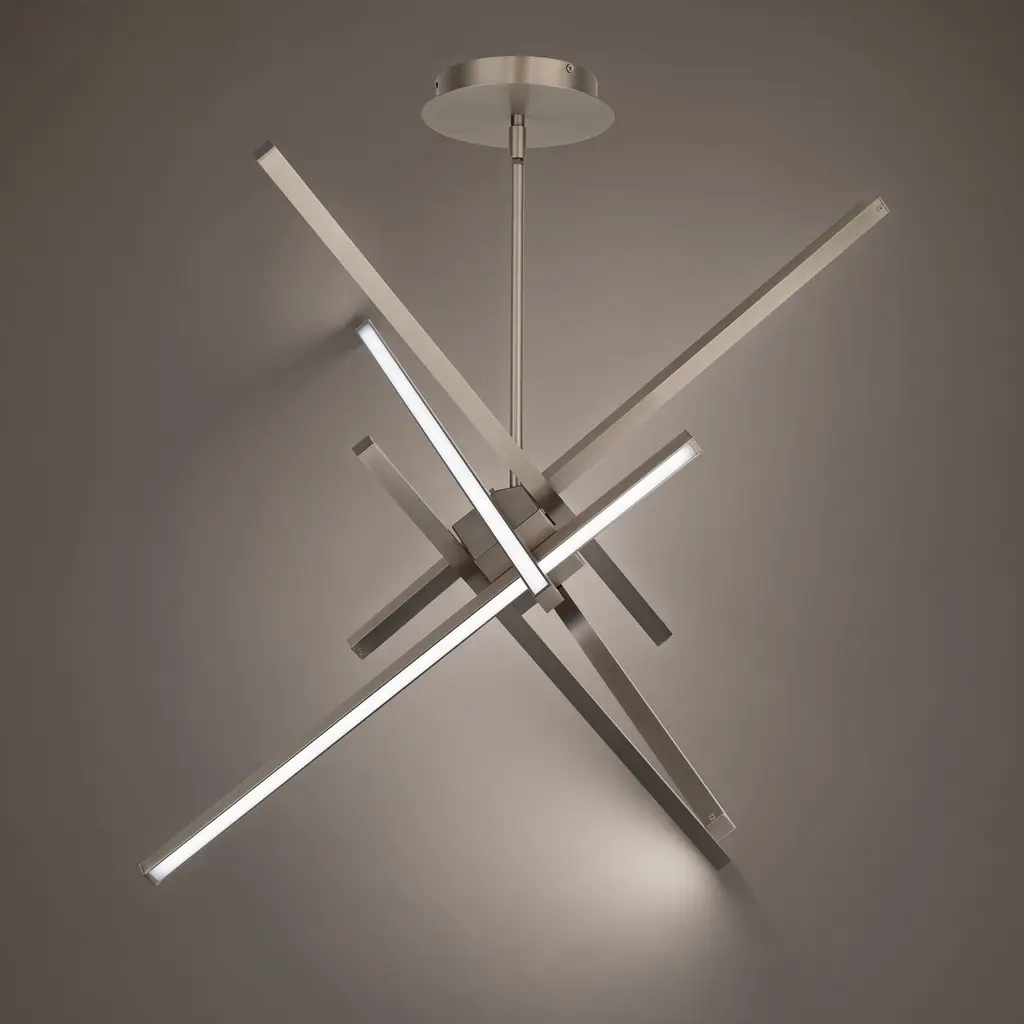 A multi-linear sculpted structure with lean minimal lines. Artisanal quality and attention to detail with a truly distinctive modern mix of luminous conduits. The parallax pendant is a modern minimalist fixture featuring rotatable light bars for onsite customizations to create different looks and light delivery. Offered in a 26in or 38in horizontal diameter in black, brushed nickel and aged brass finishes, this pendant makes a bright point in any modern space. Parallax is effortlessly deliberate. Each arm is illuminated along the entire length with energy-efficient integrated LED's providing a long-lasting maintenance-free bright and even illumination. The choice of three handsome finishes create a stunning contrast between light and fixture.