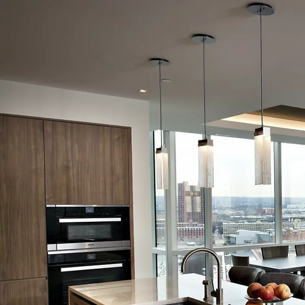 The Parallel LED Mini Pendant by Hammerton Studio reminds us that two is often better than one with its luxurious pair of handcrafted, kiln-fused, textured glass panels. These panels are capped at the top by a finished metal insert containing a Cree brand integrated LED. When on, light radiates both down through the gaps in panels and out through the panels themselves, creating dazzling multi-faceted display.