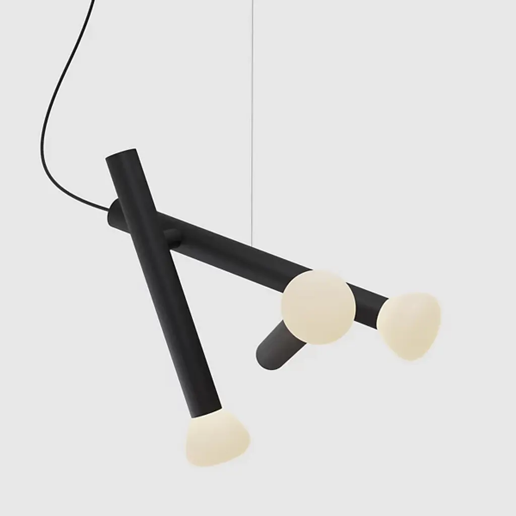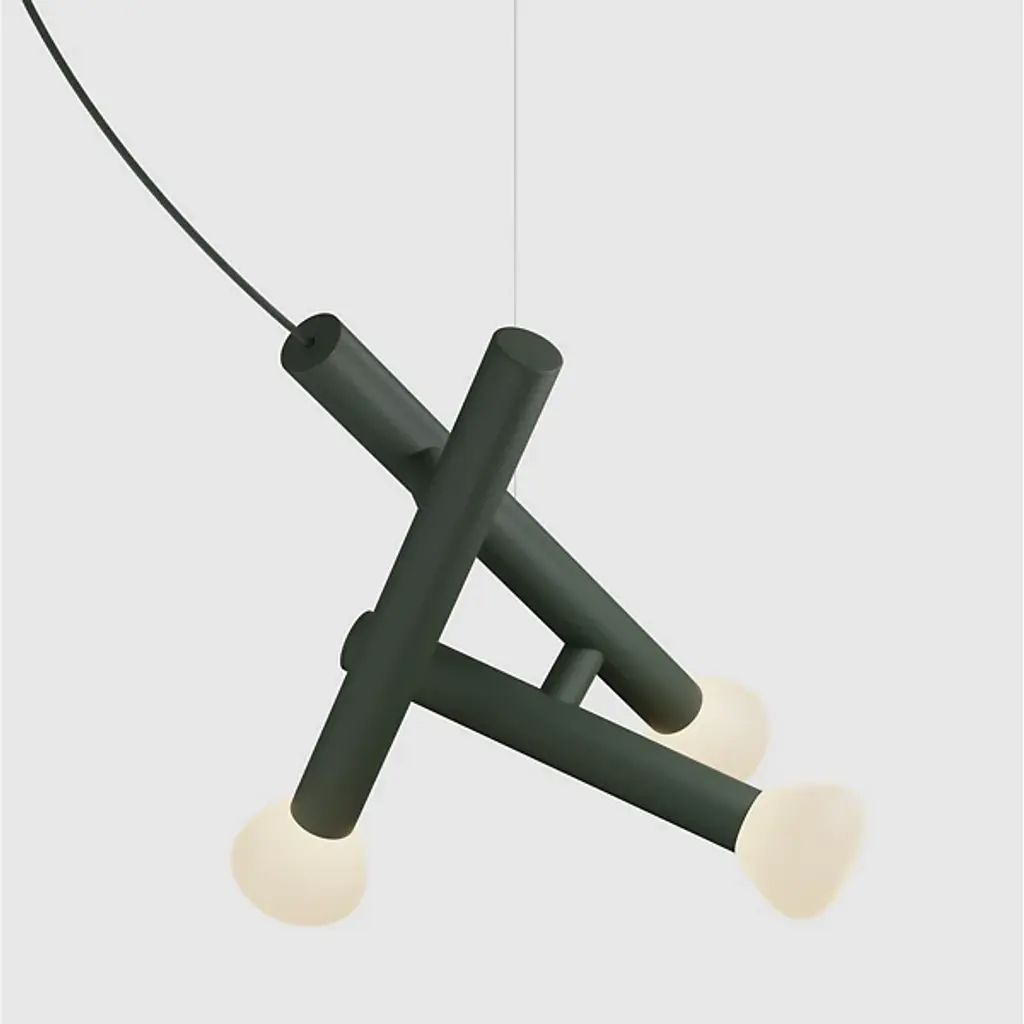 Movement, playfulness, and creativity define the childhood-inspired design of the Parc 04 Trio Pendant from Lambert & Fils. Adrien Rovero champions a keen observation of details and focus on his surroundings’ needs with each creation. With this free-flowing piece, Rovero invites one to recall makeshift childhood structures conjured from simple found objects. Hanging with fine cords, aluminum bodies descend with an exciting angular silhouette. Their slender shapes combine with the tapered handblown glass shades to reference the classic flashlight. These gem-like shades face towards each of one’s walls to mellow light into a spacious glow.