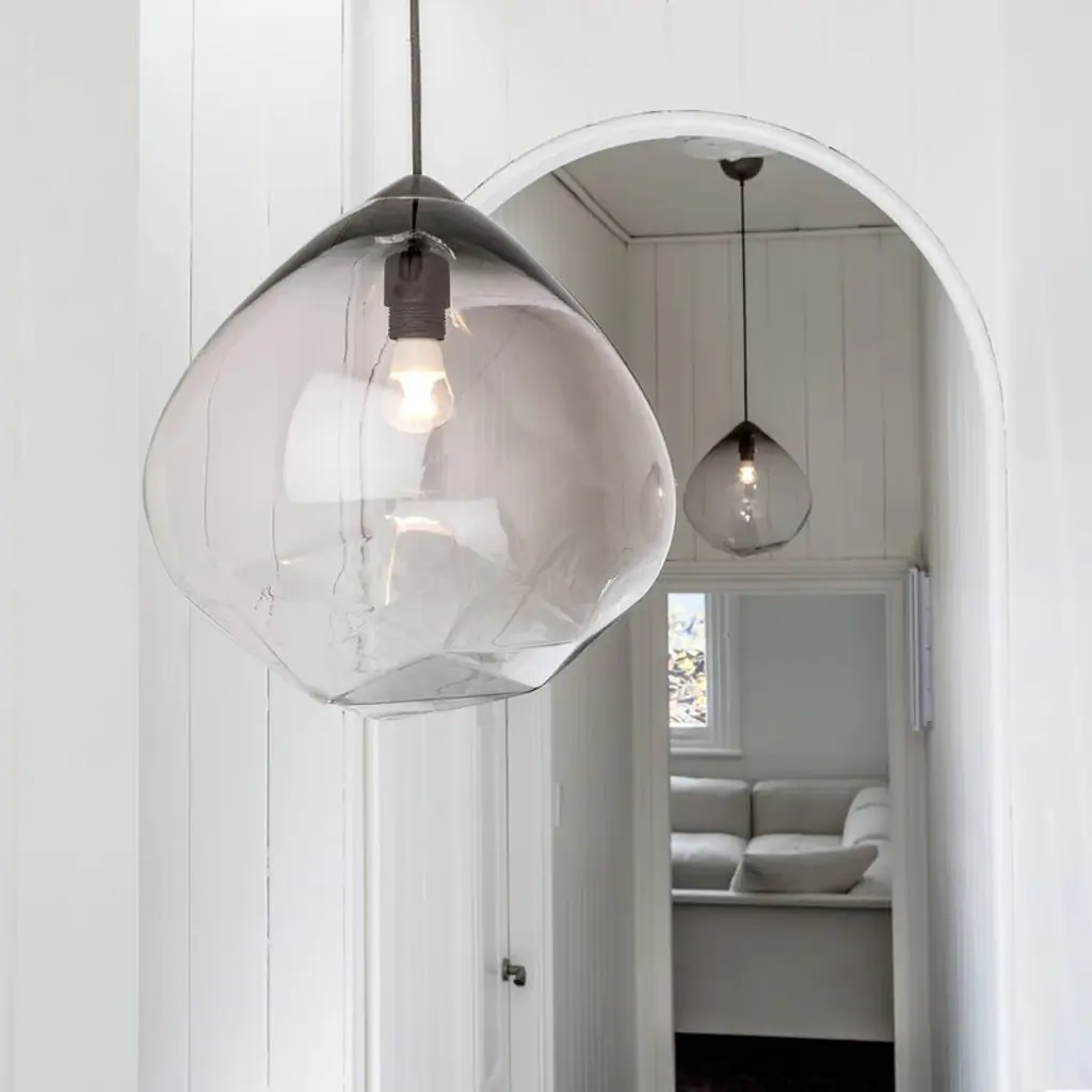 Parison is a glass pendant, mouth blown from a mixture of colored and clear glass. It’s surface is a consistent gradient of opaque Black or White at the top, to transparent at the base. The underside surface contains slanted facets, creating a beautiful contradiction between fluid and jagged. Housed in the neck of the pendant, an LED bulb creates a soft warm glowing fixture. Ideal for home or contract use. Features