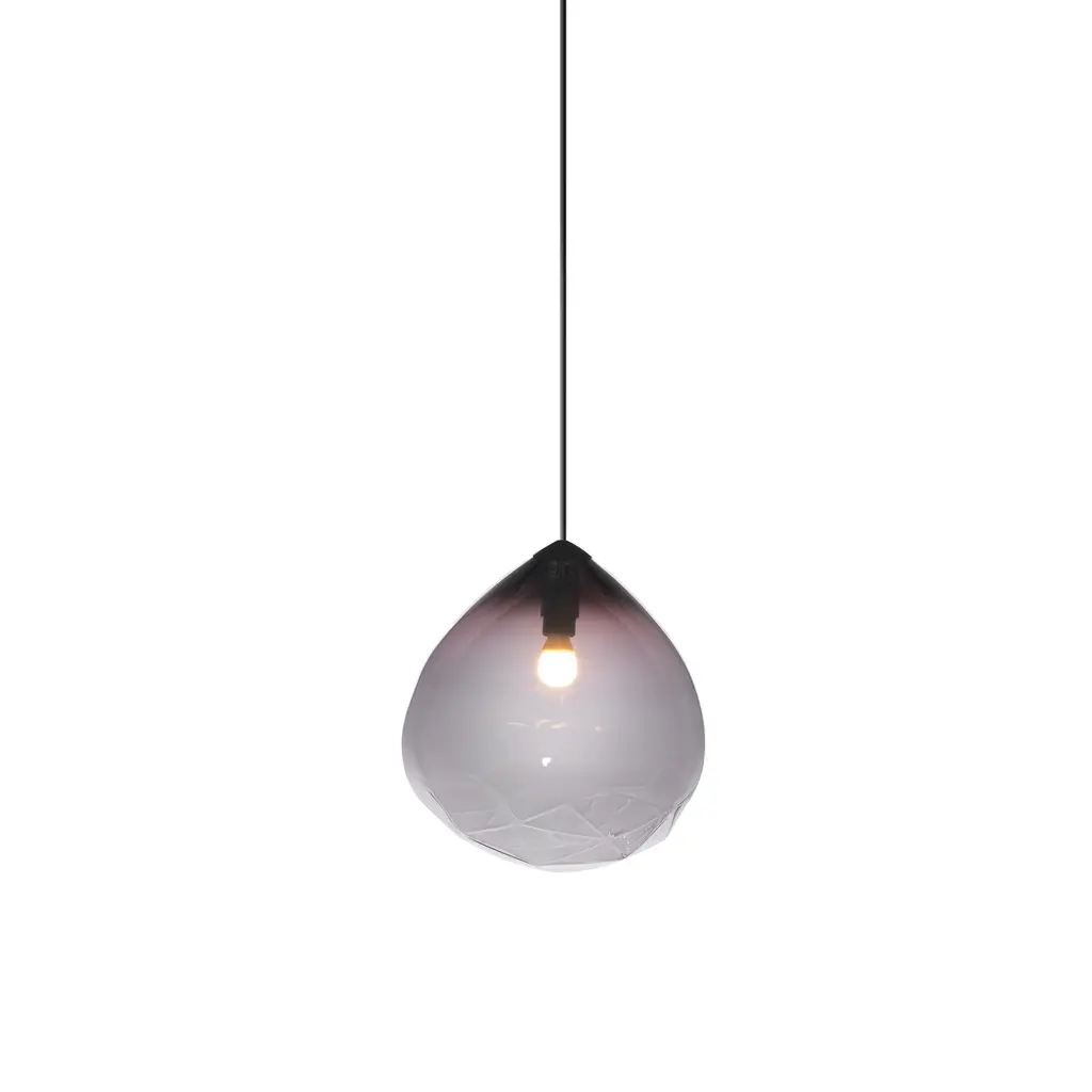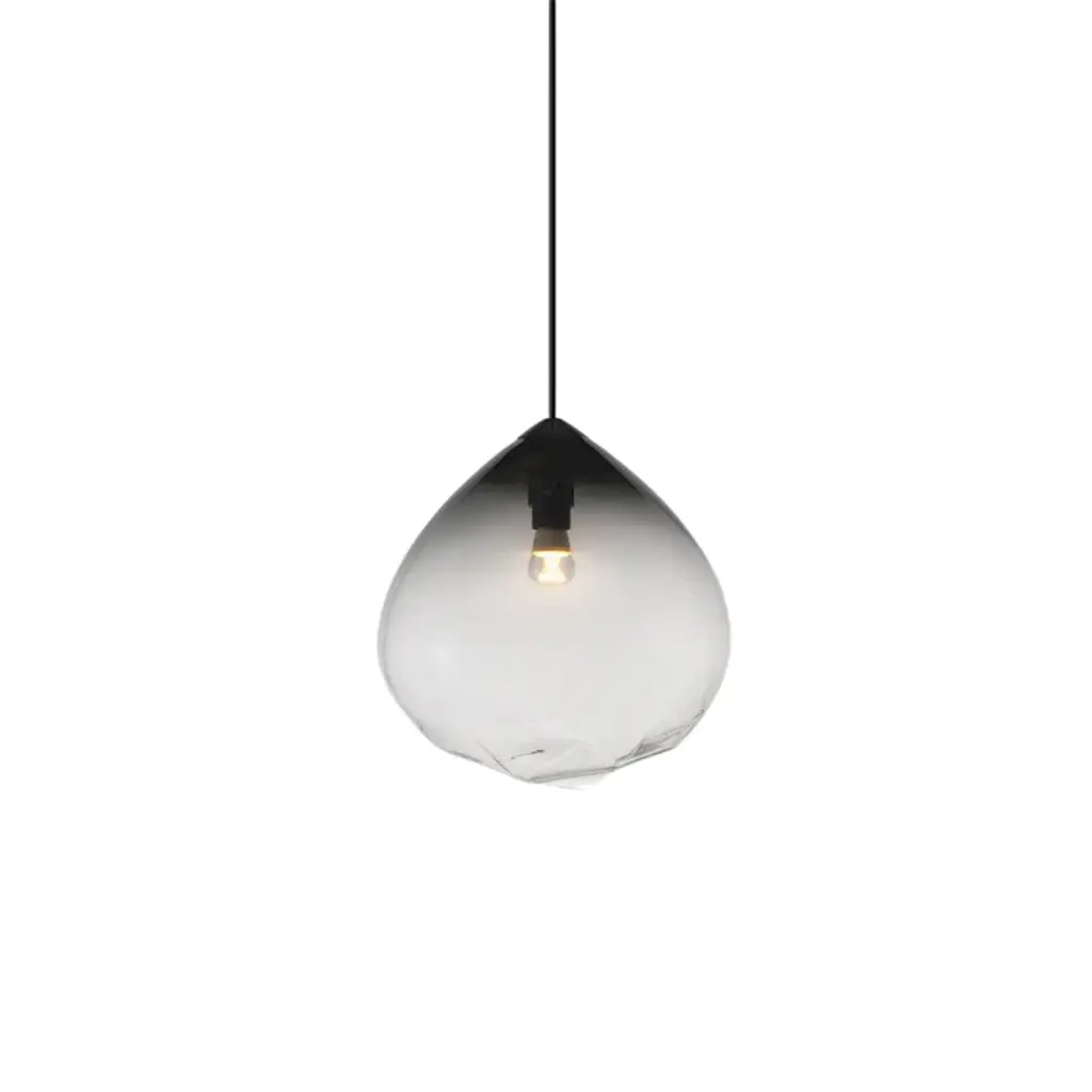 Parison is a glass pendant, mouth blown from a mixture of colored and clear glass. It’s surface is a consistent gradient of opaque Black or White at the top, to transparent at the base. The underside surface contains slanted facets, creating a beautiful contradiction between fluid and jagged. Housed in the neck of the pendant, an LED bulb creates a soft warm glowing fixture. Ideal for home or contract use. Features