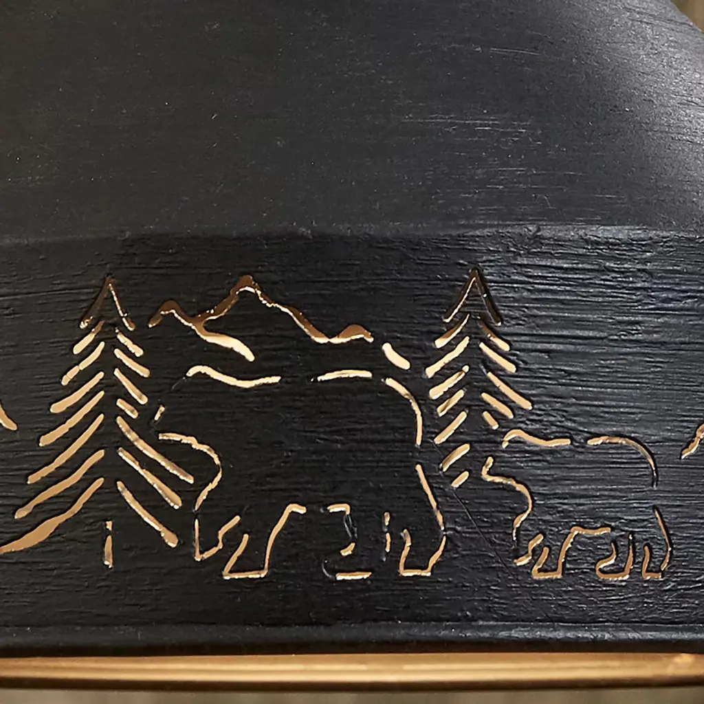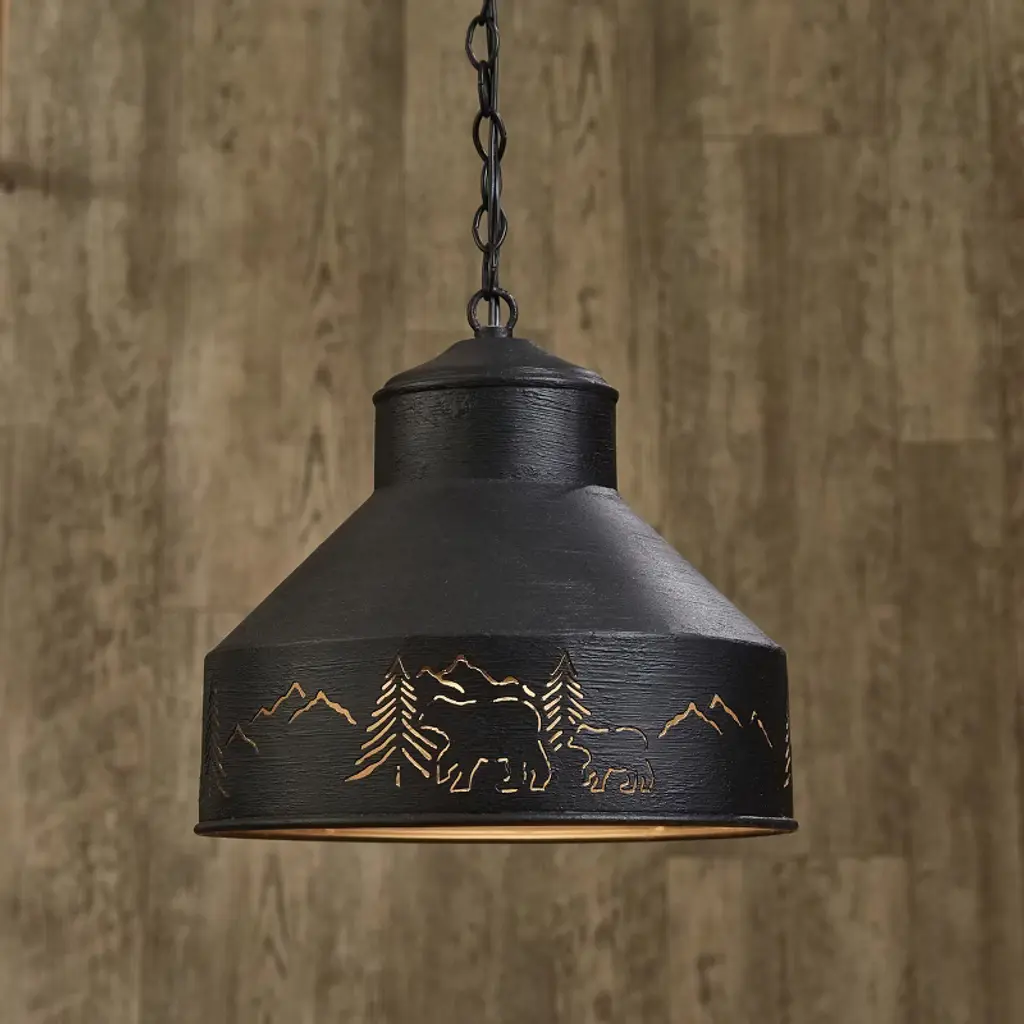 This bear light pendant will perfectly blend in a rustic farmhouse or lodge cabin home with its lovely forest and bear cutouts. Features cut-out tree and mountain scenic detailing paired by stylized paintbrush strokes in a black finish. With 3 feet of adjustable chain combined by 7 feet of cording and a coordinating ceiling plate, this suspended light pendant can be easily hard wired to any desired ceiling. Pair this ceiling light with a 60 Watt bulb for full effect, not included.