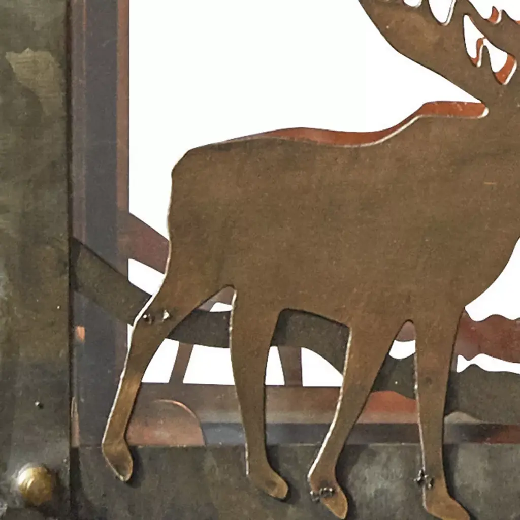This bear light pendant will perfectly blend in a country farmhouse or lodge cabin home with its outdoorsy forest cutouts. Features copper bear and moose cut-out designs along with a variety of trees and mountain scenic detailing framed by a galvanized silver metal construction. With 3 feet of adjustable chain combined by 7 feet of cording and a coordinating ceiling plate, this suspended light pendant can be easily hard wired to any desired ceiling. Pair this rustic ceiling light with a 60 Watt bulb for full effect, not included.