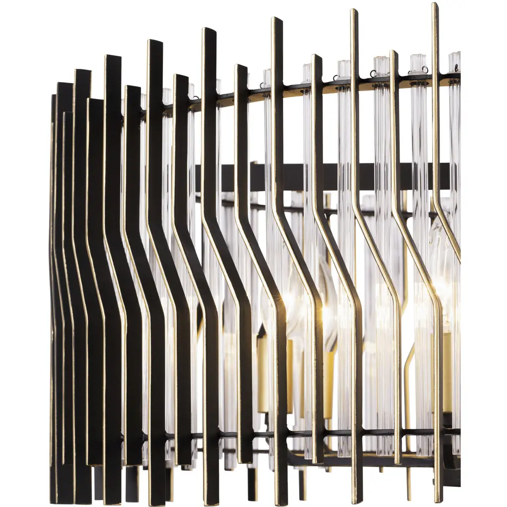 Inspired by the elements of New York City’s Brooklyn Bridge as depicted in an illustration found in Smithsonian American Art Museum, the Park Row collection is sure to bridge the gap between functionality and inspired design. The Brooklyn Bridge’s neo-Gothic stone towers support a hybrid cable-stayed/suspension bridge design, with both vertical and diagonal suspender cables, which are the inspiration for Park Row. The interwoven cables create a repeating pattern that we have wrapped around and support modern clear fluted, recycled glass rods. The collection is hand-forged from 70% recycled steel. Hand-finished in matte black with French Gold edges.