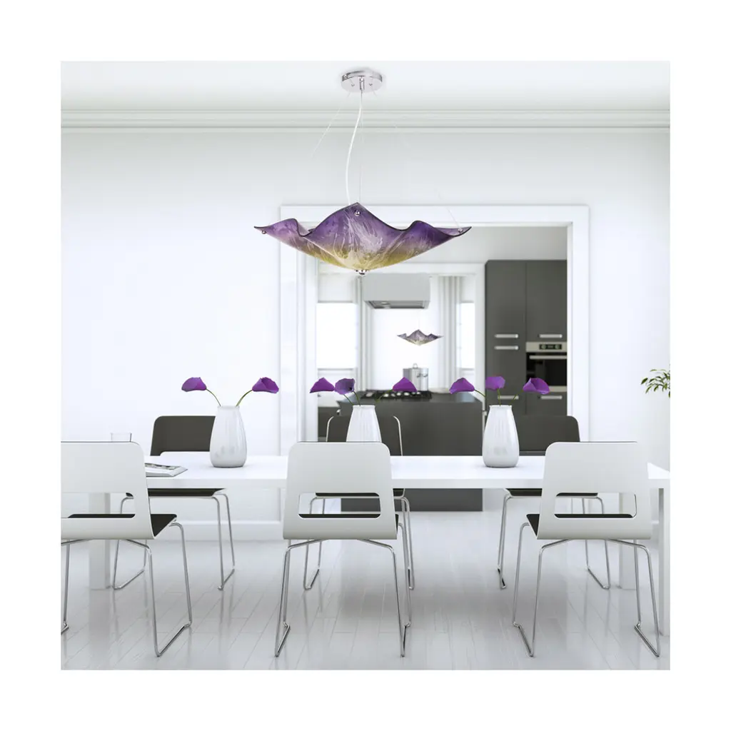 Make waves in any room with the three-light Van Teal Passionate Chandelier in a soft Violet Web hue. This minimalist chandelier maintains a clean, modern flow that's slightly softened by the rippling design of the shade. The sleek, sturdy frame is finished in gleaming chrome to top off your décor with a hint of polished sophistication. This pendant requires (3) 100 Watt Incandescent or 16 Watt LED equivalent bulbs (not included). Comes with a one year limited manufacturer's warranty.