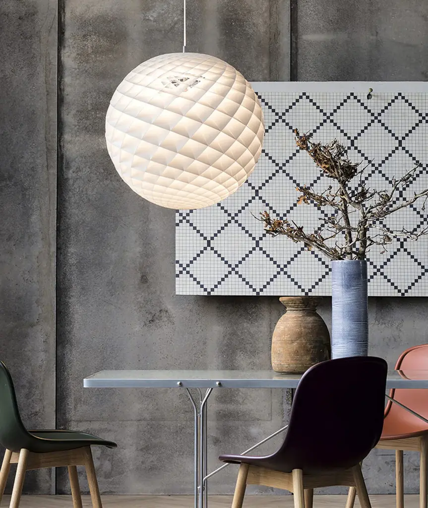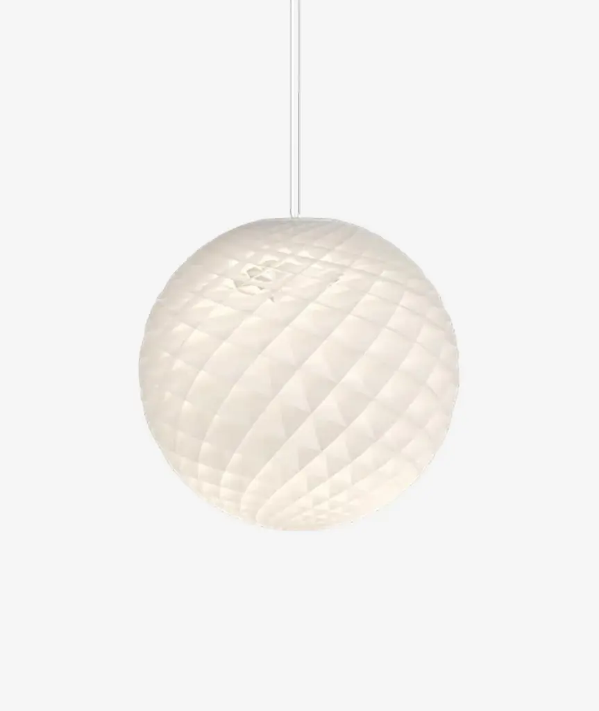 This pendant is a glowing sphere built up of small diamond-shaped cells. Each cell is carefully designed to capture light and to shield the light source from the viewing angles above 45 degrees. Each cell glows. Below 45 degrees, the fields are open to direct light downwards. A small amount of light is also sent upwards to illuminate the ceiling.