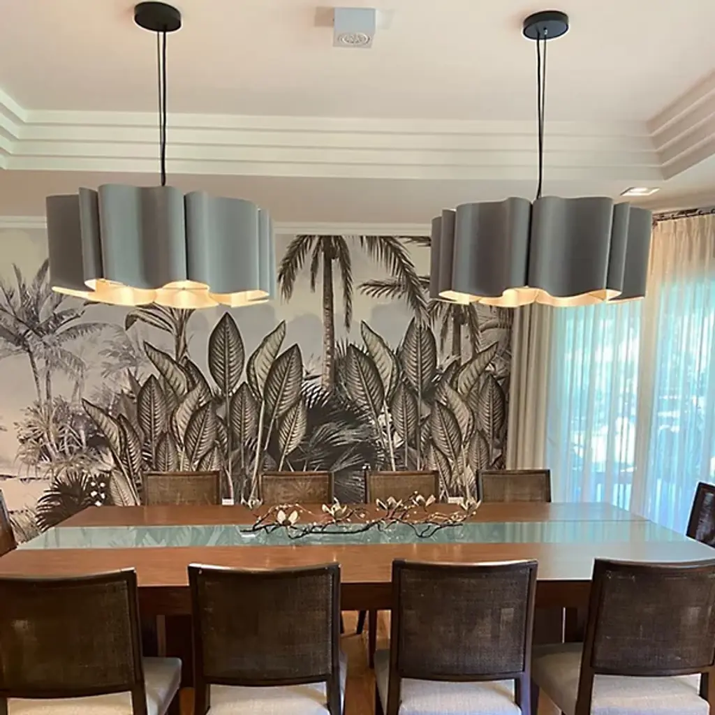 Natural modern lighting with plenty of sophistication, the Paulina Drum Pendant by Bruck Lighting offers a curvy and unexpectedly glamorous twist on the classic drum pendant. It is crafted by bending and connecting several panels of flexible, yet strong, Reconstructed Wood Veneer. The unique lines of the shade, along with the natural material used, are inspired by diverse natural landscapes. As part of the Wood Ecological Project (WEP), this pendant adds a warm glow and a pleasingly natural design element to a large, elegant dining table.