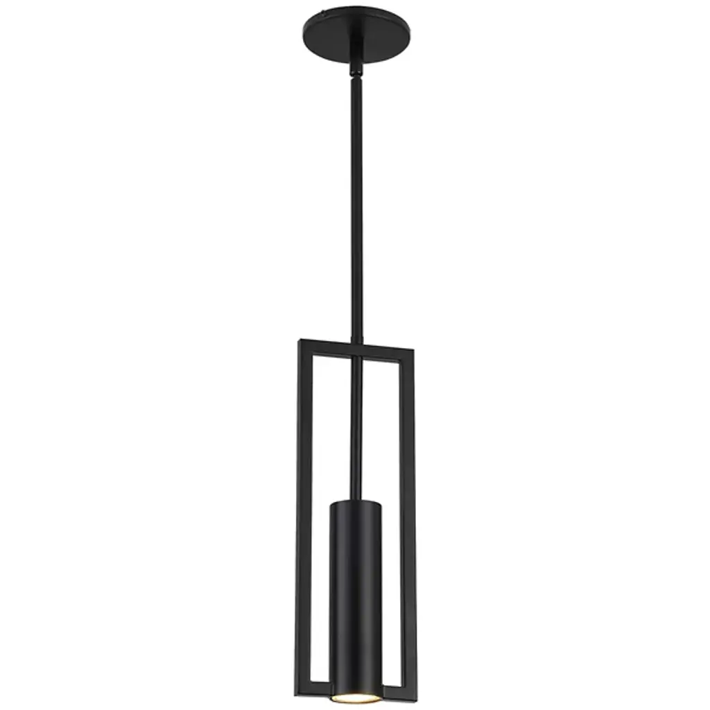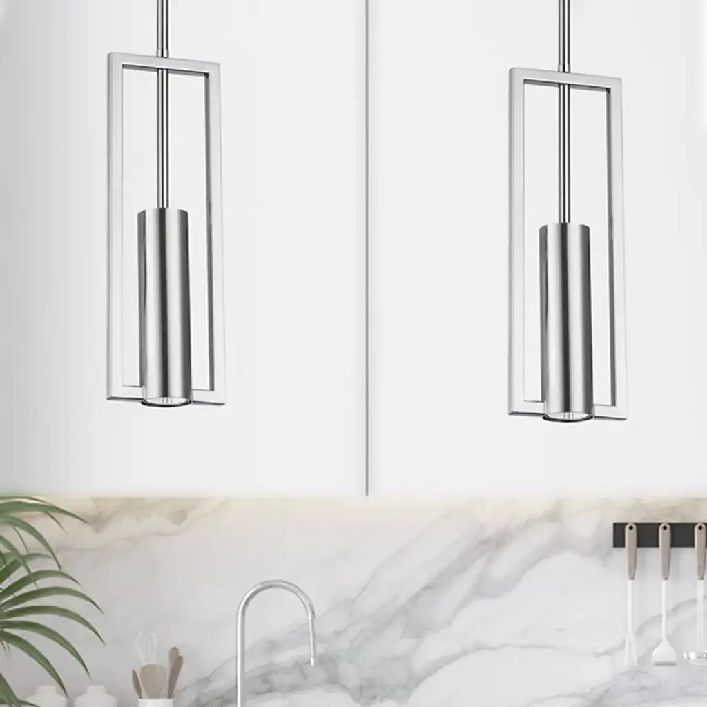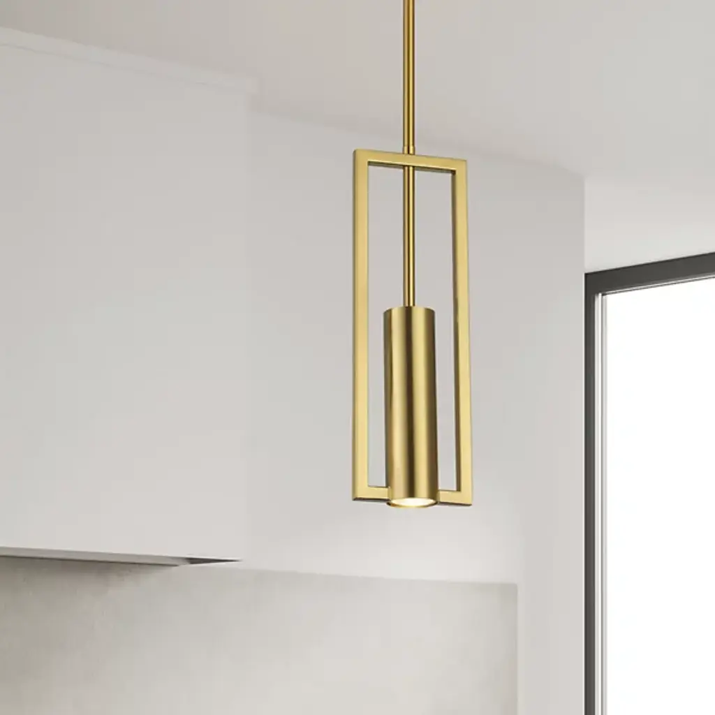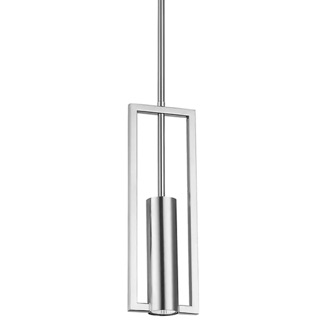 Finely framed and perfectly pointed pendant lighting. The Pauline Mini Pendant by Dainolite features a focused downlight housed in a cylindrical metal holder. A rectangular frame around the cylinder and support stem continues the geometrically precise design and gives it greater drama and presence in modern settings. The bright spotlight and clean design of this pendant make it a great option singly or in row over a kitchen island or dining table.