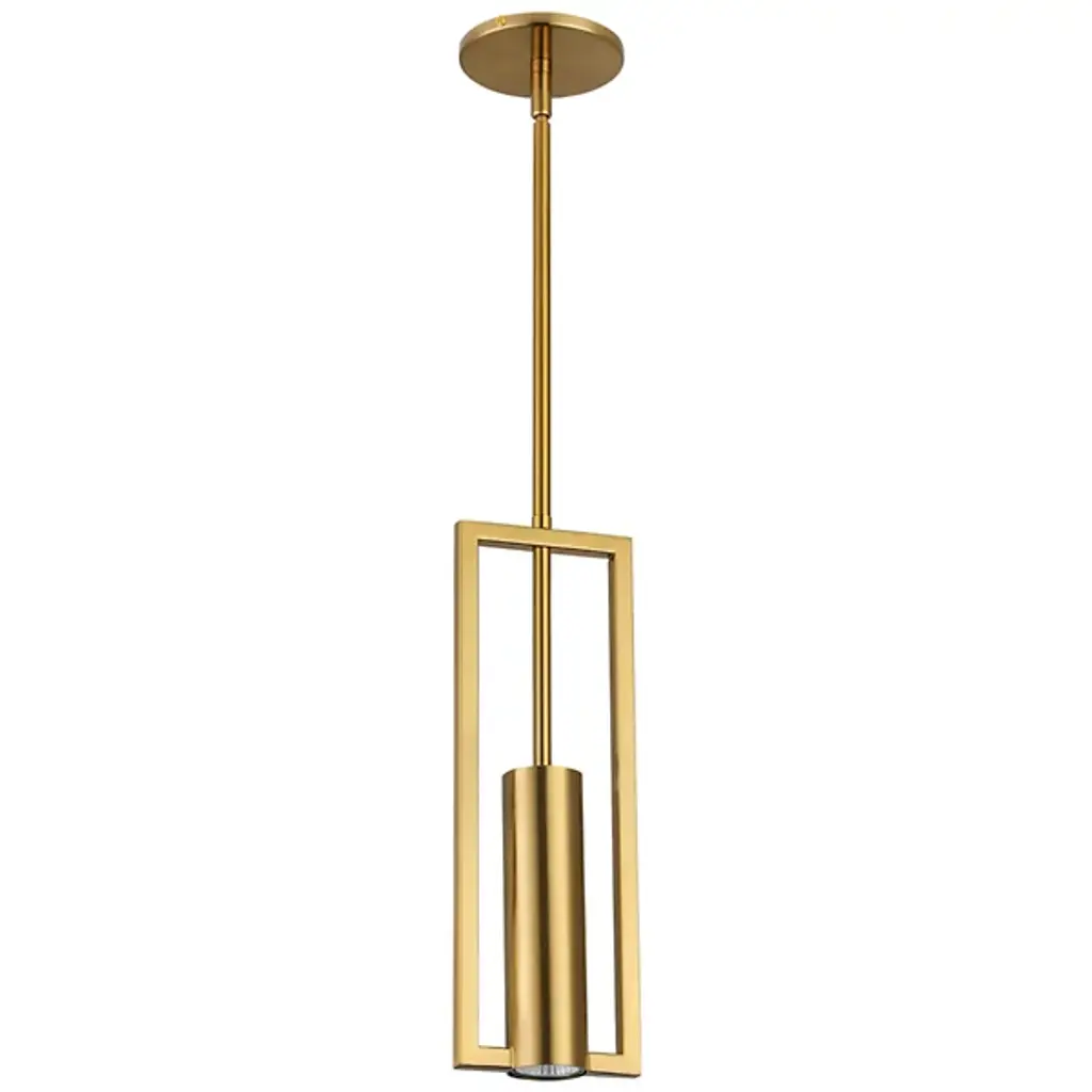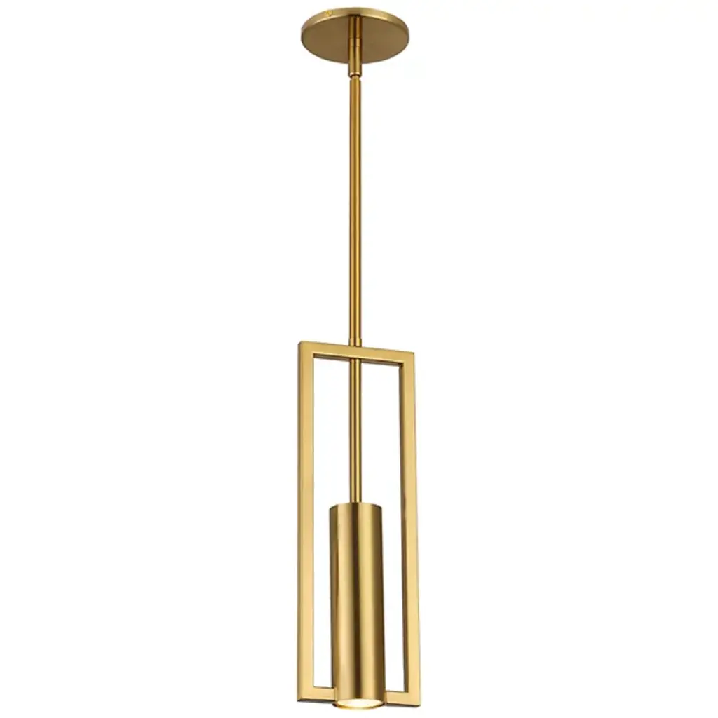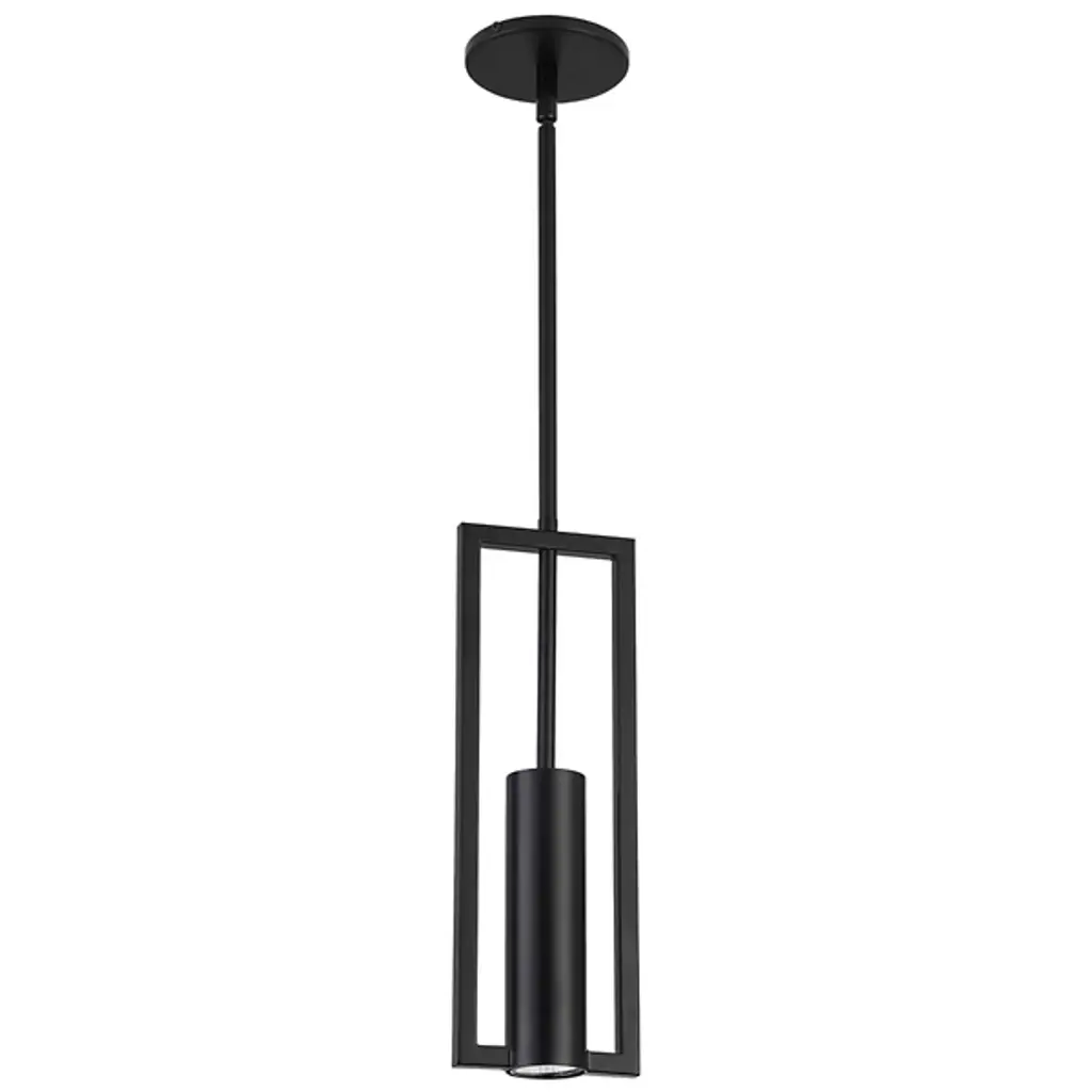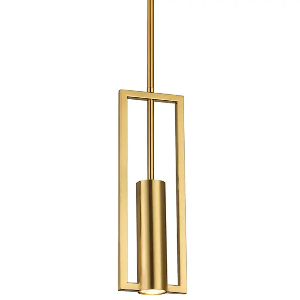 Finely framed and perfectly pointed pendant lighting. The Pauline Mini Pendant by Dainolite features a focused downlight housed in a cylindrical metal holder. A rectangular frame around the cylinder and support stem continues the geometrically precise design and gives it greater drama and presence in modern settings. The bright spotlight and clean design of this pendant make it a great option singly or in row over a kitchen island or dining table.