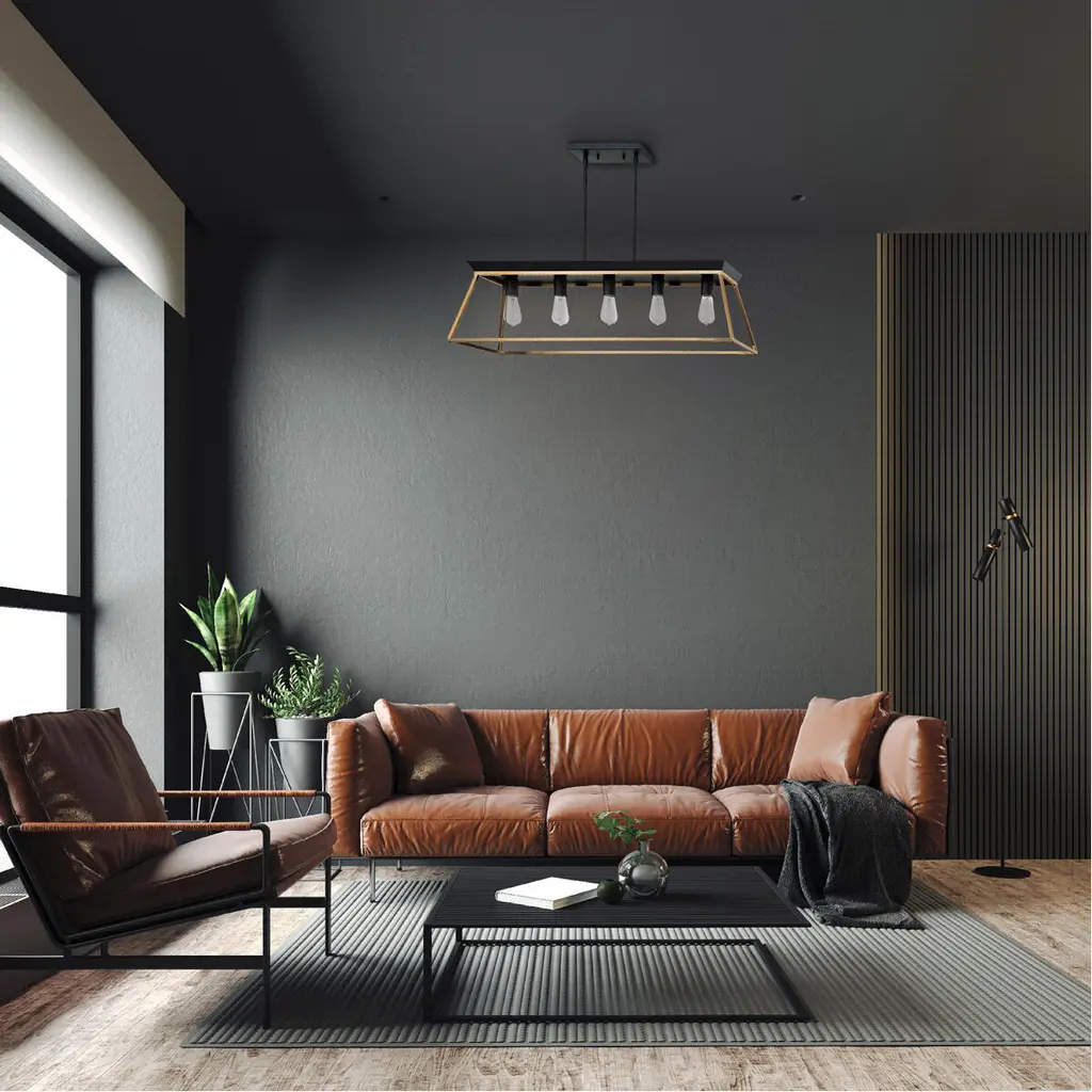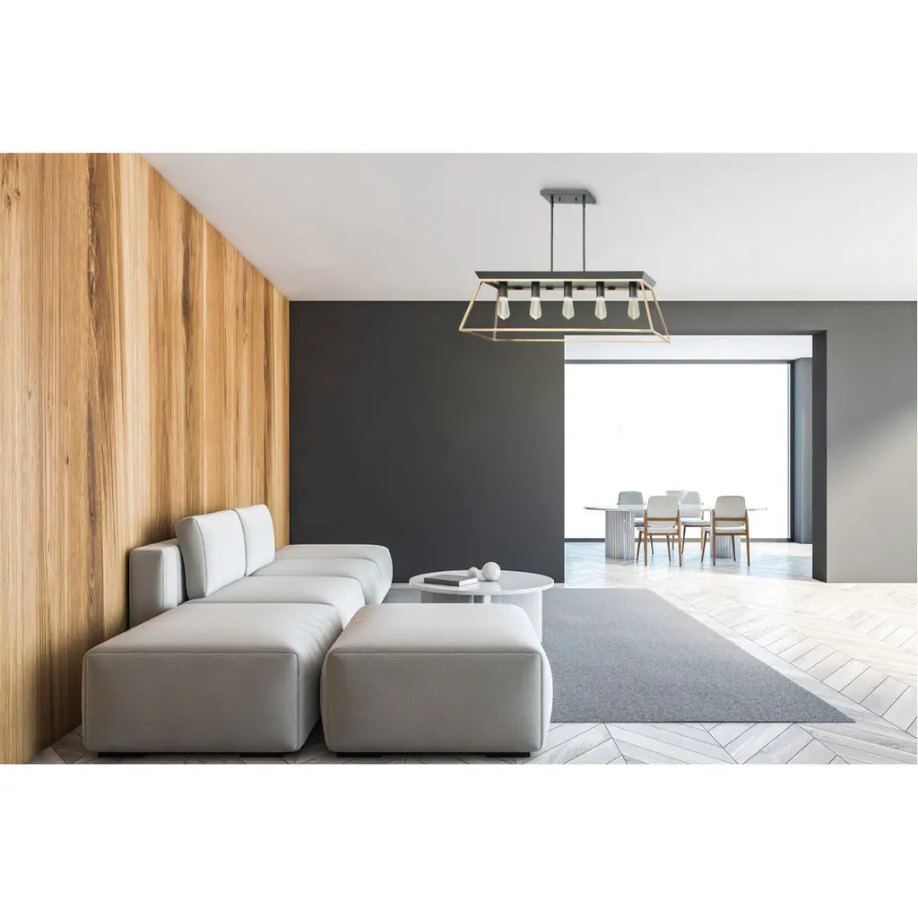 Eglo's Paulino Family is exquisite in style. This 5-light pendantfeatures a trapezoidal shade with brushed gold and matte black finish nesting 4 dark brownbulb holders. it is sure to complement the interior decor and set the tone of the room. Greatfor bedroom, office, living room, hallway, dining room, etc.