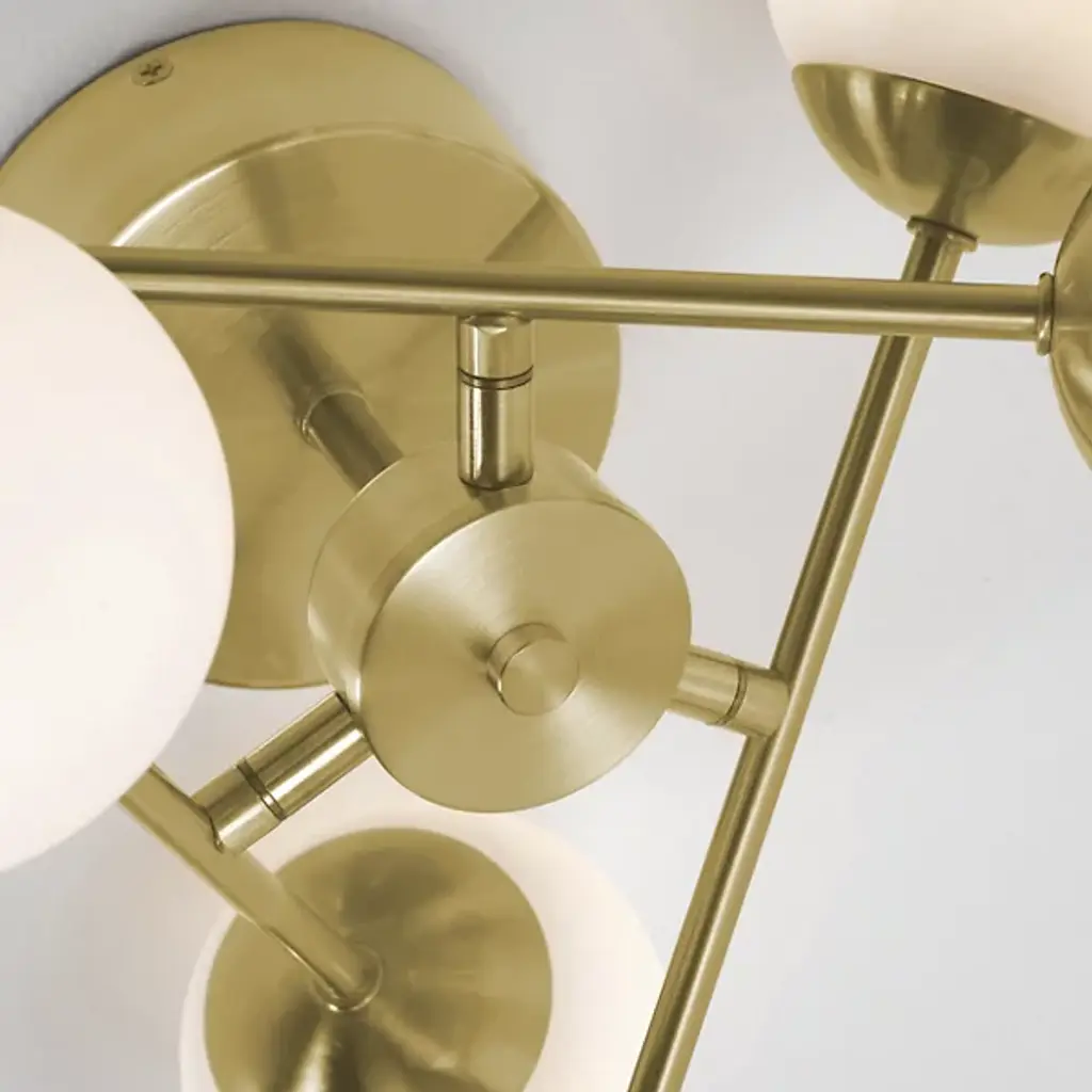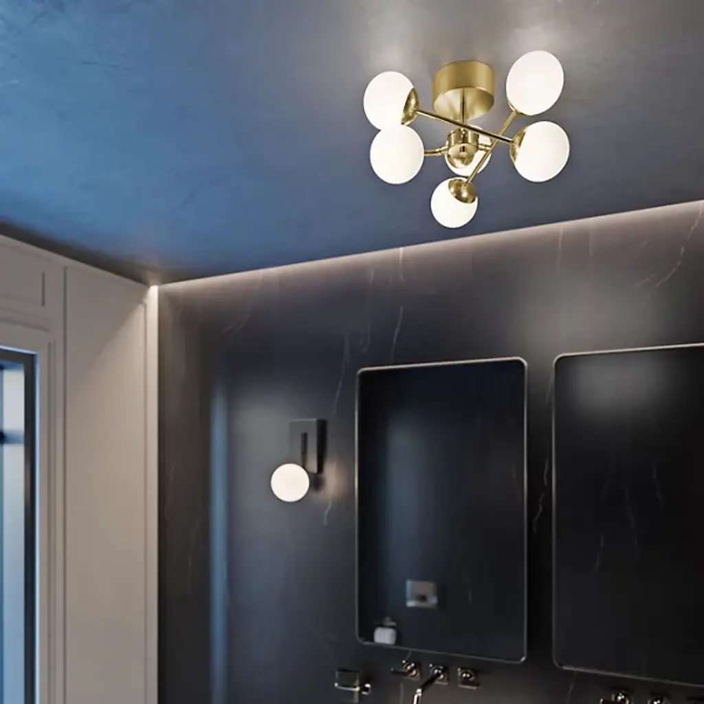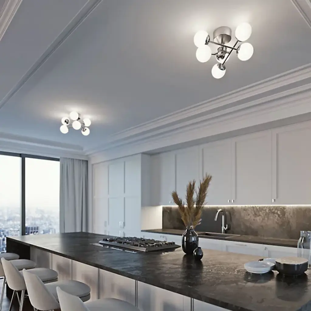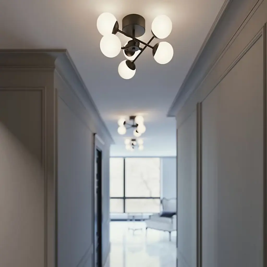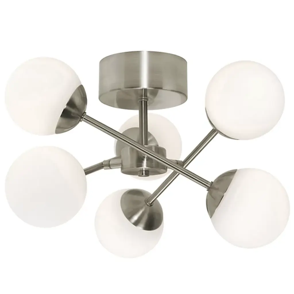 An effortlessly effervescent, modern lighting design. The Pearl LED Semi-Flushmount by AFX is a dynamic piece, with soft-looking glass spheres balanced at either end of steel rods, which are themselves arranged in a tilting configuration around the central hub. In addition to their generally bubbly aesthetic, the shades evenly diffuse the plentiful ambient light produced by the integrated LEDs housed within. This semi-flushmount is a great way to both brighten and add style to an entryway or hallway.
