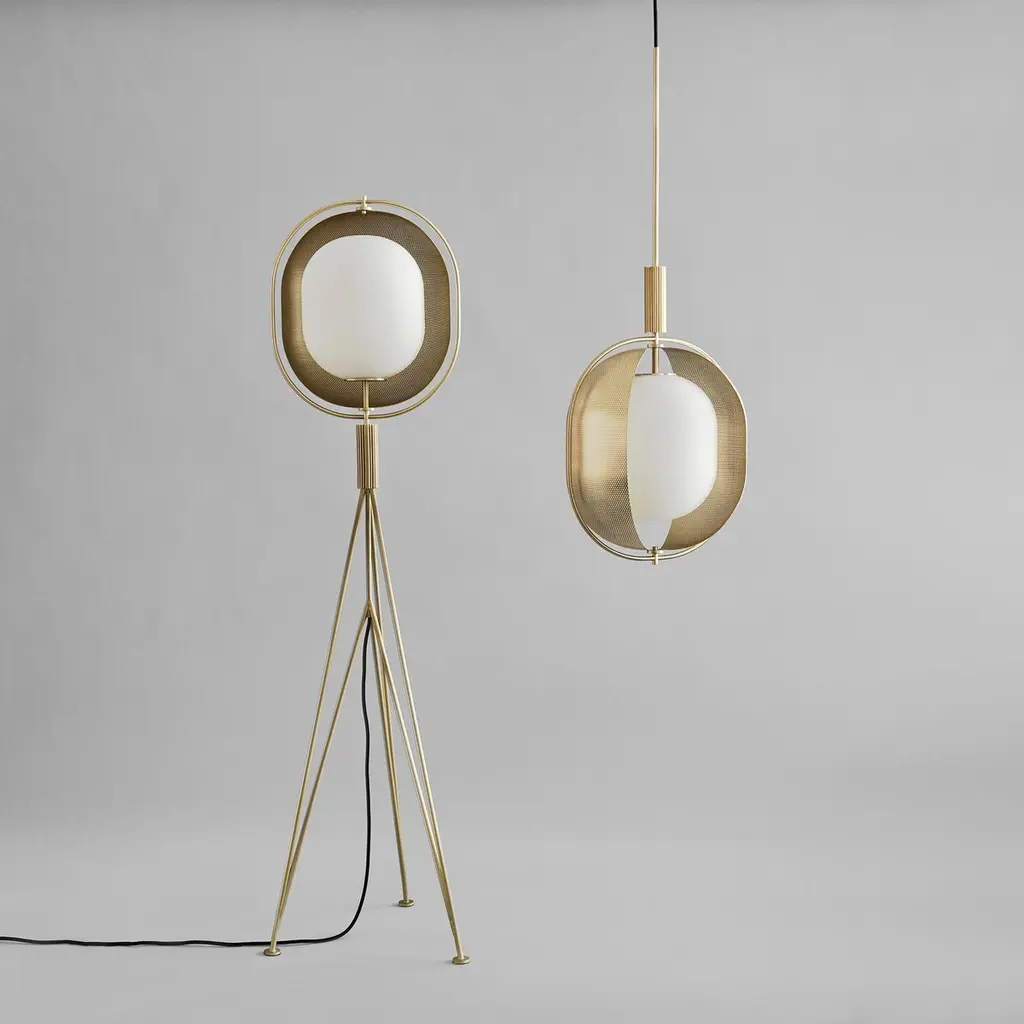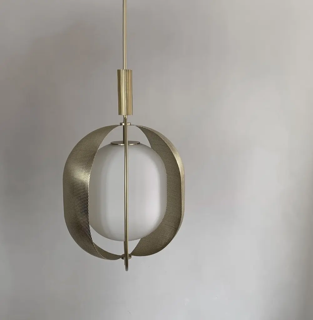 Pearl Pendant by 101 CopenhagenDesigned by Kristian Sofus Hansen & Tommy Hyldahl.Dimensions: L 35 x W 35 x H 54,5 cmThis product is not wired for USAMaterials: All metal parts incl. frame, lampshade, ceiling cup, screws etc. are made of 100% iron. All visible components have a plated brass finish. Opal glass / White; Cable: Fabric covered cable / BlackPearl is a family of lamps inspired by ancient Japanese lanterns. The lantern shaped light source of opal glass, is half hidden behind a flexible metal screen.The flexible screen of perforated metal filters the light, and can be turned around to create specific and unique atmospheres. The lampshades are mounted to an elegantly constructed metal frame, adding a certain lightness to the lamp.Pear is made of plated metal and comes in a pendant and floor lamp.101 Copenhagen is a Danish design brand founded in 2017. With a vision to honor exquisite quality and craftsmanship, the collection encompasses furniture, lighting and accessories in a timeless, yet modern design. With a true passion for materials and refined textures, organic shapes and colours, 101 Copenhagen presents the epitome of classics and must-have novelties for Scandinavian and international interior connoisseurs alike.