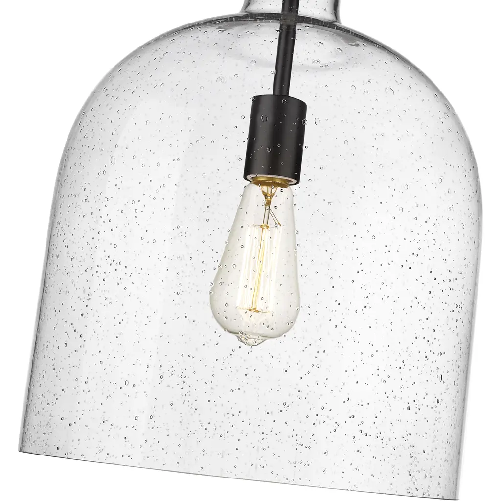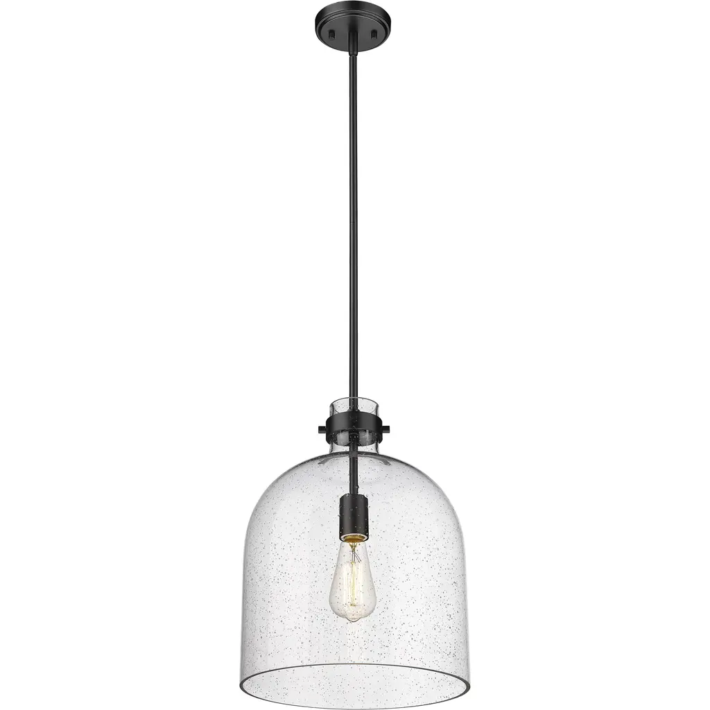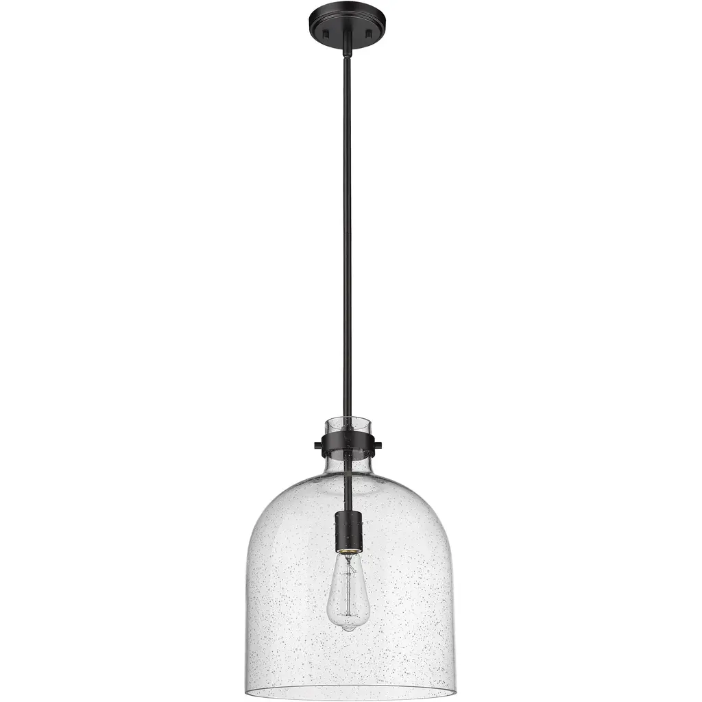 A one-light chandelier is sure to freshen up the ambiance of any dining room or kitchen area. The crisp and clean design features a dome shape seedy glass shade, steel construction and a matte black finish. This fixture is sure to serve as the centerpiece for modern and farmhouse spaces.