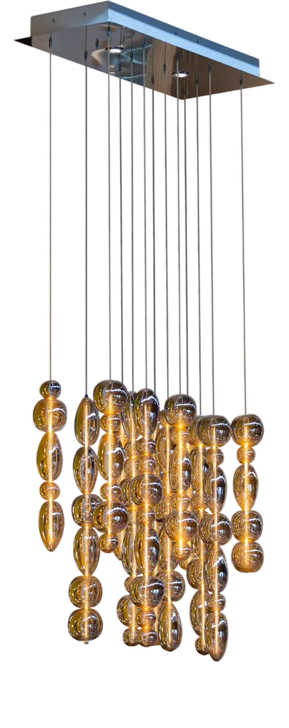 As if naturally formed from the ebbing shores of a riverbed, smooth and irregularly shaped crystal pebbles are suspended by cast metal clasps in a Polished Gold finish. Discreetly illuminated by concealed LED light sources within the clasps, additional downlight originates from LED GU10 lamps housed in a Matte Black canopy adding to the refracting iridescent shimmer on the crystal surface below. Available in multiple configurations of pendants as well as sconce options.