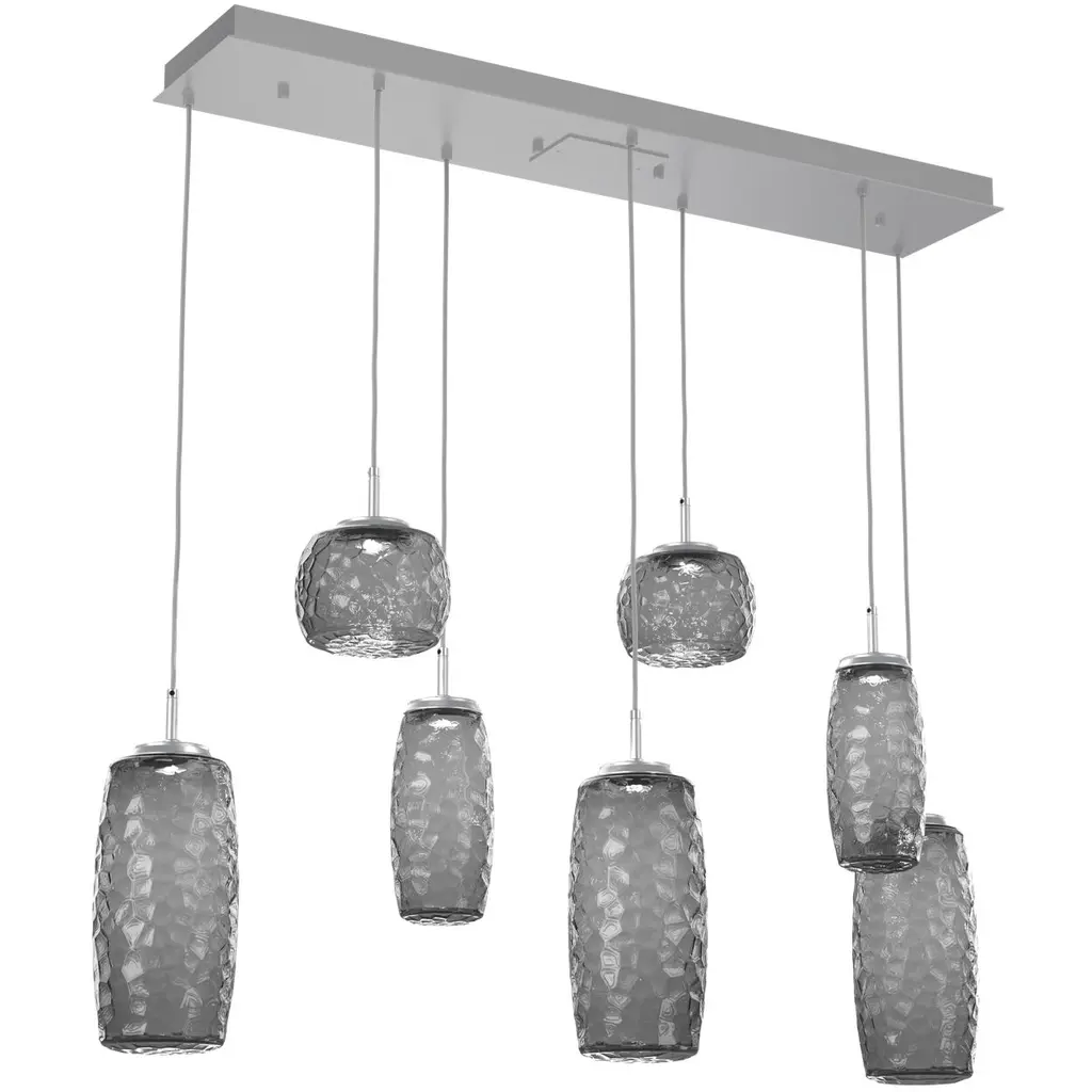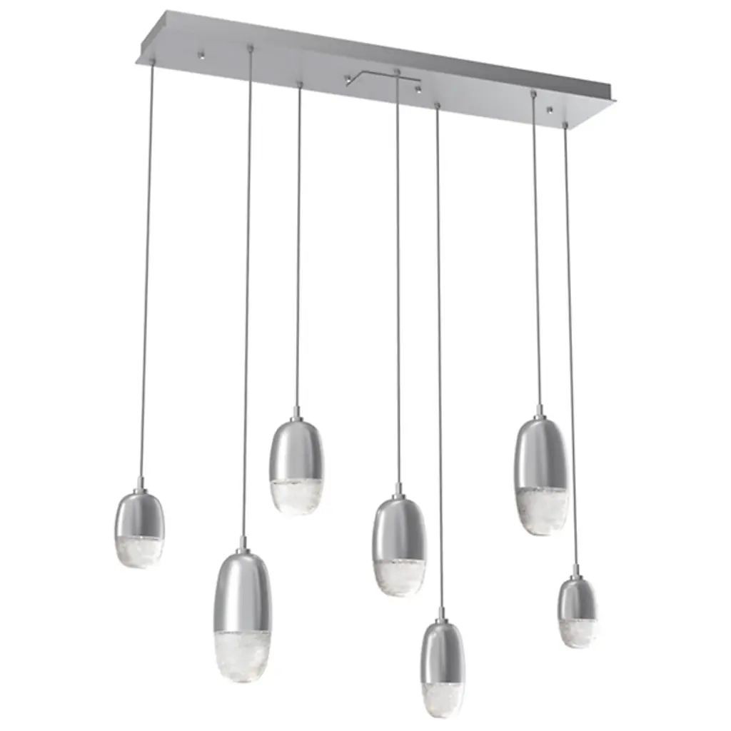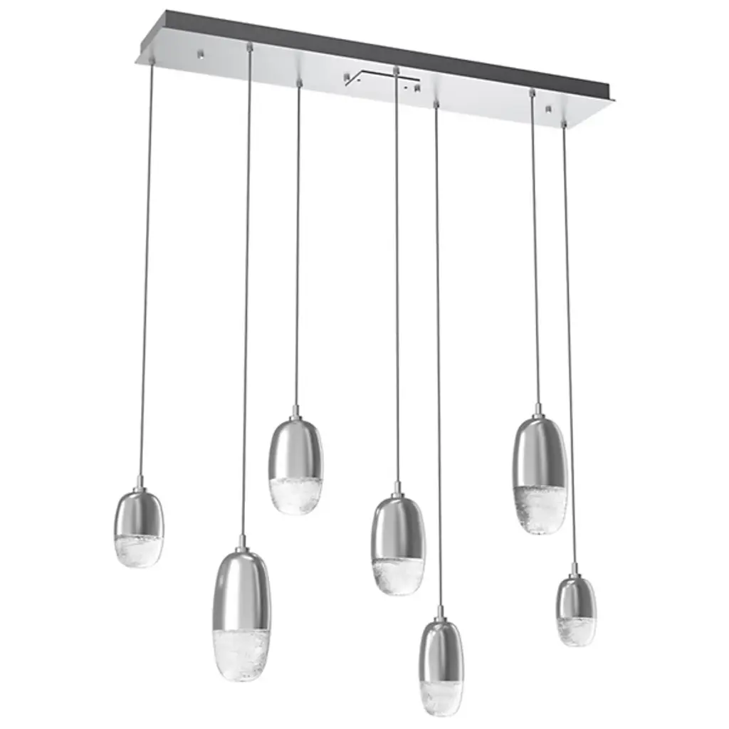 Bring unforgettable ambiance to interiors with the striking, graceful elegance of the Pebble LED Linear Multi-Light Pendant from Hammerton Studio. It's a versatile, expressive piece that pairs contemporary simplicity with a touch of soft, organic artistry. The design uses a stepped rectangular canopy to secure itself, sending down different lengths of slender wire to LED lamping set inside differently-sized aluminum housings. Artisan-cast glass diffusers below combine to form the silhouette of stylized pebbles. The translucent glass obscures direct glare, expressing an enduring, expressive warmth that reflects off the smooth metal structure around it.