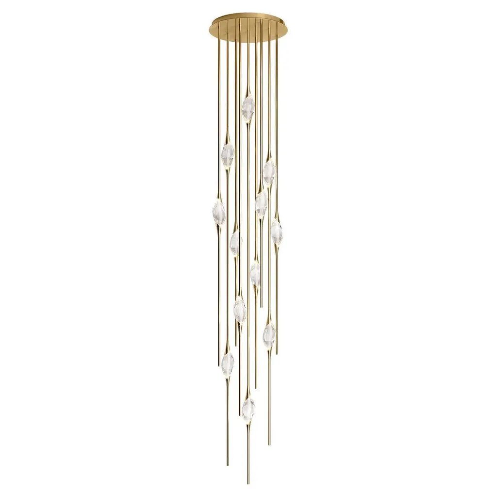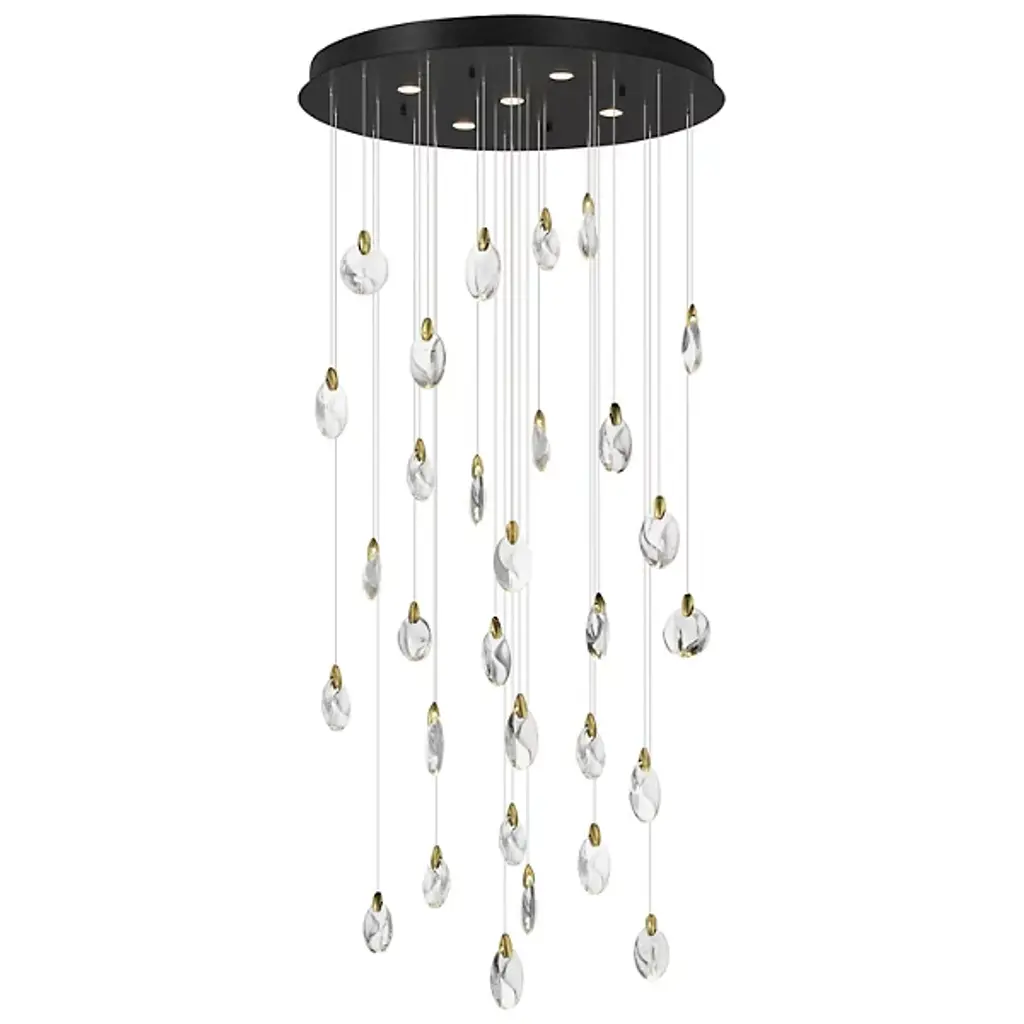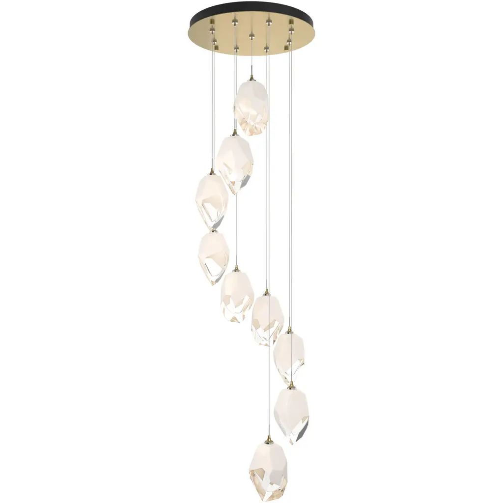 The Pebble LED Multi-Light Pendant from ET2 Lighting suspends irregularly shaped crystal elements that resemble water-smoothed stones found along riverbeds. Each crystal piece hangs at different lengths, creating a dynamic, nature-inspired composition. Light comes from two sources—hidden LEDs within the metal clasps that hold each crystal, plus additional lights housed in the canopy above. This pendant brings an organic, natural element to contemporary interiors, perfect for spaces where you want lighting that doubles as a conversation piece.