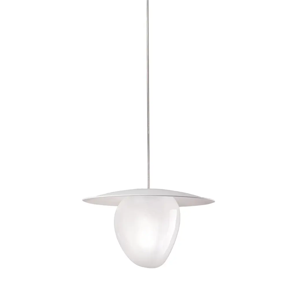 An exquisite example of contemporary style blended with naturalistic references - the pebble-shaped shade in transparent Murano glass - this pendant lamp makes for a delightful accent piece that goes beyond functionality. It offers a splendid decorative solution wherever it is placed, from walk-in closets to entryways. A matching disk tops the diffuser for increased functionality.