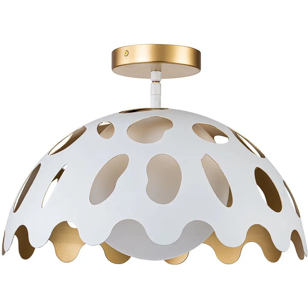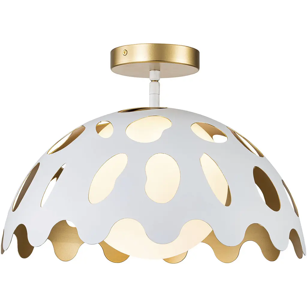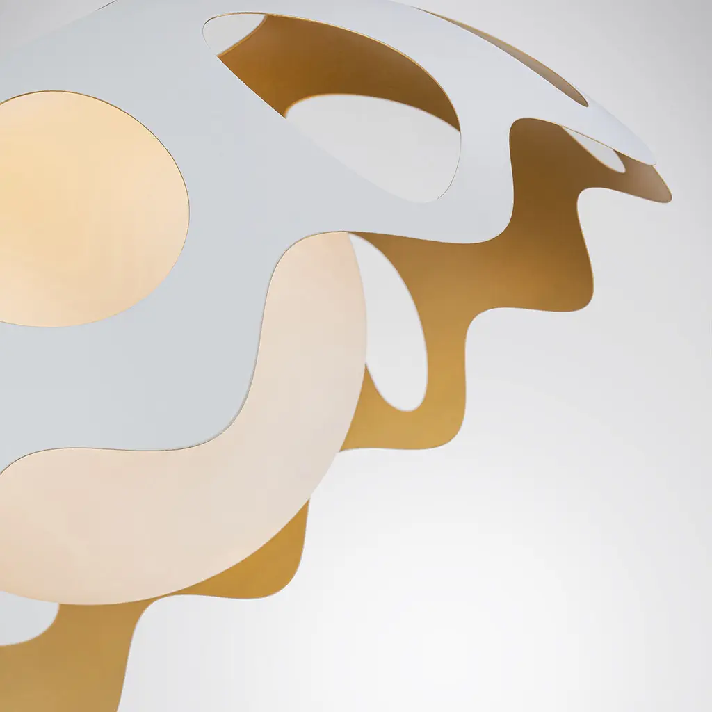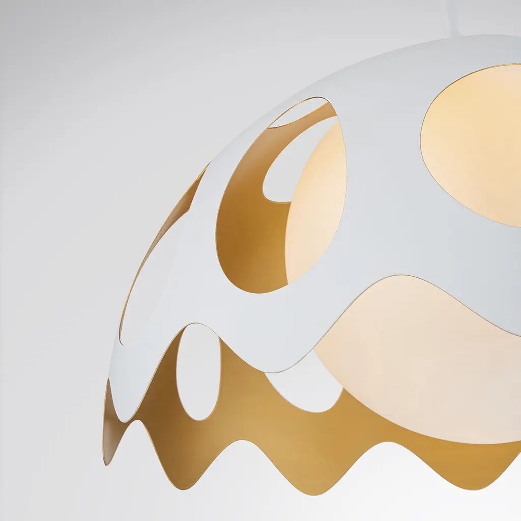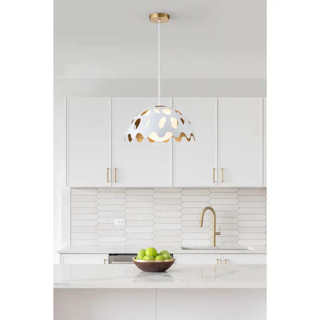 Pebbles 15" Pendant in White finish with Gold interior. The unique cut outs in the design are accentuated by a frosted glass globe that provides an even, clean down light. Adjustable height options allow for use as both a pendant and also closer to the