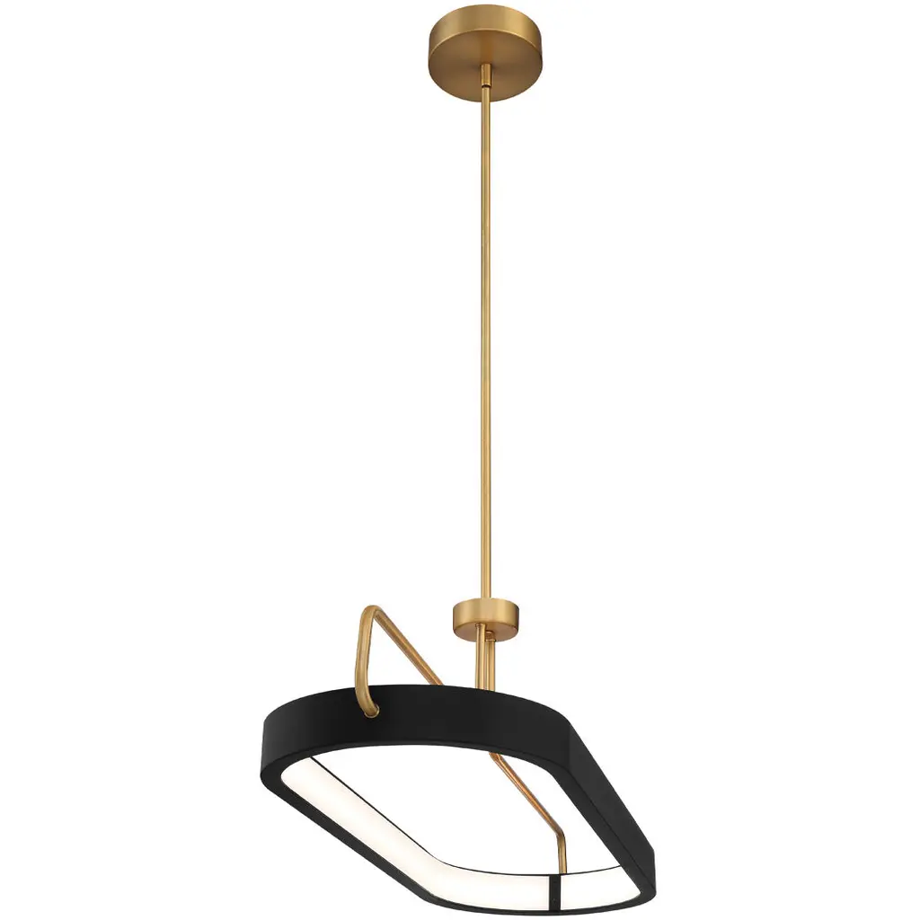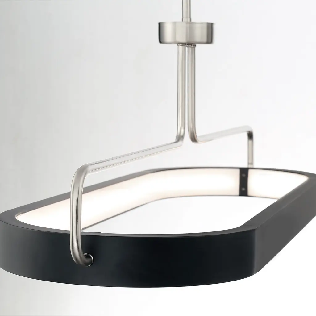 A black ring of LED light is suspended by two satin nickel or gold-finished metal rods on either side. An unconventional approach to a simple concept, this slightly retro yet trendy line features a simplicity that still attracts attention. Integrated LED lighting provides a continuous, seamless source of brilliant illumination.